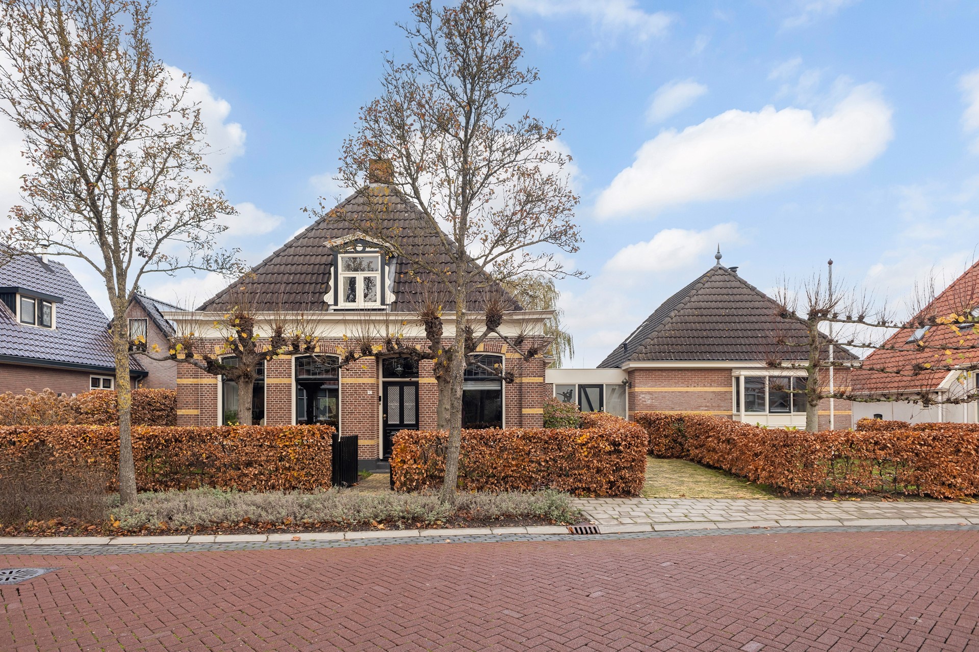 Je komt binnen in de hal, waar je direct merkt dat dit een bijzonder huis is. Aan de rechterzijde bevindt zich de huidige garderobekamer. Leuk detail: dit was vroeger de leefruimte van de huishoudster (de 'faam'), een mooi verhaal dat de rijke historie van de woning onderstreept. De woonkamer is een echte eye-catcher. Dankzij de glas-in-lood ramen, sierlijsten, hoge plafonds met balken en de vele ramen rondom voelt de ruimte licht en stijlvol. Vroeger zaten hier bedstedes; nu vormt het geheel één sfeervolle, open leefruimte. De Tigchelkachel zorgt voor heerlijke warmte en een fijne ambiance. Aan de achterzijde is de woning tijdens de renovatie vergroot, waardoor een prachtige en ruime leefkeuken is ontstaan. De keuken is compleet vernieuwd en uitgevoerd met eiken fronten, een fraai werkblad en een luxe fornuis en inbouwapparatuur. De karakteristieke middenkolom geeft de ruimte extra charme. Dankzij de diverse zitopstellingen en de openslaande deuren naar de tuin is dit echt het hart van het huis. Verder vind je op de begane grond nog het toilet, vaste kastruimte, een berging en toegang tot de kelder.