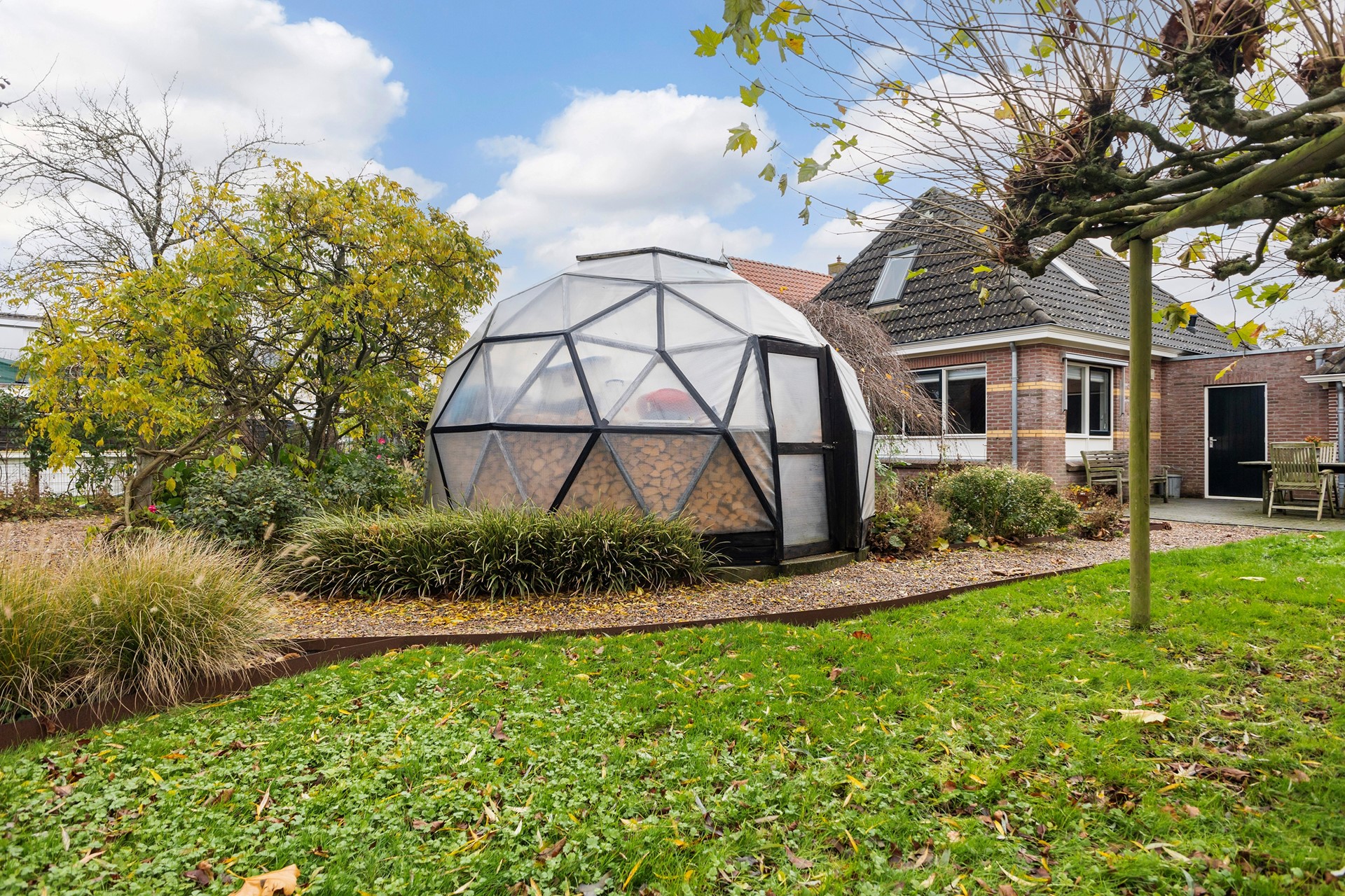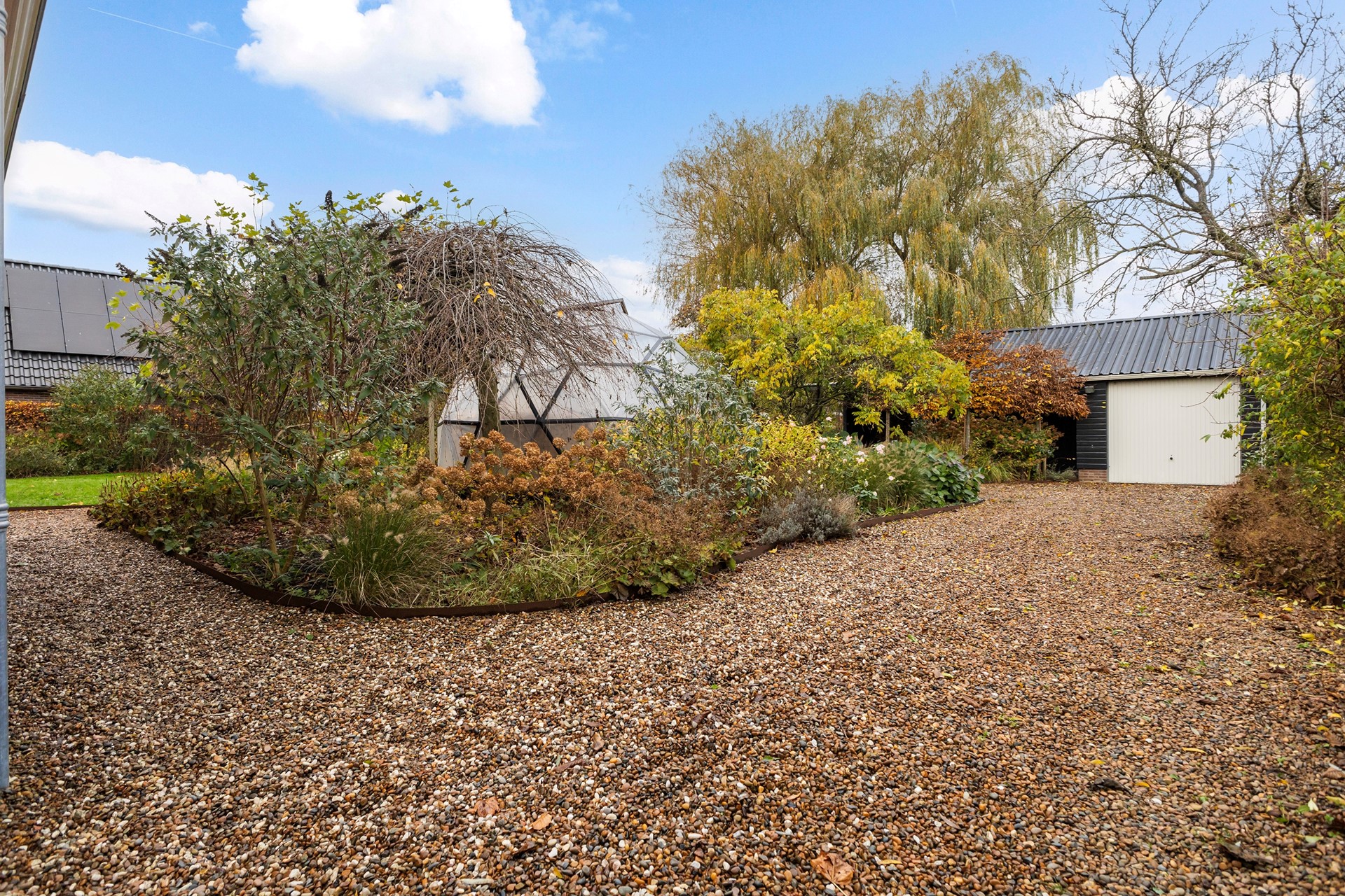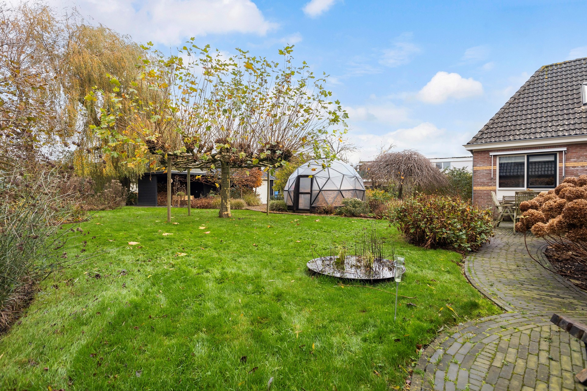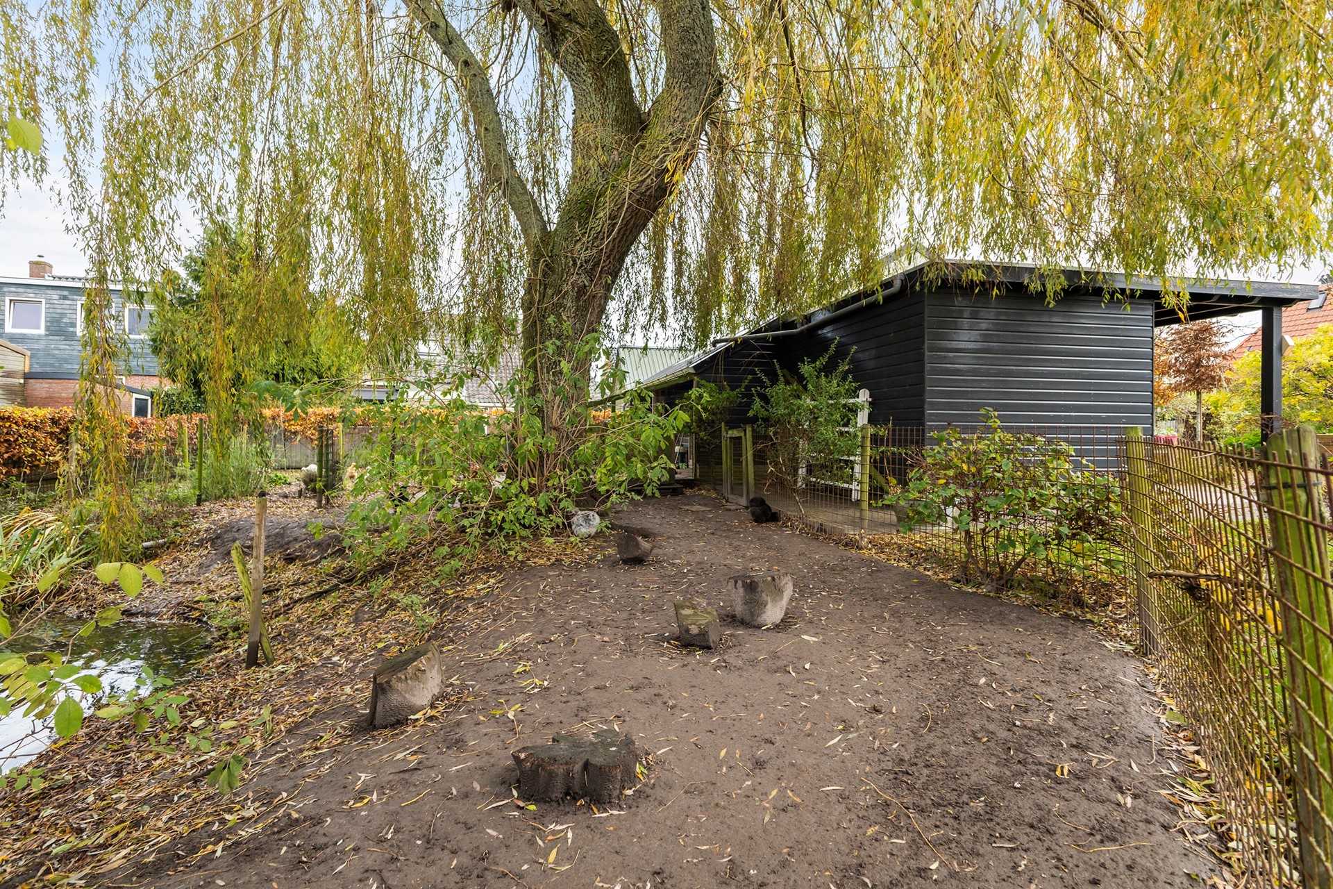 De tuin rondom is een paradijs voor liefhebbers van groen, dieren en rust. De diepe achtertuin is ongeveer vier jaar geleden volledig opnieuw aangelegd, waarbij de bestaande bomen zijn behouden. Je vindt hier diverse fruitbomen, walnootbomen, een moestuin met compostplek, een kippenverblijf (binnen en buiten) die zorgen voor een voedzame bodem, een vijver met vaste bewoners (loopeenden), een (geo)dome (nu gebruikt als houtopslag, maar perfect als unieke buitenzitplek). Door de groene omheining geniet je in de achtertuin van optimale privacy en rust. Achterop het perceel staat de ruime houten schuur met overkapping, ideaal als werkplaats én voor het stallen van een auto. De oprijlaan is breed en biedt volop parkeergelegenheid.