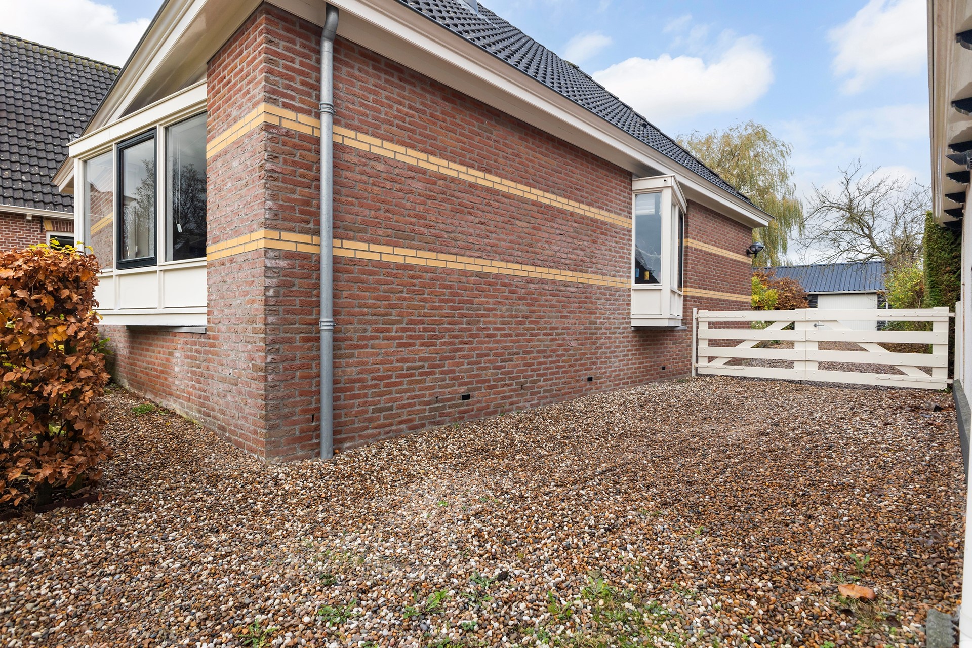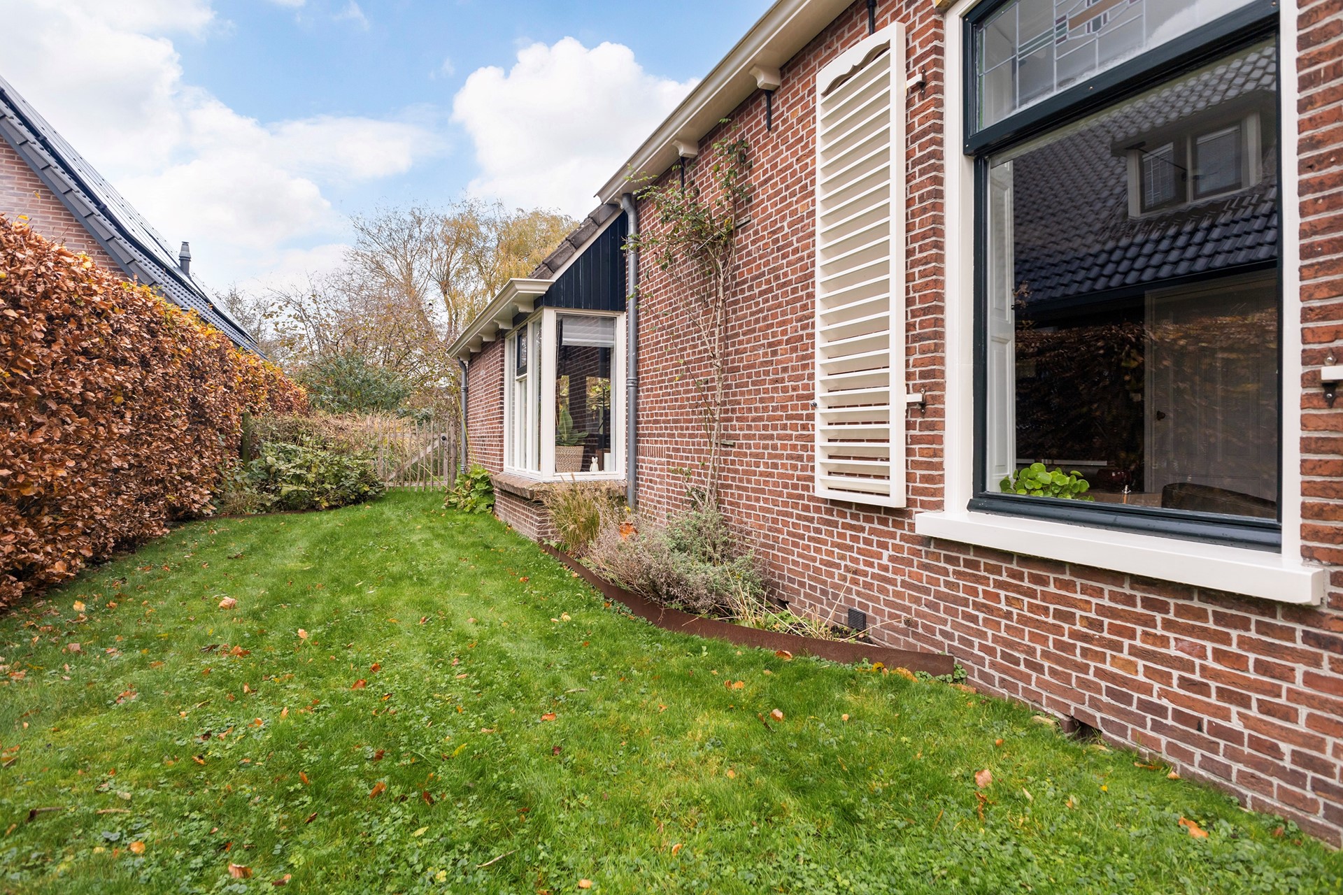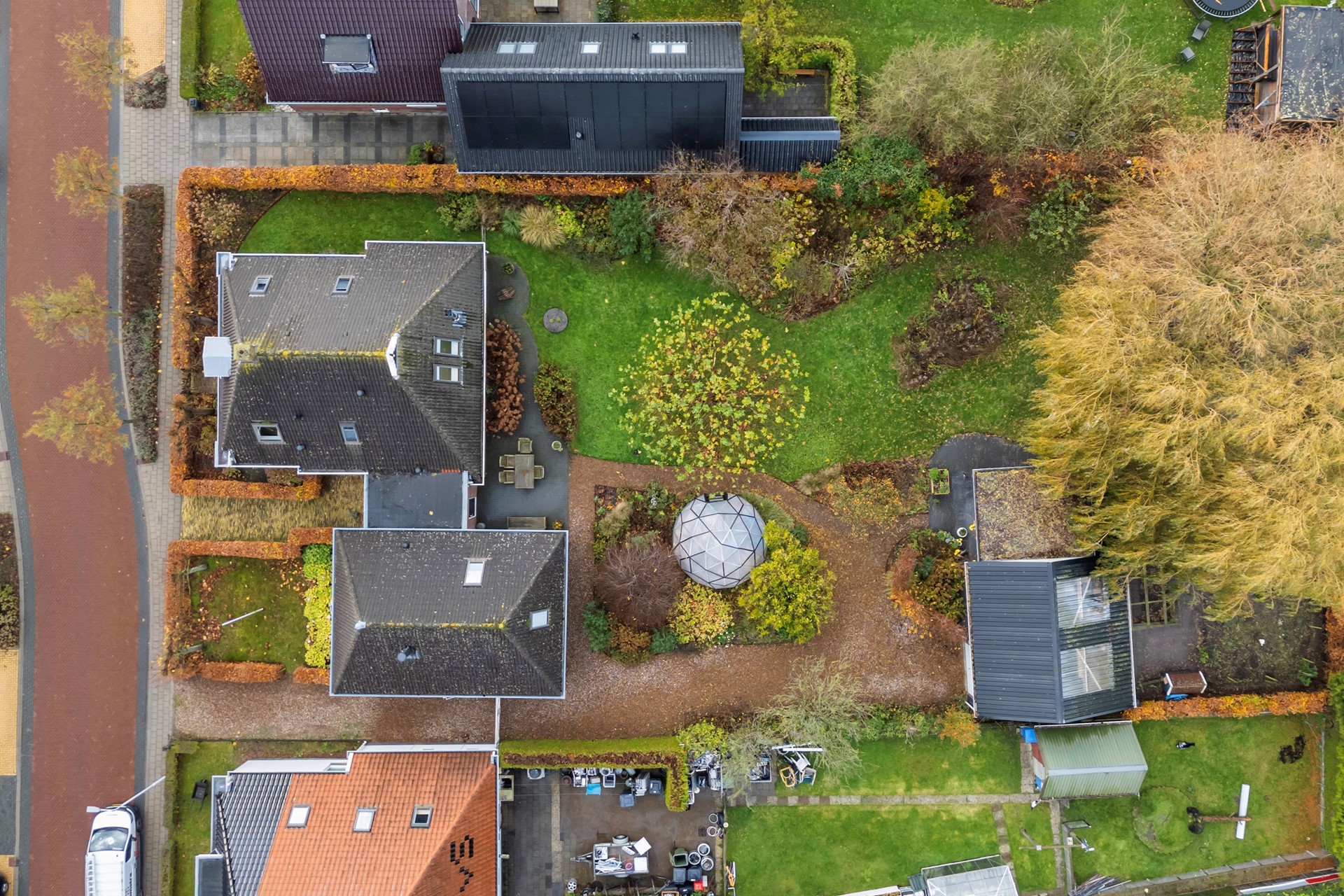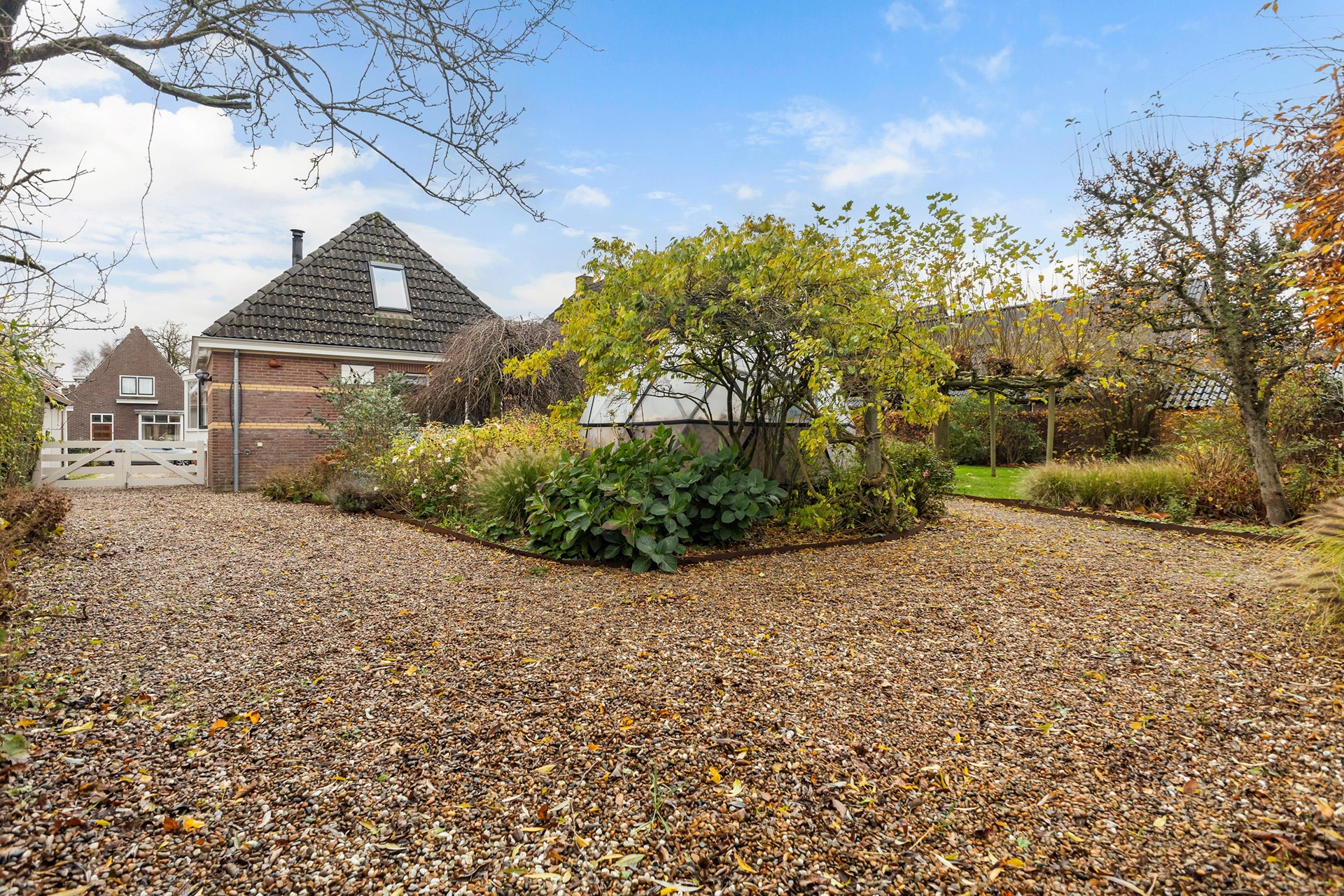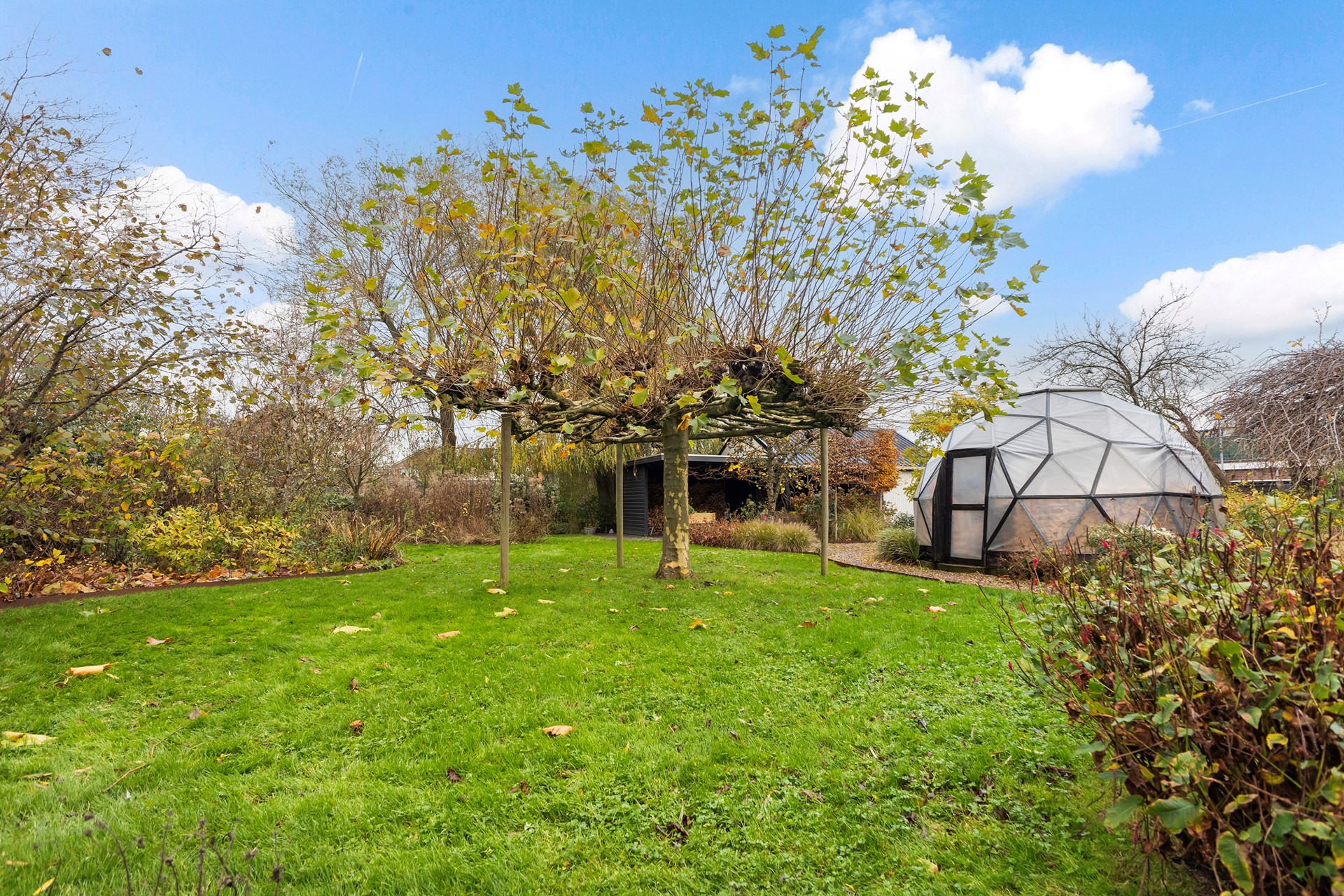 De tuin rondom is een paradijs voor liefhebbers van groen, dieren en rust. De diepe achtertuin is ongeveer vier jaar geleden volledig opnieuw aangelegd, waarbij de bestaande bomen zijn behouden. Je vindt hier diverse fruitbomen, walnootbomen, een moestuin met compostplek, een kippenverblijf (binnen en buiten) die zorgen voor een voedzame bodem, een vijver met vaste bewoners (loopeenden), een (geo)dome (nu gebruikt als houtopslag, maar perfect als unieke buitenzitplek). Door de groene omheining geniet je in de achtertuin van optimale privacy en rust. Achterop het perceel staat de ruime houten schuur met overkapping, ideaal als werkplaats én voor het stallen van een auto. De oprijlaan is breed en biedt volop parkeergelegenheid.