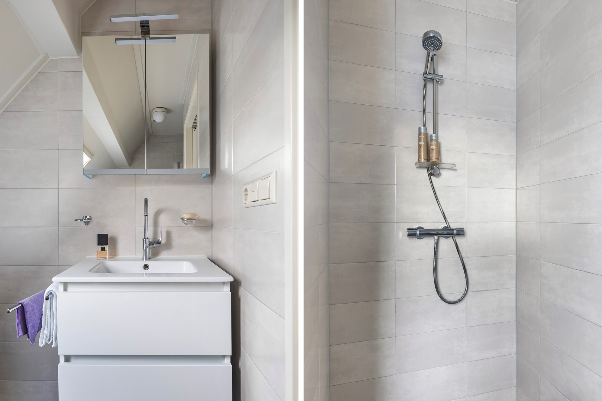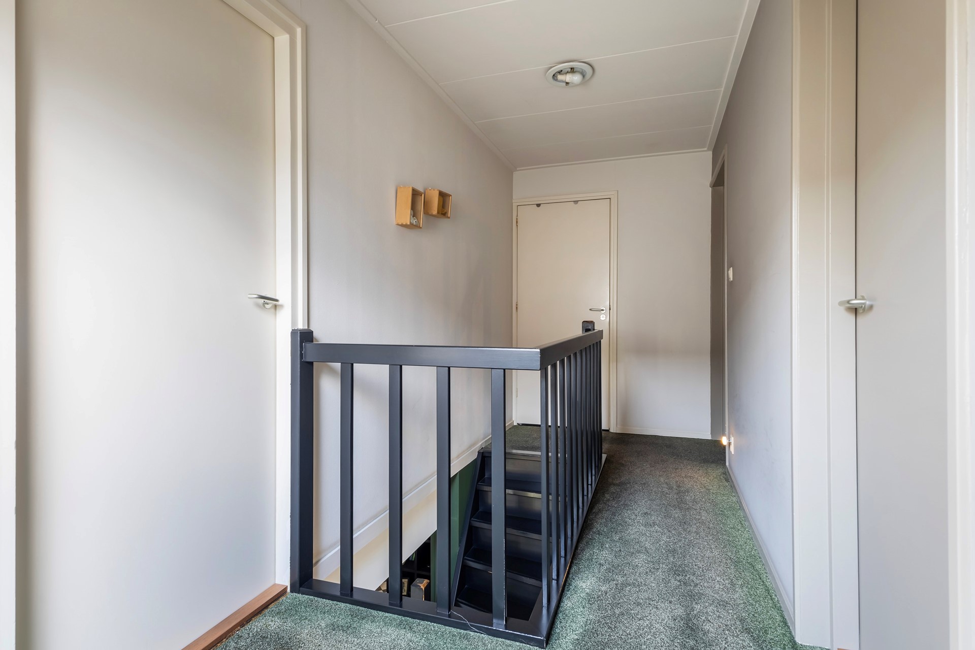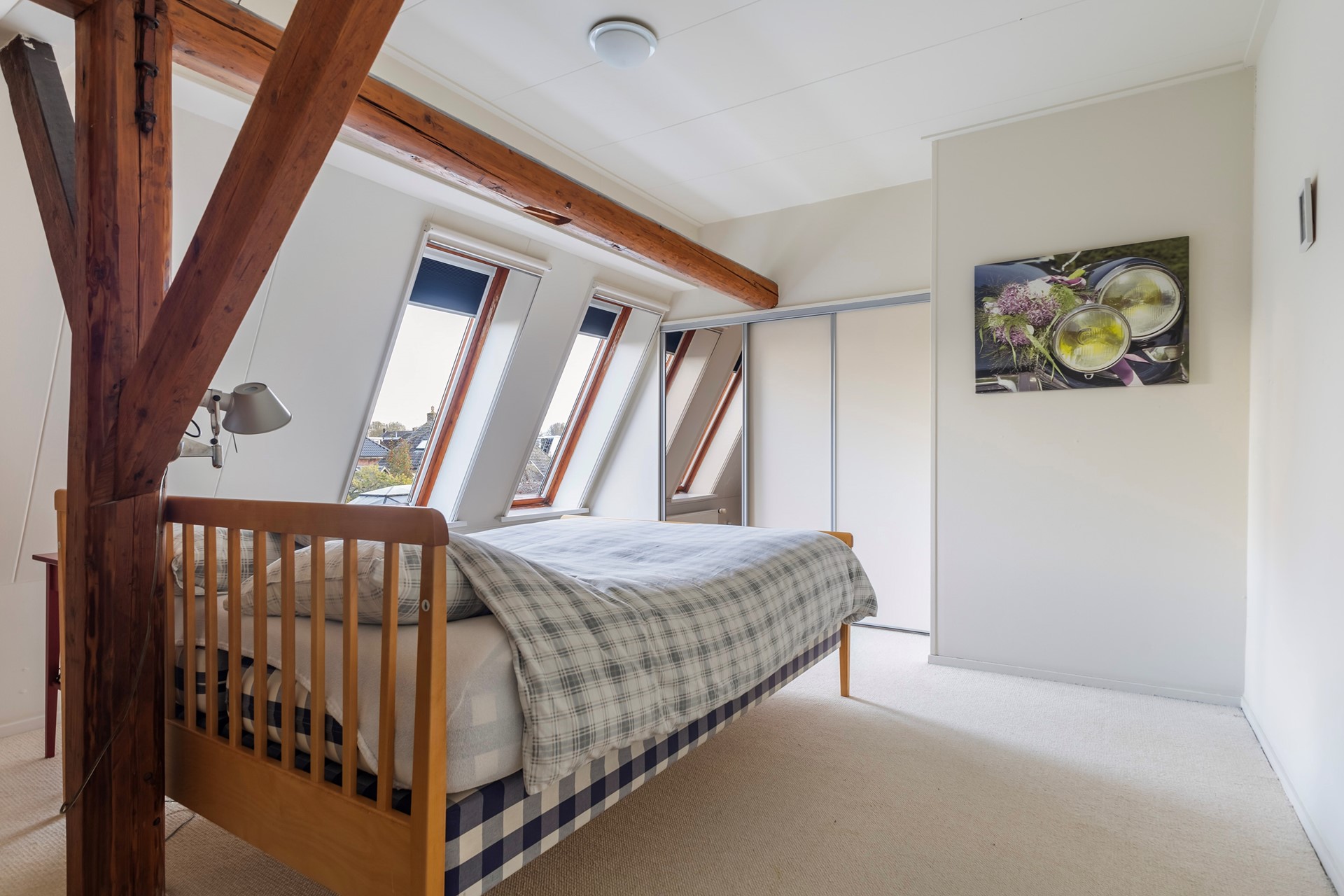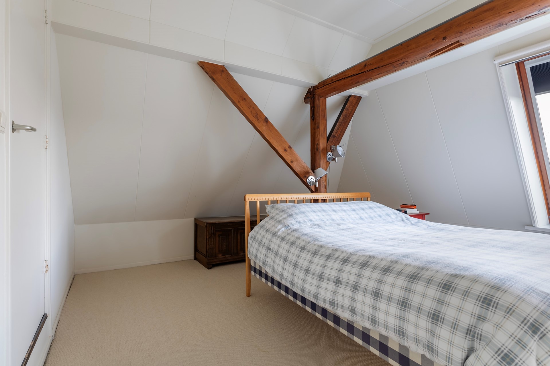 Op de verdieping zijn twee ruime slaapkamers, praktische bergruimtes en de badkamer te vinden. De kamers hebben een prettige lichtinval en veel sfeer dankzij de schuine kap en het zicht op de houten gebinten.