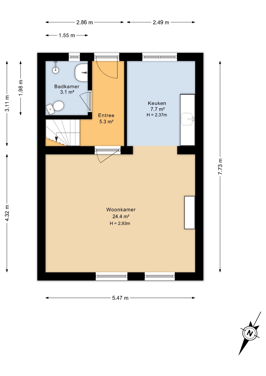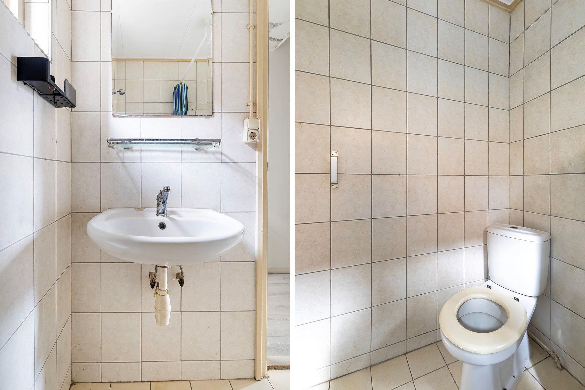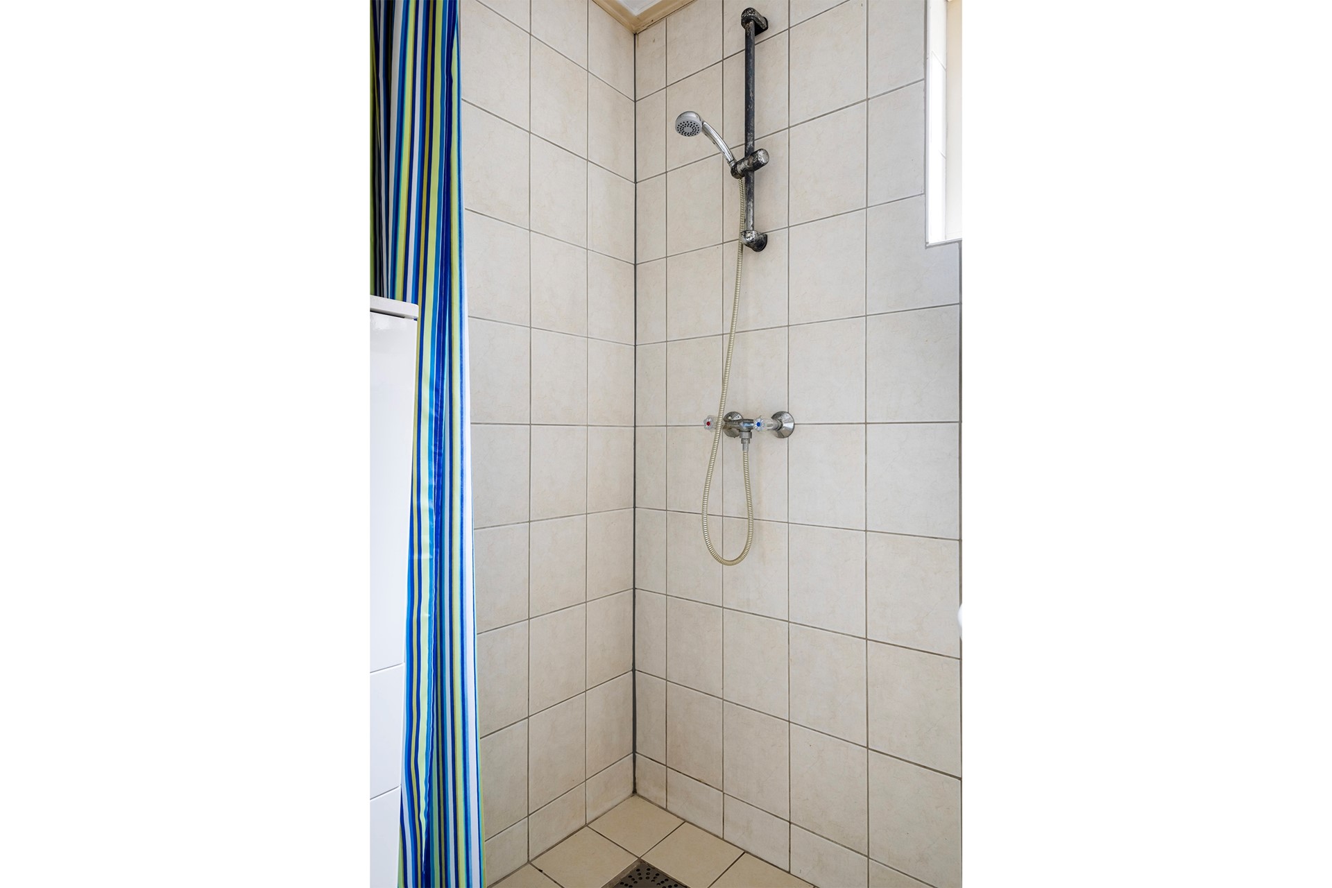 Via de entree kom je binnen in de hal met trapopgang en toegang tot de badkamer en woonkamer. De badkamer is eenvoudig uitgevoerd en voorzien van een douche, toilet en wastafel.
