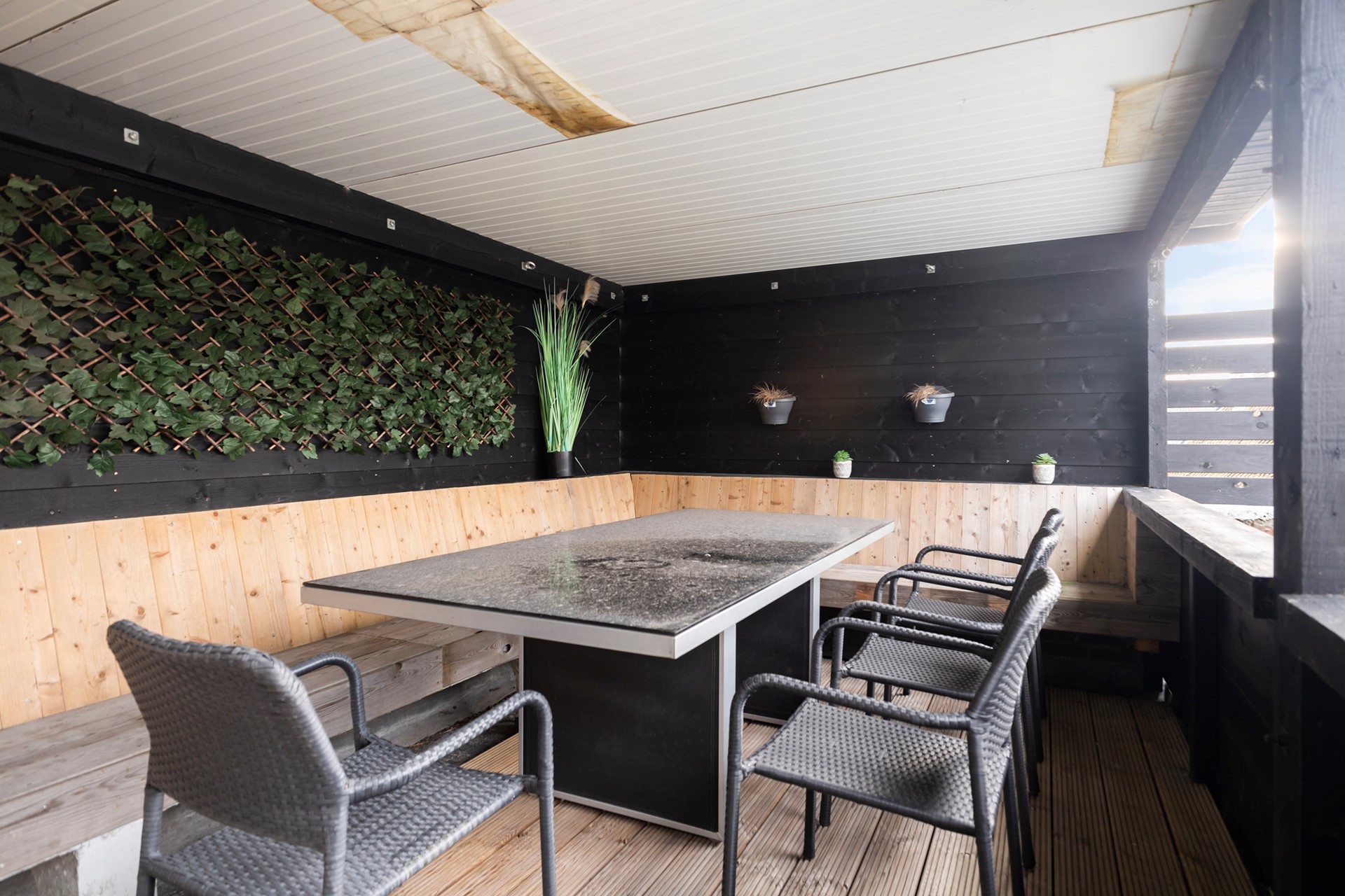 Vanuit de hal met trapopgang en meterkast stap je binnen in een royale gezelschapsruimte / hobbyruimte, ook perfect te omschrijven als een sfeervolle mancave of multifunctionele ontspanningsruimte. Een plek waar je met gemak een grote tafel kwijt kunt voor lange avonden met vrienden, een borrel, spelletjes of het kijken van sportwedstrijden. De ruimte is voorzien van een pelletkachel, wat zorgt voor extra warmte en een gezellige sfeer. Dankzij de praktische indeling en het aanwezige keukenblok is deze ruimte ook uitermate geschikt als atelier of zelfs als extra werkruimte aan huis. Een verrassende en veelzijdige toevoeging aan de woning die wonen en ontspannen moeiteloos combineert.