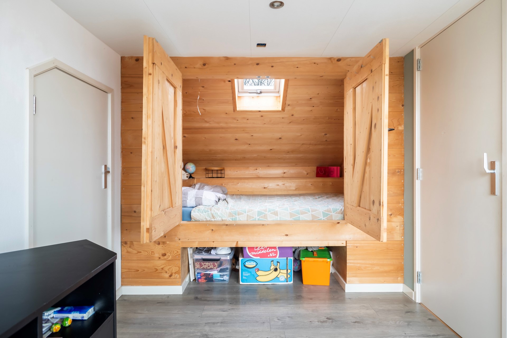 De tweede verdieping beschikt over twee slaapkamers en is daarmee een volwaardige woonlaag met verrassend veel ruimte en lichtinval. De grootste slaapkamer heeft een royaal formaat van ca. 21,9 m² en biedt volop mogelijkheden voor een ruime slaapkamerinrichting, eventueel gecombineerd met een werk- of zithoek. Dankzij de dakkapellen aan de achterzijde ontstaat hier extra stahoogte en een prettige rechte wand, wat de ruimte optimaal bruikbaar maakt. De tweede slaapkamer is ca. 12,6 m² groot en eveneens goed in te richten. Deze kamer beschikt bovendien over een bedstee, wat zorgt voor een speels en karakteristiek element met extra slaap- of bergruimte. Aan de voorzijde zorgen meerdere dakramen/vensters voor aangenaam daglicht op de verdieping. Daarnaast is er een aparte berging (circa 7,6 m²) aanwezig, ideaal voor opslag. Kortom: een verrassend ruime en lichte verdieping met twee volwaardige slaapkamers en praktische extra bergruimte.
