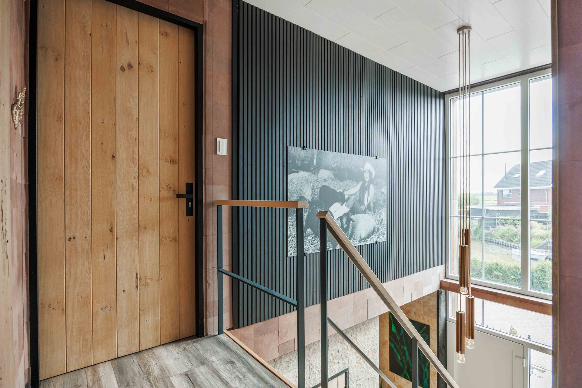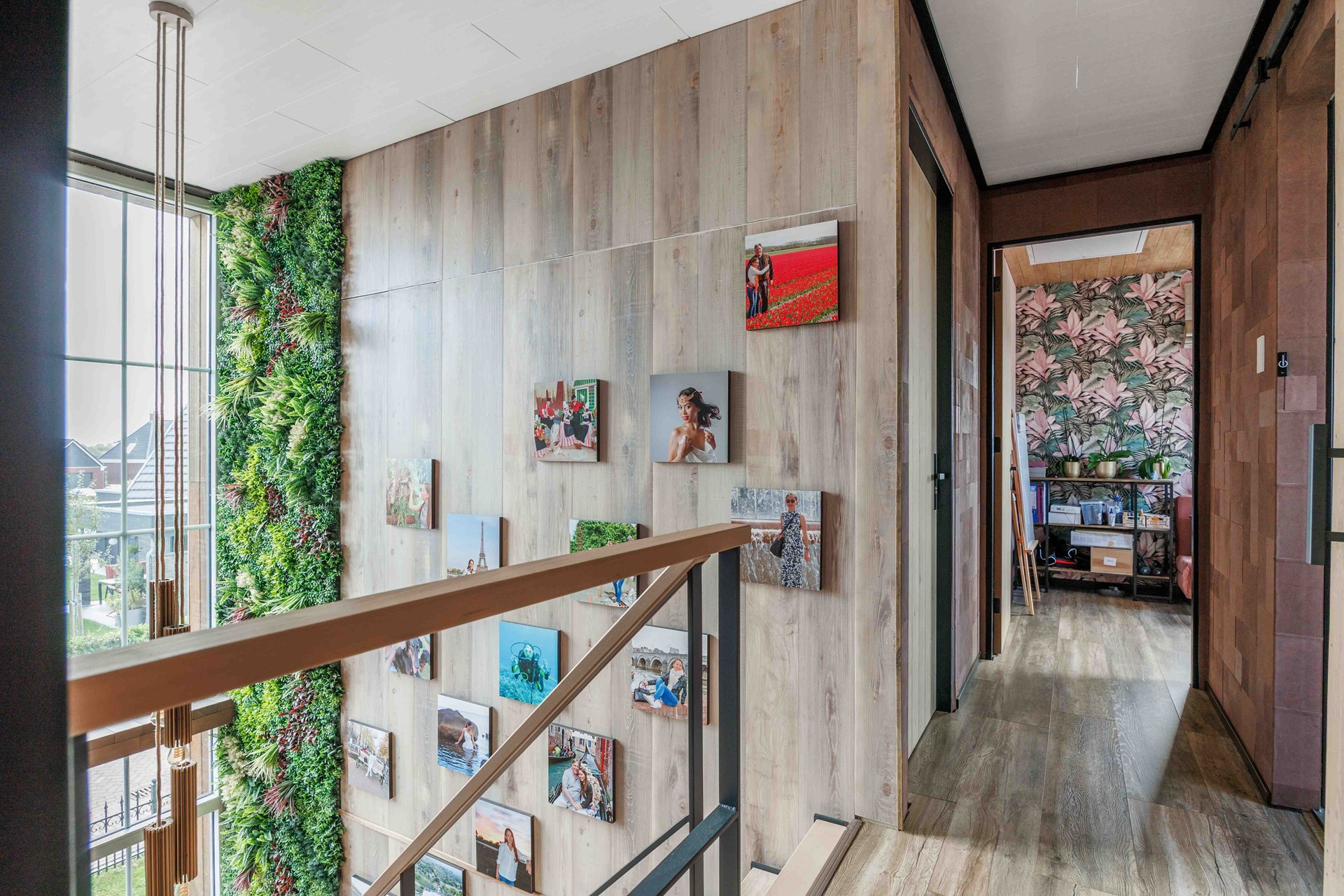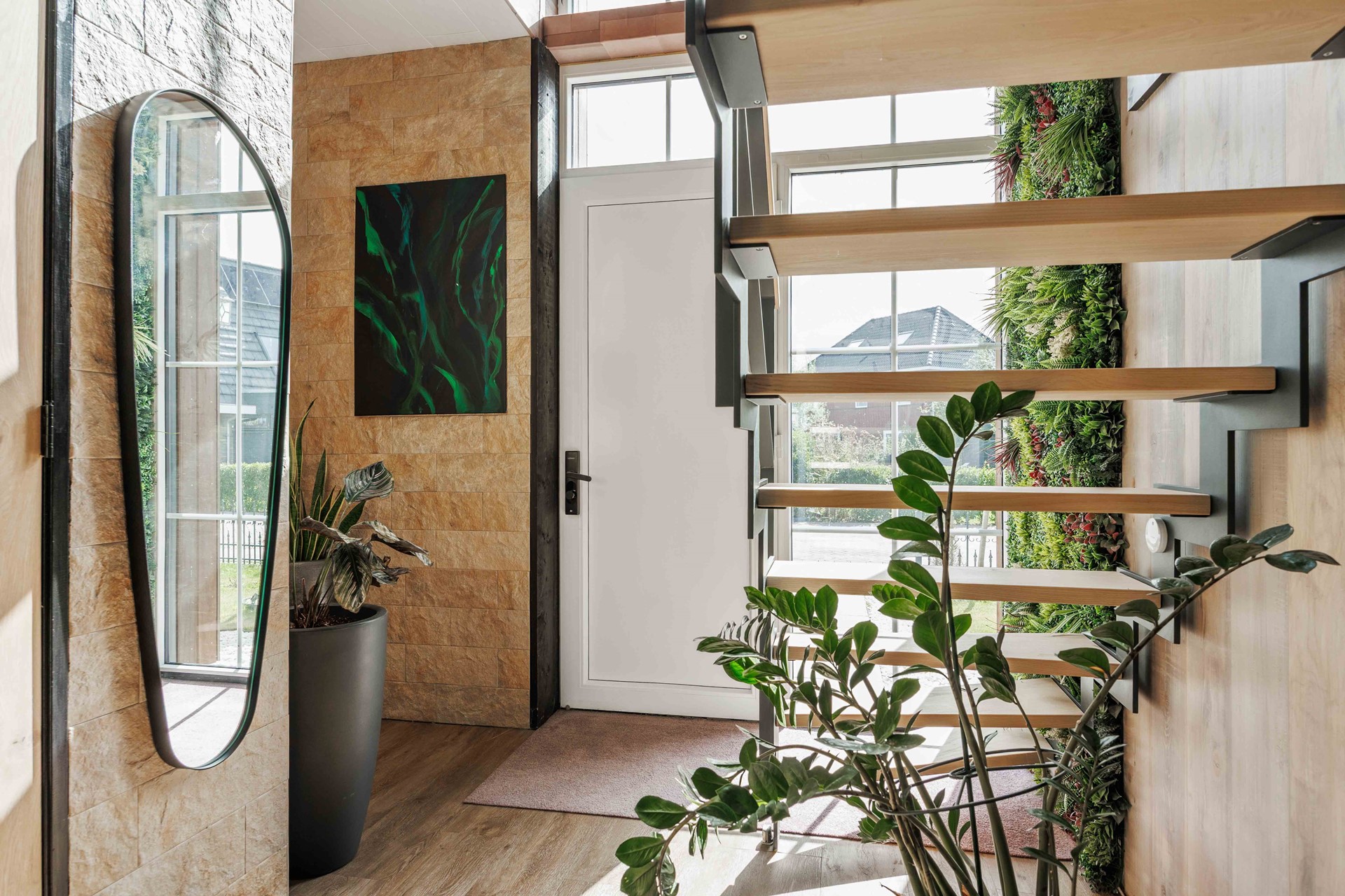 Bij binnenkomst word je direct verrast door de indrukwekkende hal met vide en een royale raampartij die zorgt voor een zee aan licht. De moderne open trap met strak stalen frame en houten treden vormt een echte eyecatcher. Het groenaccent met een prachtige verticale plantenwand geeft de hal een levendige en natuurlijke uitstraling. De houten wandafwerking, persoonlijke fotogalerij en stijlvolle verlichting maken dit tot een warme en unieke entree. Hier voel je meteen dat je een bijzonder huis binnenstapt! In de hal bevinden zich een toilet, meterkast en garderobe. Rechts aan de zijkant bevindt zich een praktische bijkeuken, ideaal voor extra opslag en plek voor de witgoedopstelling. Vanuit de hal geeft de eigentijdse stalen deur toegang tot de woonkamer. Hoewel de ruimtes hier naadloos in elkaar overlopen, heeft elk deel van de leefruimte een eigen karakter.