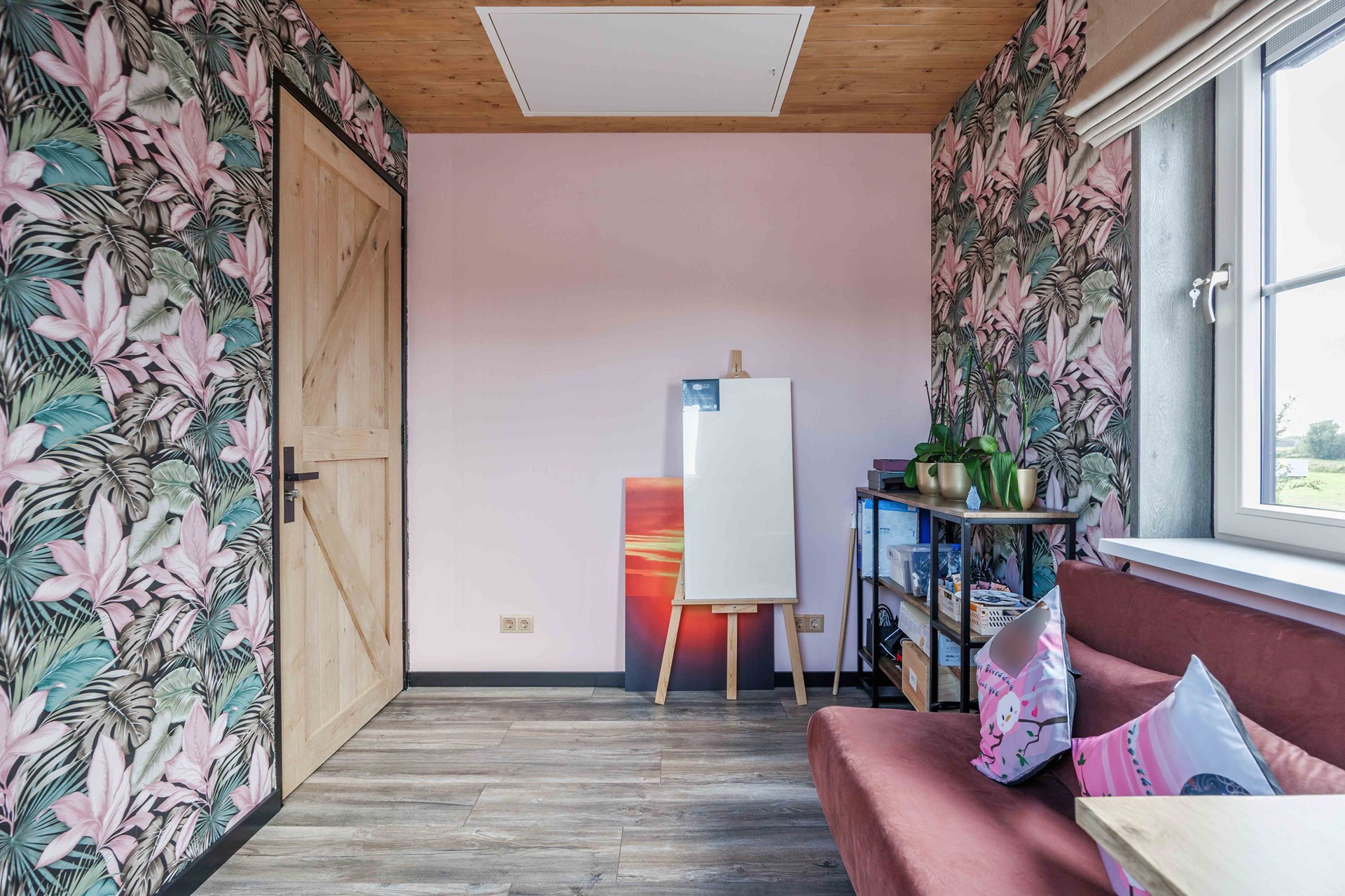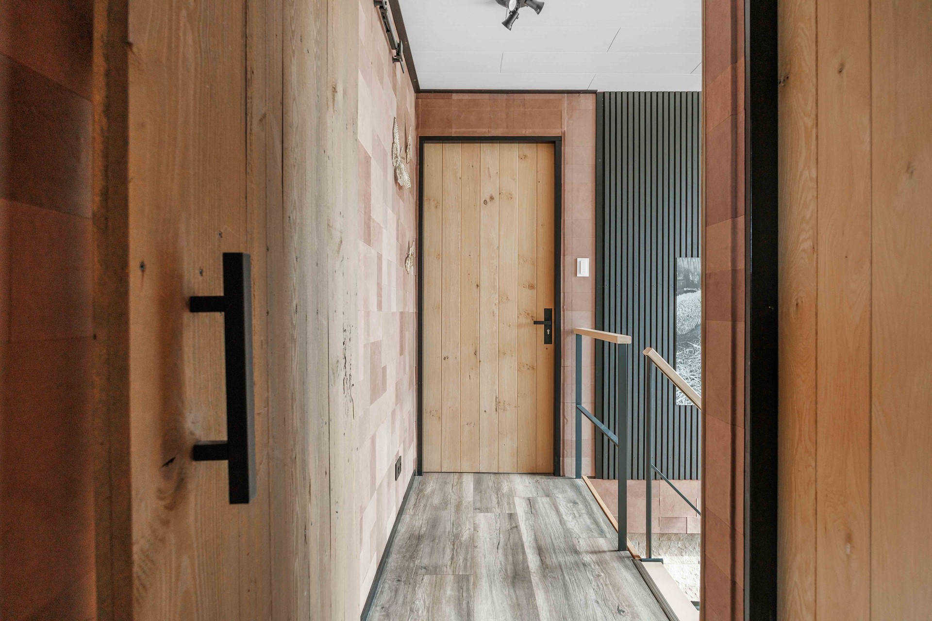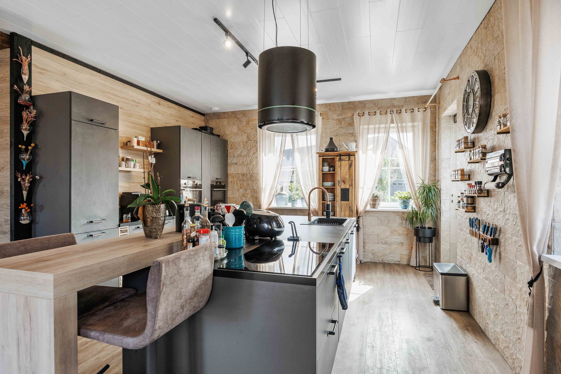 Bij binnenkomst word je direct verrast door de indrukwekkende hal met vide en een royale raampartij die zorgt voor een zee aan licht. De moderne open trap met strak stalen frame en houten treden vormt een echte eyecatcher. Het groenaccent met een prachtige verticale plantenwand geeft de hal een levendige en natuurlijke uitstraling. De houten wandafwerking, persoonlijke fotogalerij en stijlvolle verlichting maken dit tot een warme en unieke entree. Hier voel je meteen dat je een bijzonder huis binnenstapt! In de hal bevinden zich een toilet, meterkast en garderobe. Rechts aan de zijkant bevindt zich een praktische bijkeuken, ideaal voor extra opslag en plek voor de witgoedopstelling. Vanuit de hal geeft de eigentijdse stalen deur toegang tot de woonkamer. Hoewel de ruimtes hier naadloos in elkaar overlopen, heeft elk deel van de leefruimte een eigen karakter.