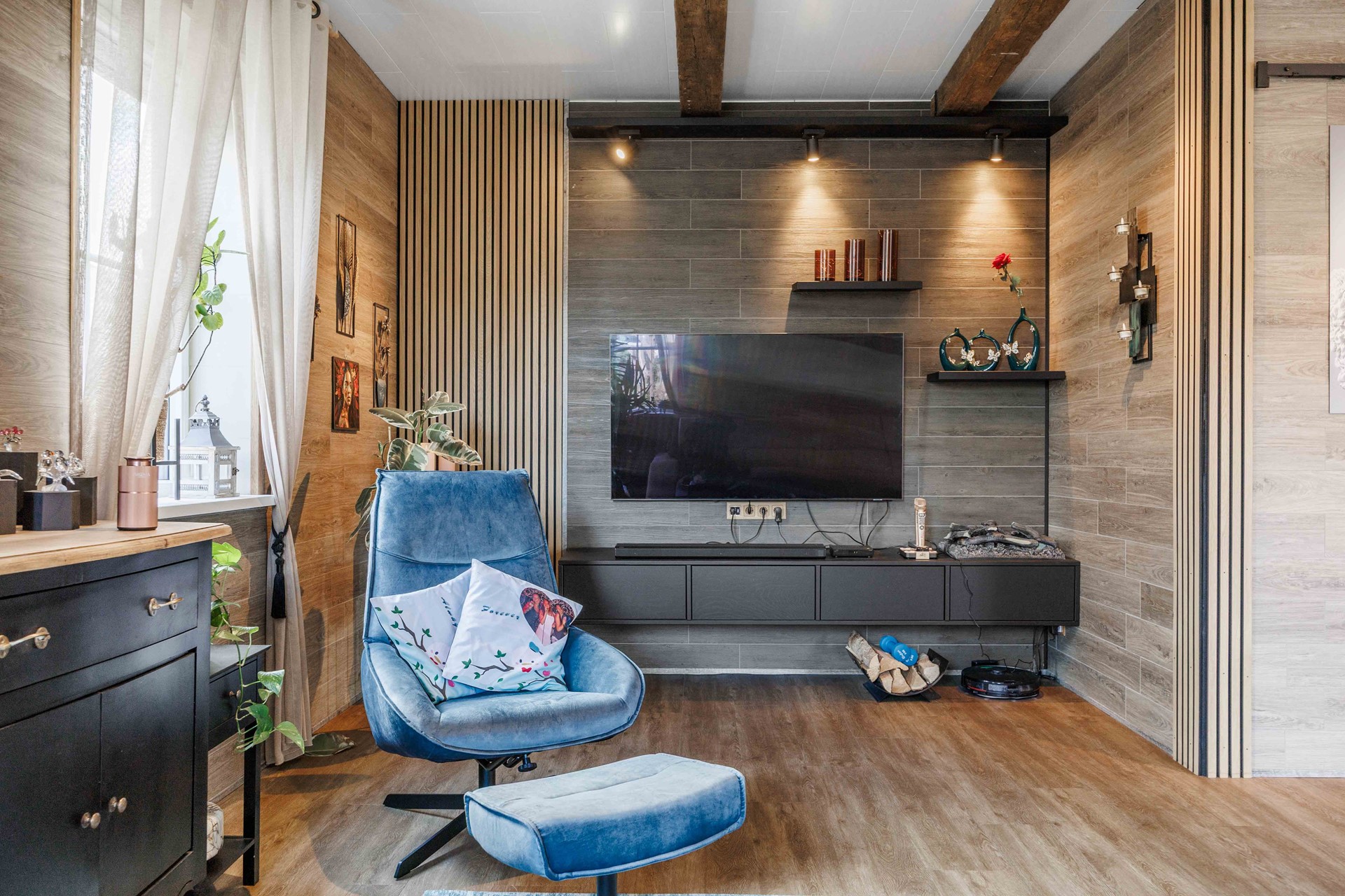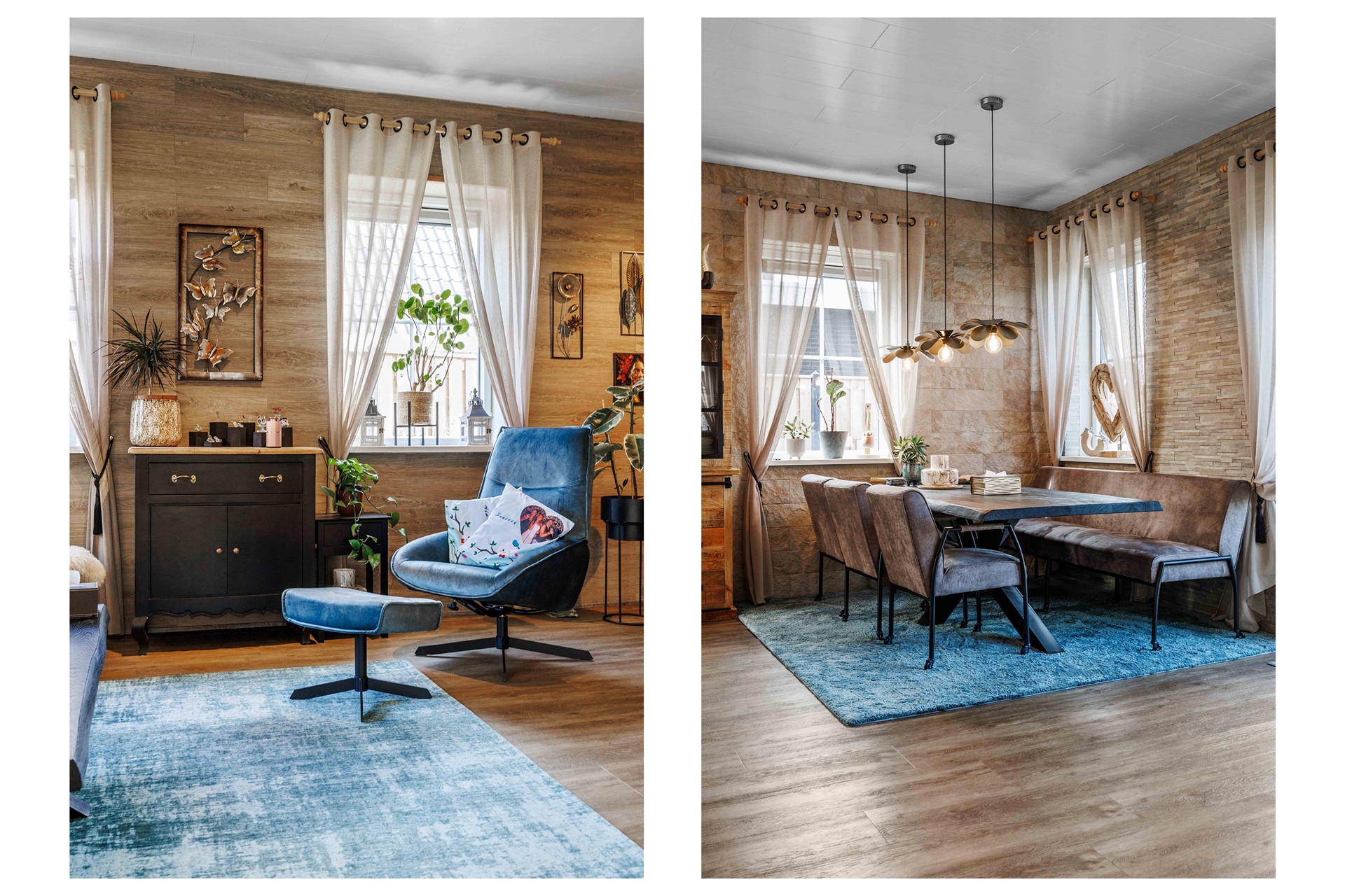 De indrukwekkende living straalt warmte en karakter uit dankzij een robuuste houten balkenplafond met stijlvolle inbouwspots die voor een prettige verlichting zorgen. Het plafond is strak en licht afgewerkt, waardoor de ruimte een mooie balans heeft tussen modern en rustiek. De wanden zijn deels voorzien van een natuursteenlook en PVC bekleding, wat een speelse en natuurlijke uitstraling geeft. Met de ruime indeling is er volop plek voor een knusse zithoek of een plek om te lezen of tv te kijken.