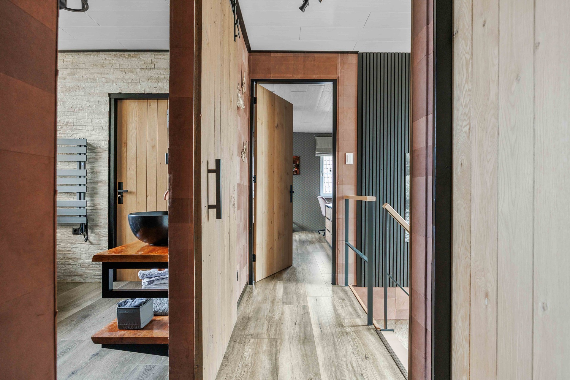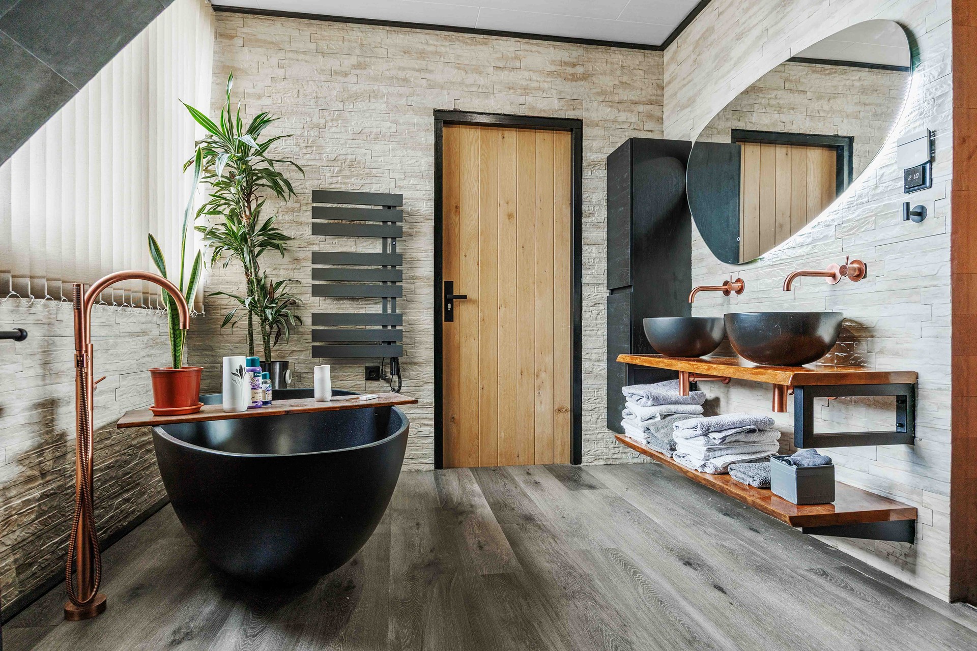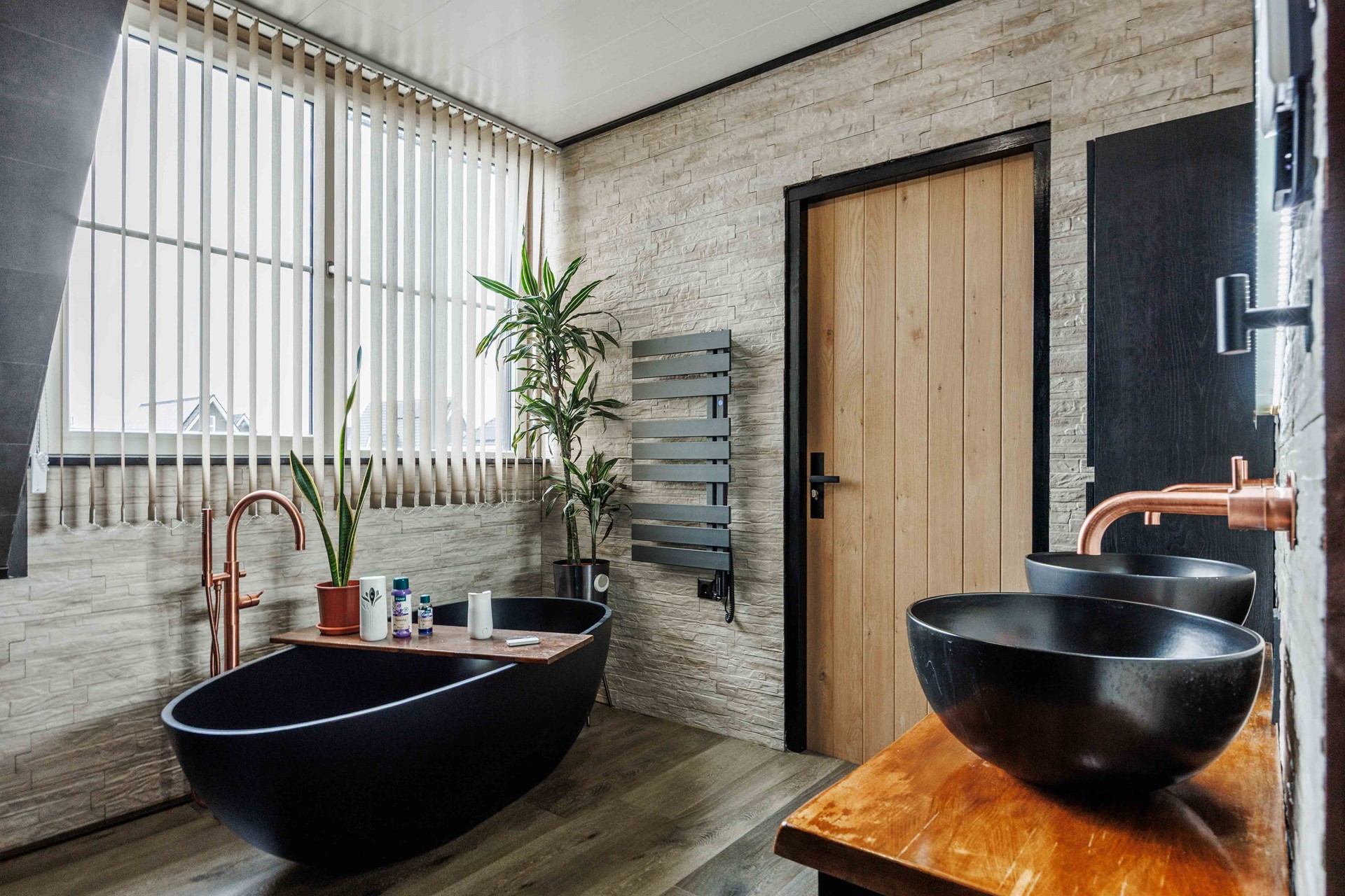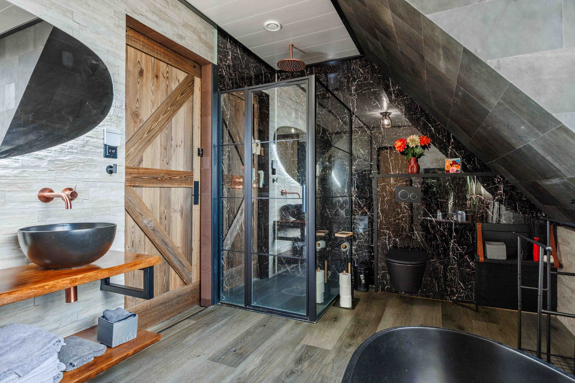 De luxe badkamer combineert moderne elegantie met stoere materialen. Direct in het oog springt de fraaie massieve houten schuifdeur, die perfect past bij de stijl van de woning. De ruimte is voorzien van een stijlvol vrijstaand ligbad, uitgevoerd in matzwart met een koperkleurige staande kraan, ideaal voor een ontspannen avond. Het dubbele wastafelmeubel met natuurstenen waskommen en bijpassende koperkleurige kranen zorgt niet alleen voor luxe, maar ook voor praktisch gemak. Daarnaast vind je hier een toilet en een ruime inloopdouche met regendouche, glazen deur en donkere marmerlook wandpanelen die de ruimte een chique uitstraling geven.