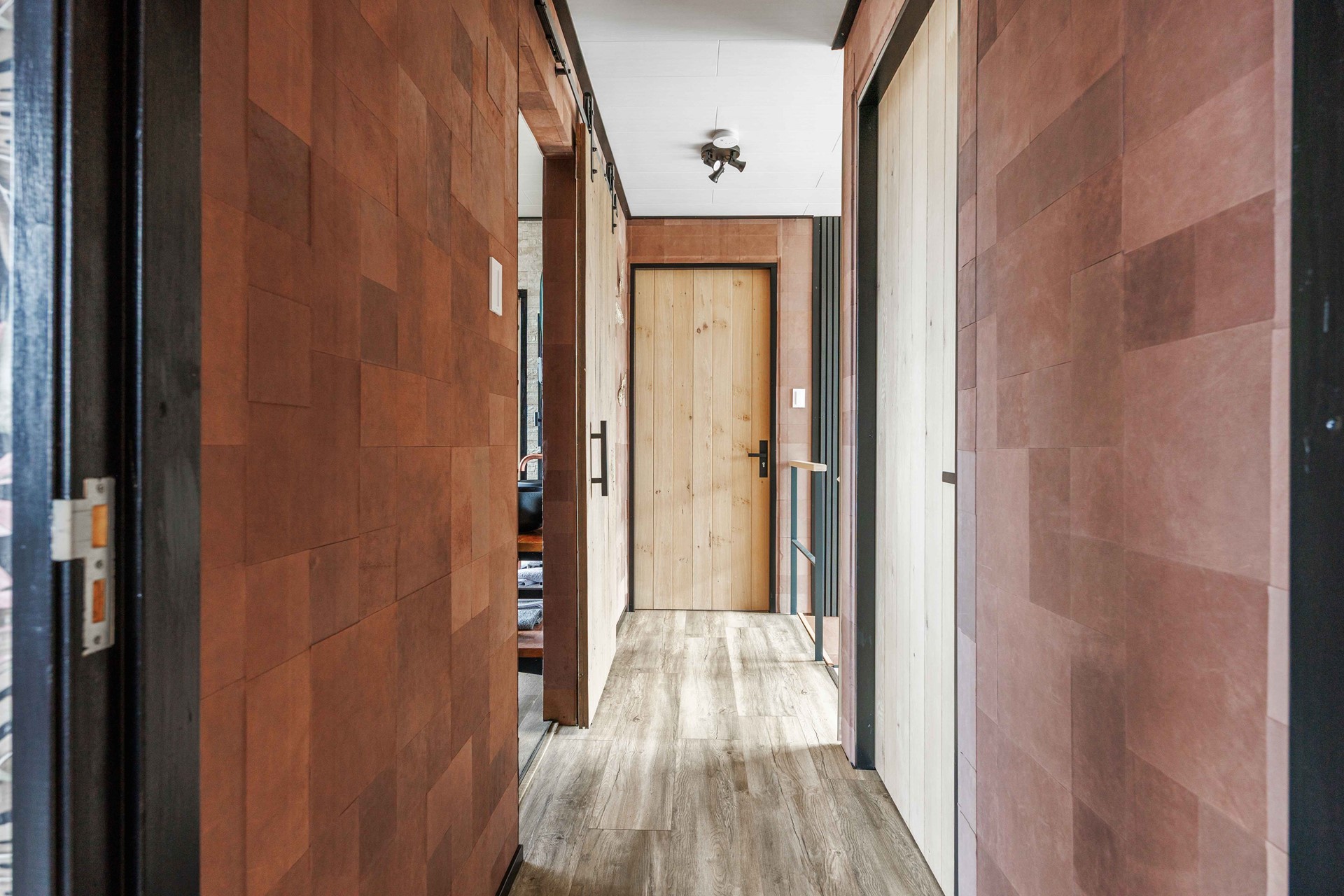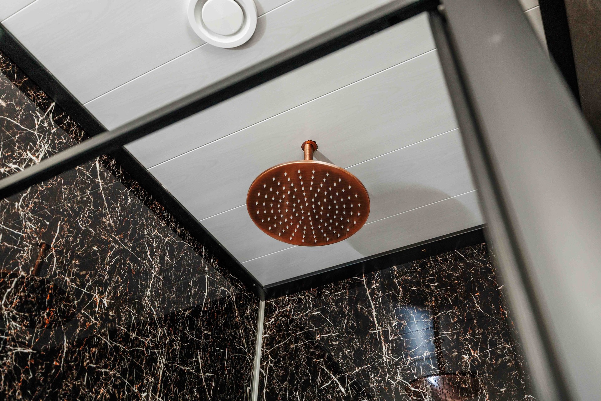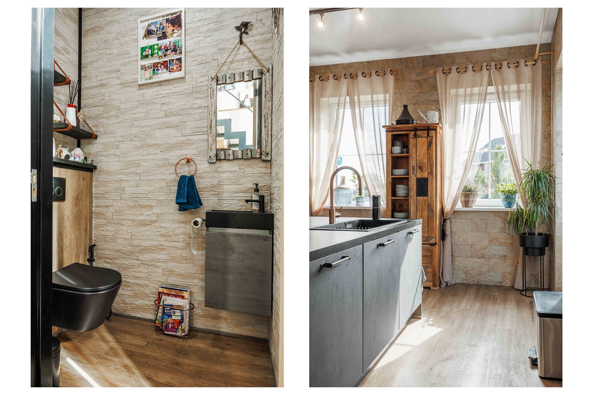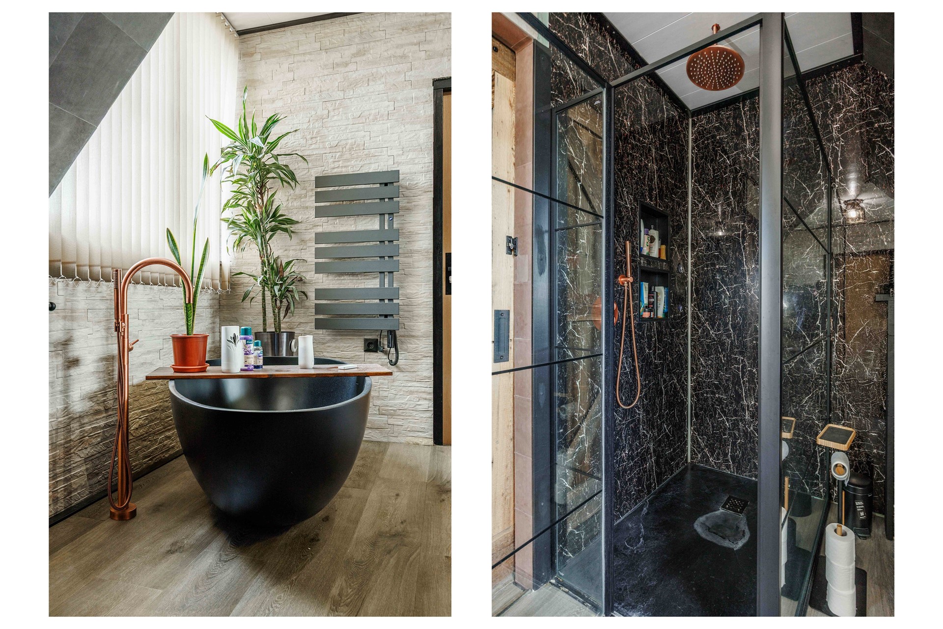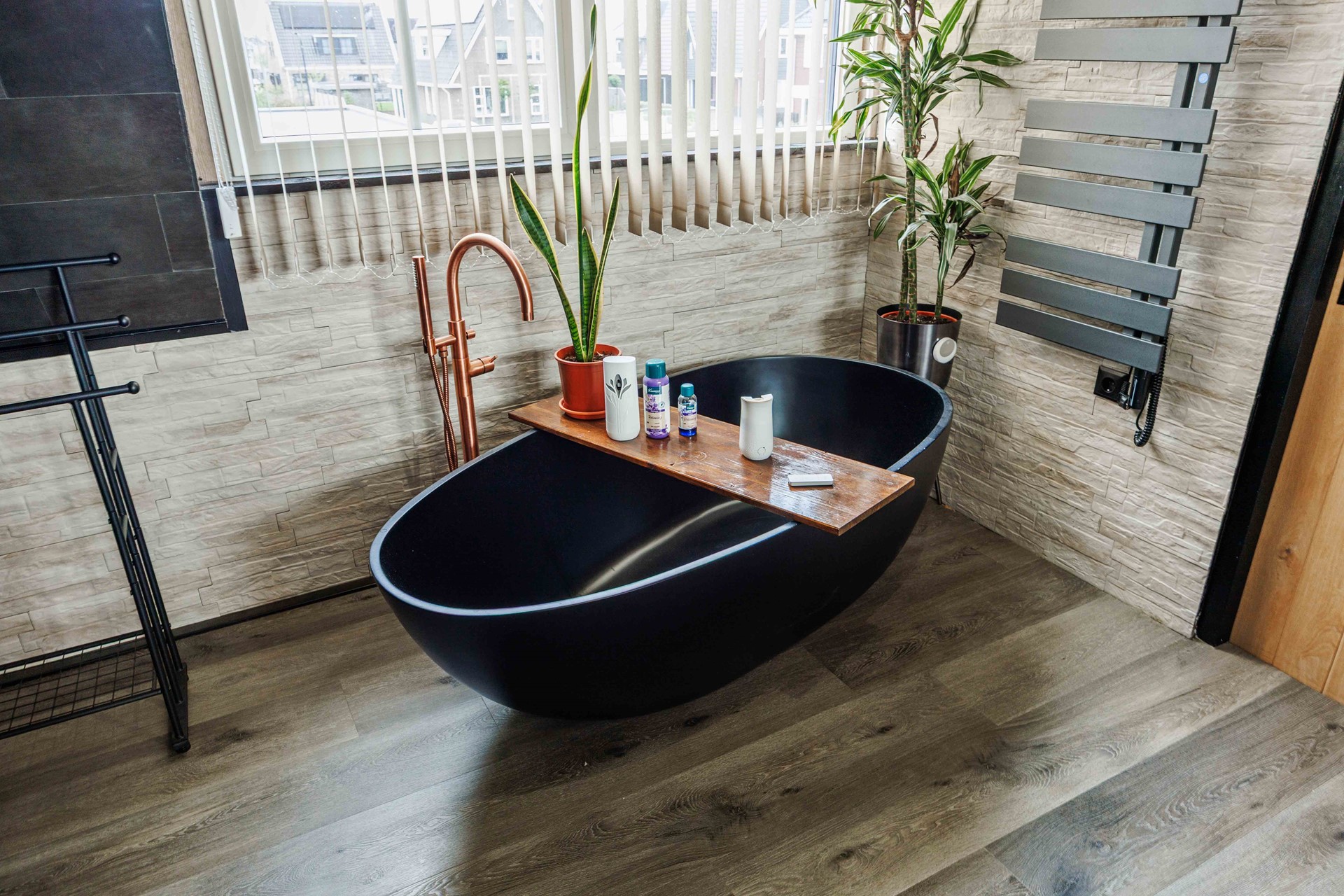 De luxe badkamer combineert moderne elegantie met stoere materialen. Direct in het oog springt de fraaie massieve houten schuifdeur, die perfect past bij de stijl van de woning. De ruimte is voorzien van een stijlvol vrijstaand ligbad, uitgevoerd in matzwart met een koperkleurige staande kraan, ideaal voor een ontspannen avond. Het dubbele wastafelmeubel met natuurstenen waskommen en bijpassende koperkleurige kranen zorgt niet alleen voor luxe, maar ook voor praktisch gemak. Daarnaast vind je hier een toilet en een ruime inloopdouche met regendouche, glazen deur en donkere marmerlook wandpanelen die de ruimte een chique uitstraling geven.