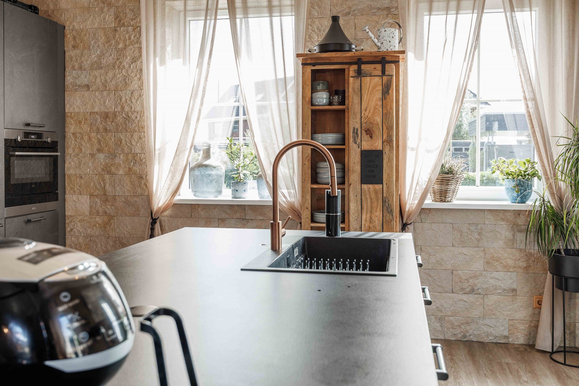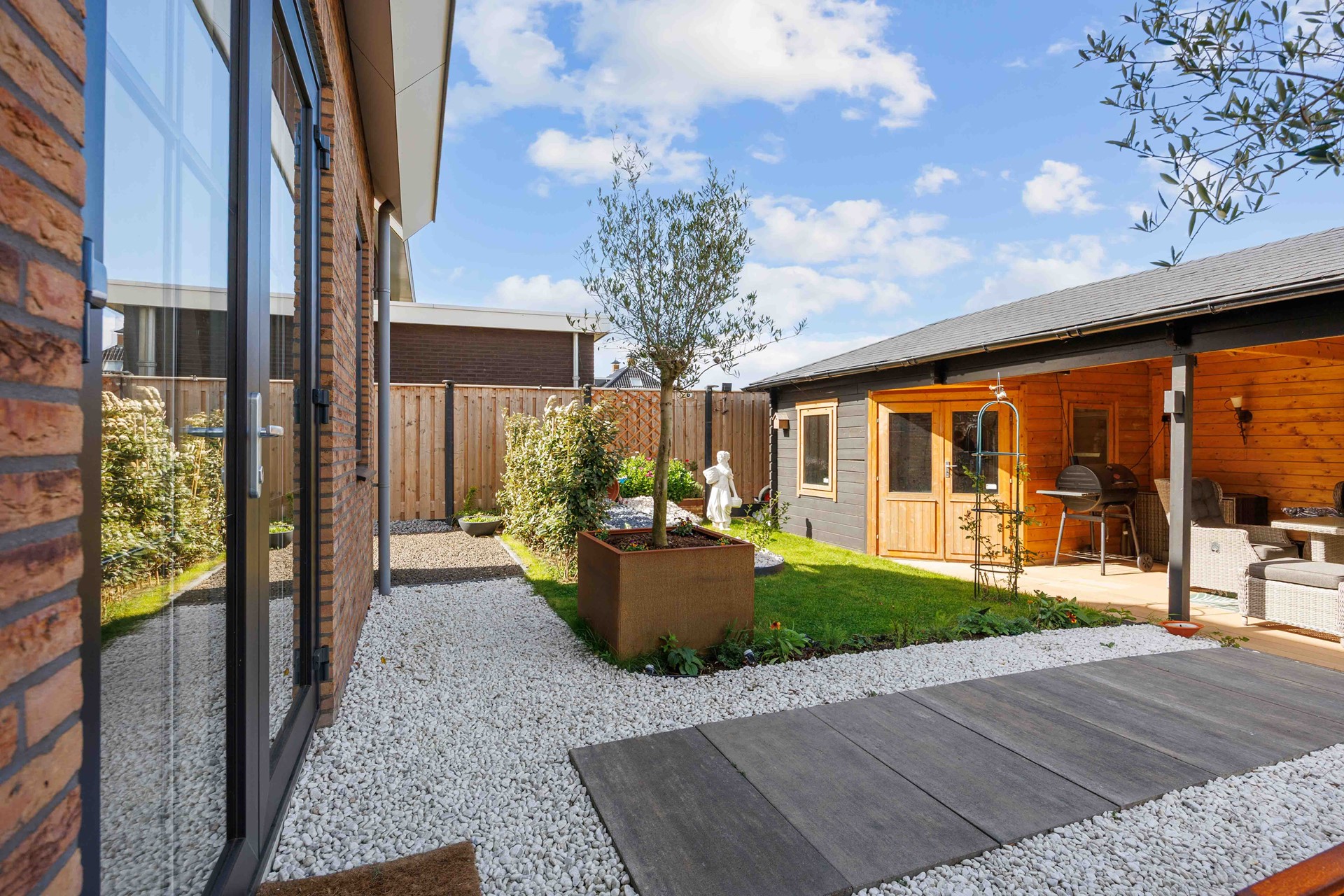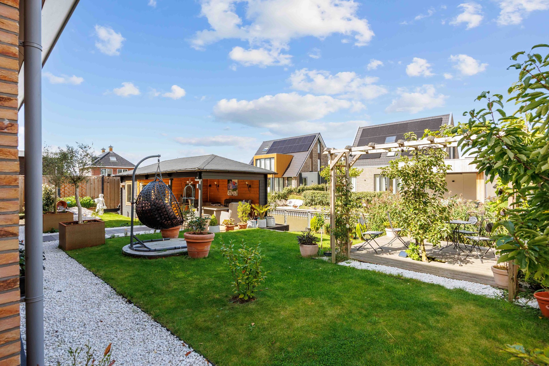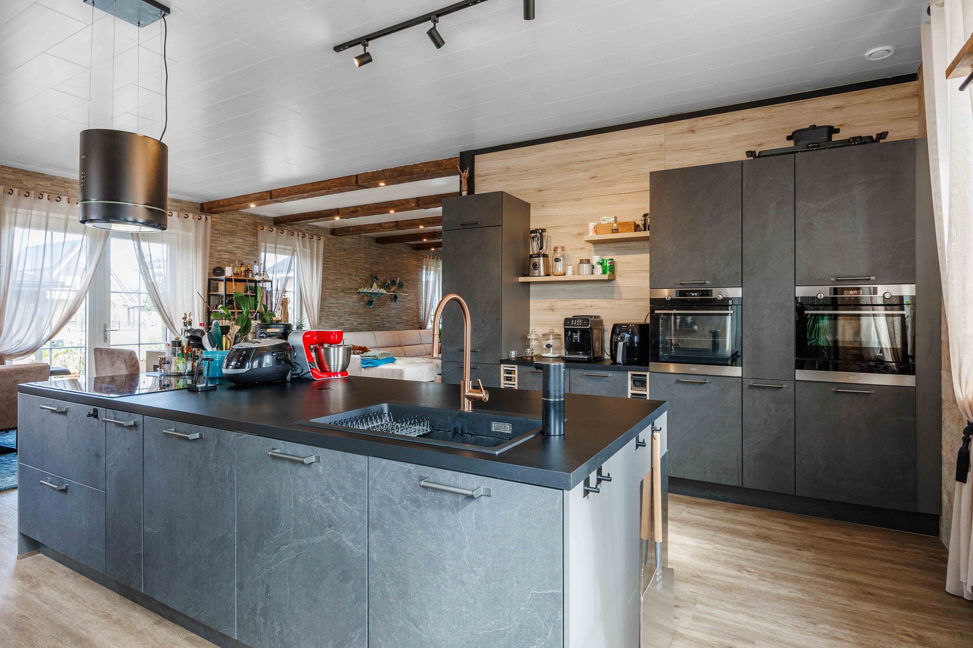 De luxe open keuken is het hart van de woning en is uitgevoerd met een stijlvol kookeiland, hoogwaardige inbouwapparatuur en veel opbergruimte. Het geheel vormt een eigentijdse leefruimte waar koken, gezelligheid en modern design samenkomen. Via de openslaande tuindeuren bereik je eenvoudig de achtertuin, waardoor binnen en buiten op een natuurlijke manier met elkaar verbonden zijn.