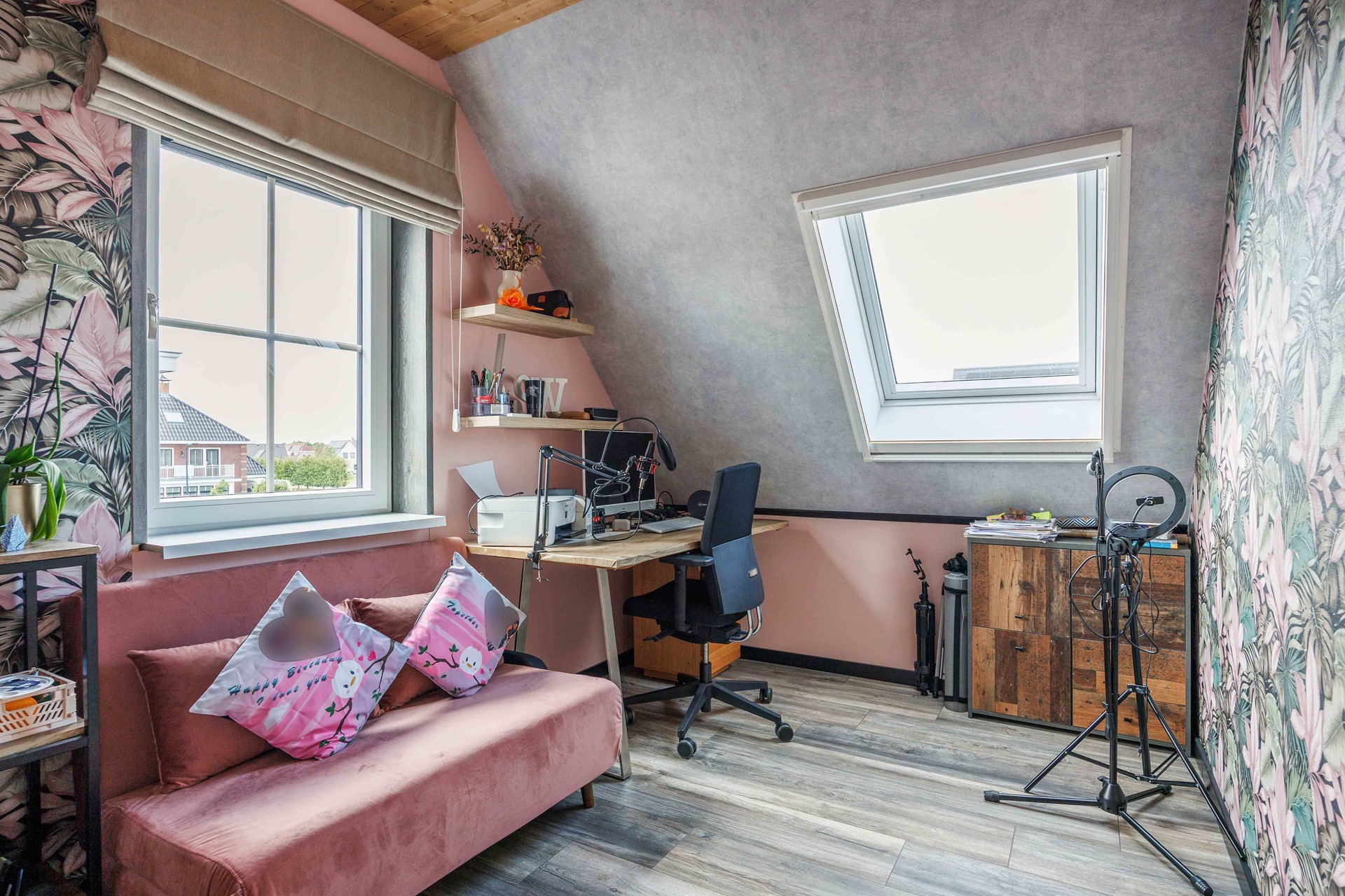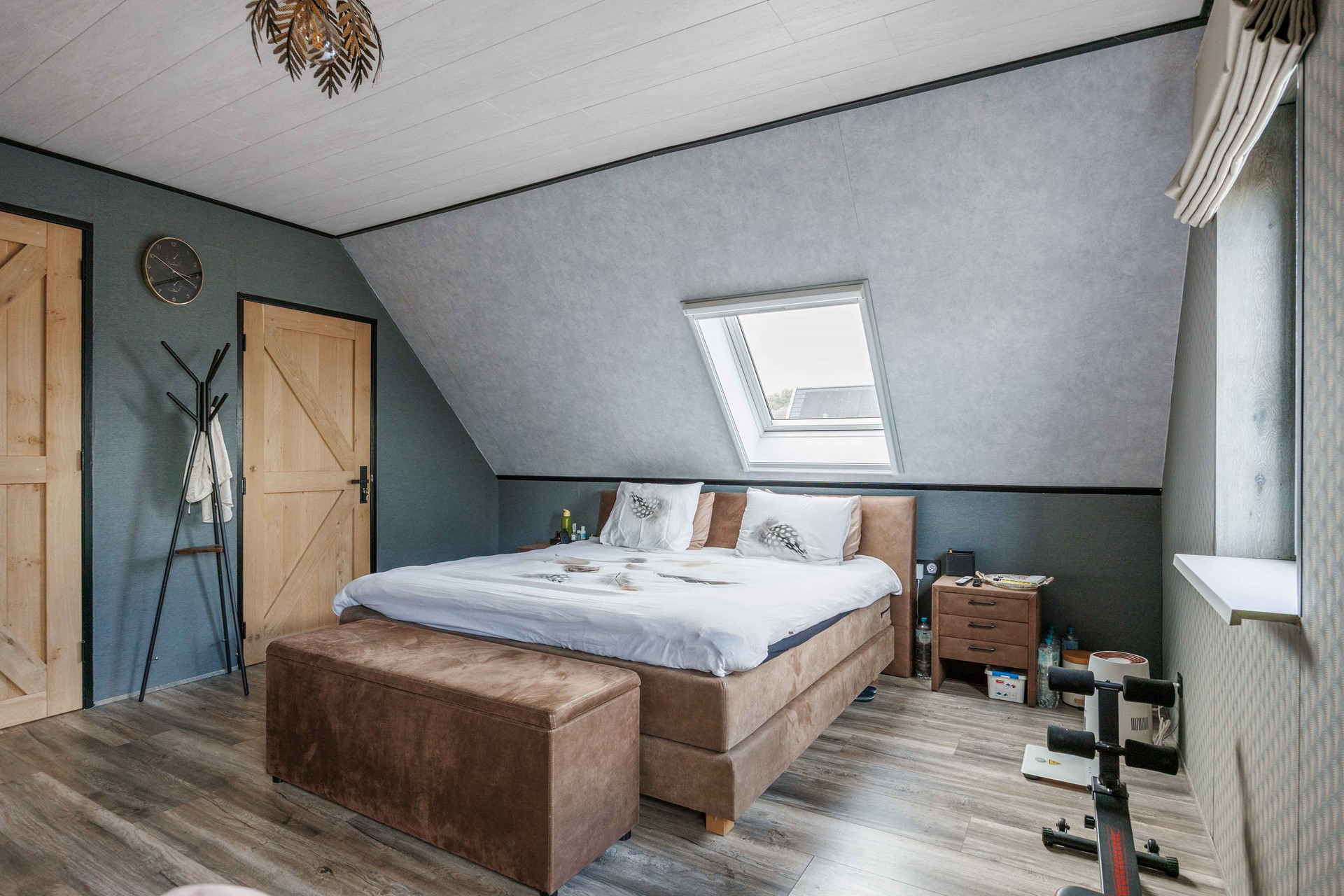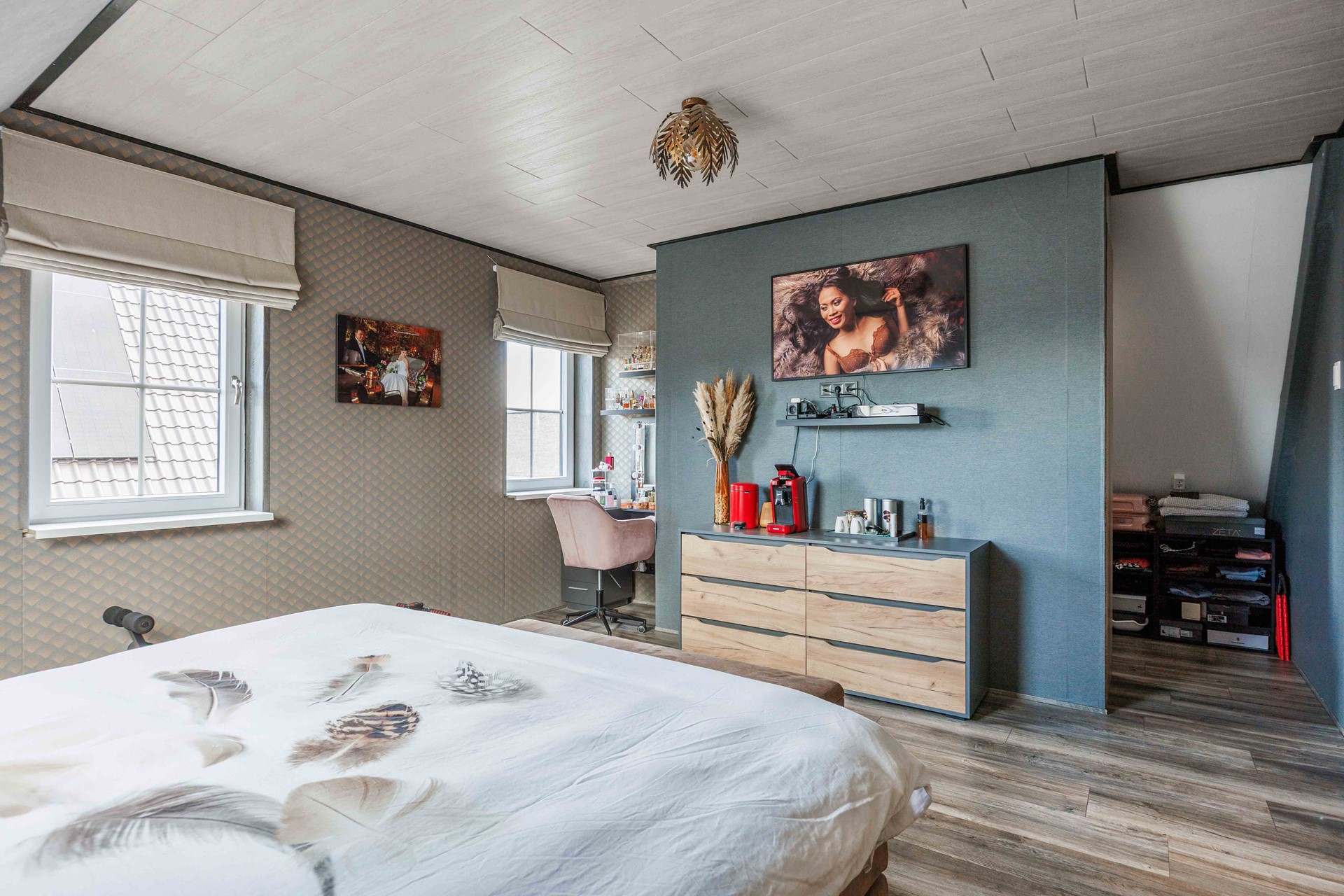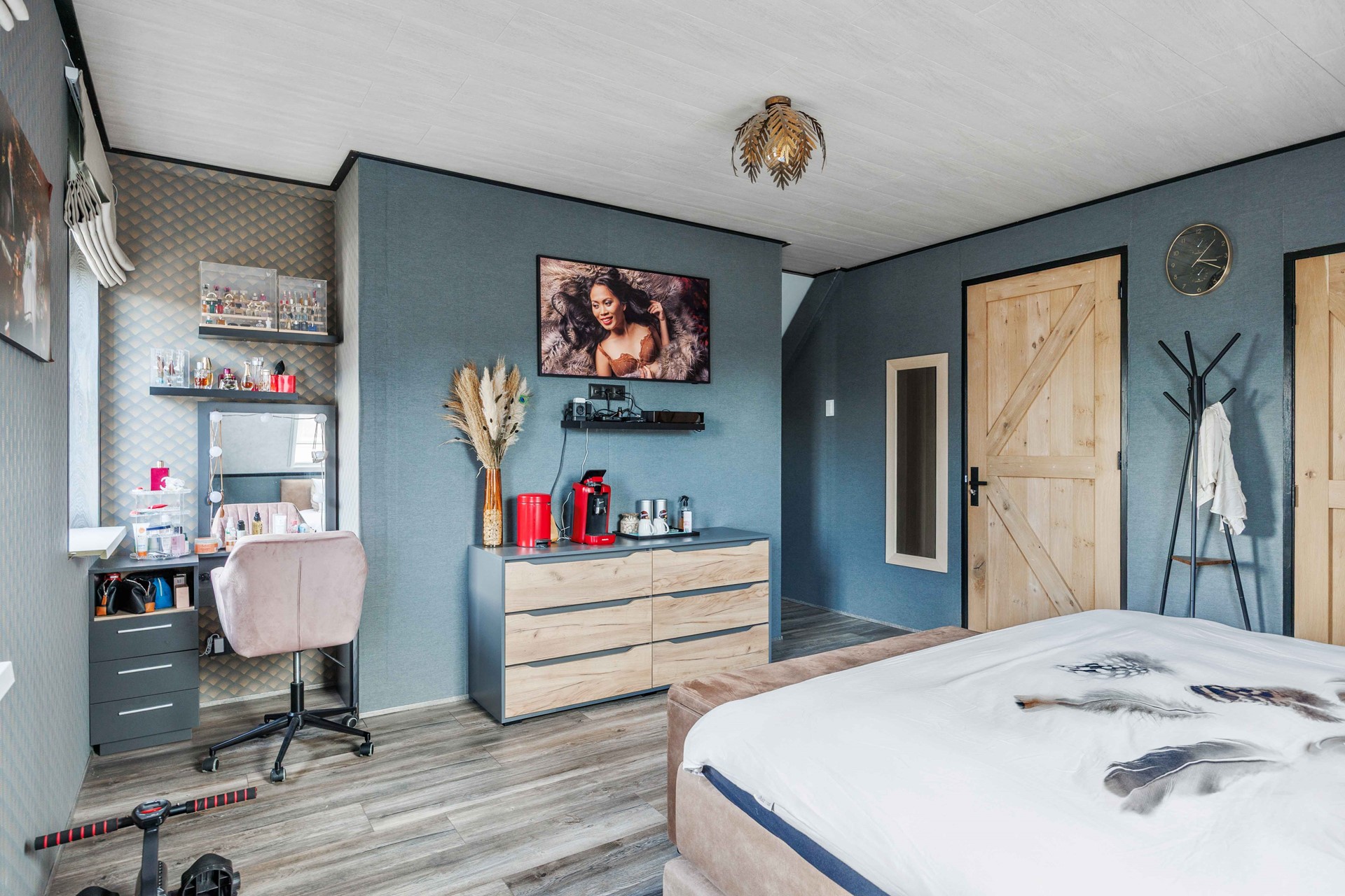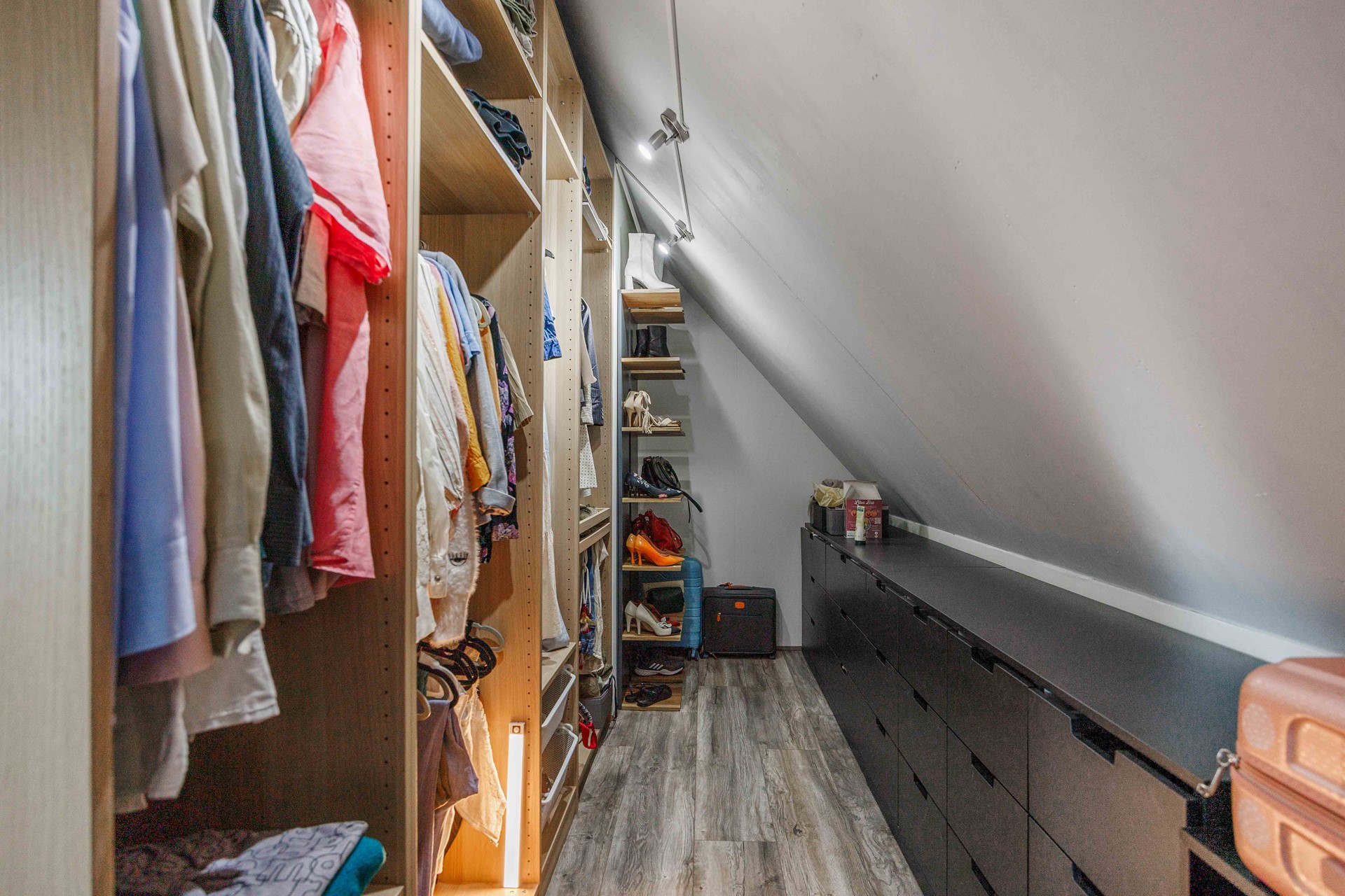 Op de eerste verdieping bevinden zich drie ruime slaapkamers, waaronder een indrukwekkende master bedroom van maar liefst ca. 26 m². Deze is stijlvol afgewerkt met moderne wandbekleding in rustige tinten en een strak licht plafond. Dankzij de twee dakramen valt er veel daglicht binnen, wat de kamer een frisse en uitnodigende sfeer geeft. Er is volop ruimte voor een groot tweepersoonsbed en extra meubels, zoals een dressoir of een zitje. Vanuit de slaapkamer is direct toegang tot de luxe badkamer. Een absolute luxe is de aangrenzende inloopkast. Deze praktische ruimte is volledig ingericht met kasten en open schappen, waardoor er meer dan voldoende opbergmogelijkheden zijn voor kleding, schoenen en accessoires. Hier heb je alles netjes binnen handbereik. De andere kamers (ca. 8 en 10 m²) zijn ideaal als slaapkamer, gastenkamer of thuiswerkkantoor. Via een vlizotrap is de vliering te bereiken die als bergzolder gebruikt kan worden voor de niet-alledaagse spullen.