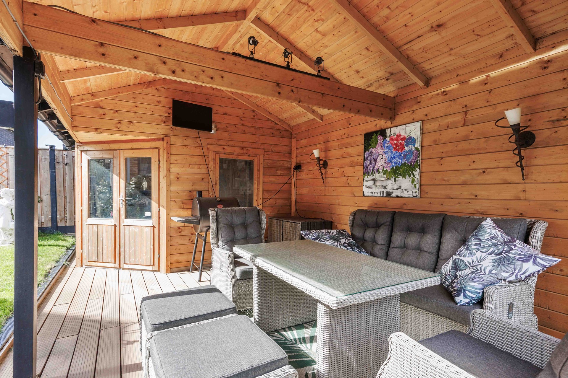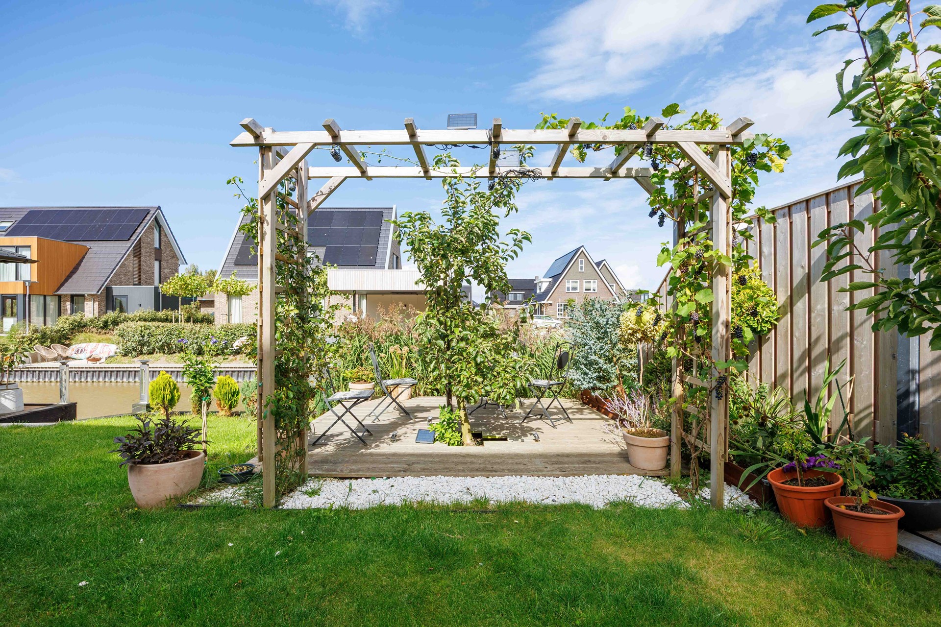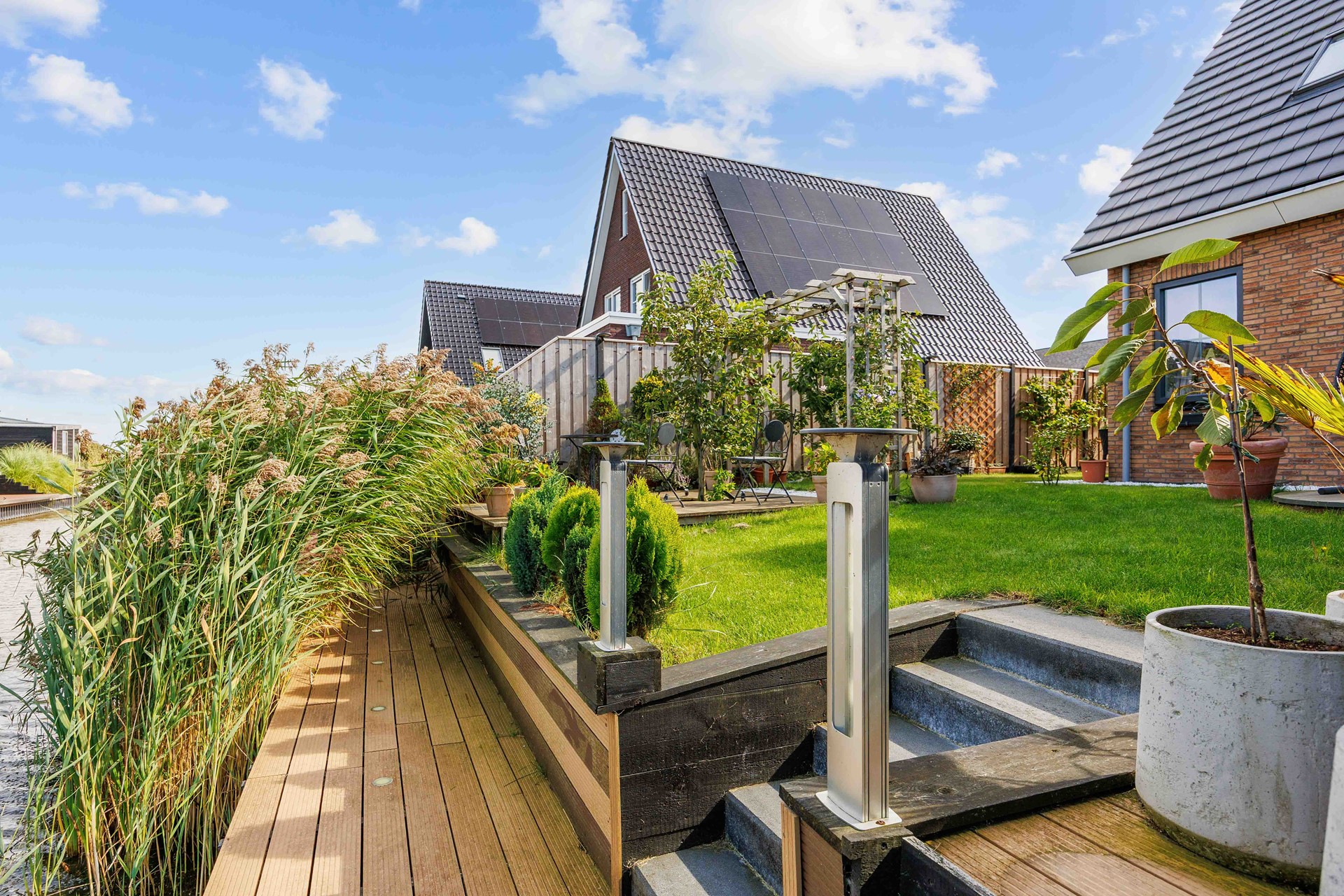 De fraaie aangelegde tuin rondom de woning is geheel af en biedt volop privacy. Een bijzonder pluspunt is de ligging aan open vaarwater (Bolswardervaart), met een eigen luxe hardhouten steiger over de gehele breedte van het perceel wat garant staat voor watersport, vissen of gewoon genieten van de rust. Daarnaast is er een vrijstaande houten berging met overkapping, praktisch voor extra opslagruimte én een fijne plek waardoor je ook bij minder mooi weer kunt genieten van het buitenleven, ongeacht het seizoen. De voortuin biedt parkeergelegenheid op eigen terrein, alsmede een oplaadpunt voor elektrische voertuigen.