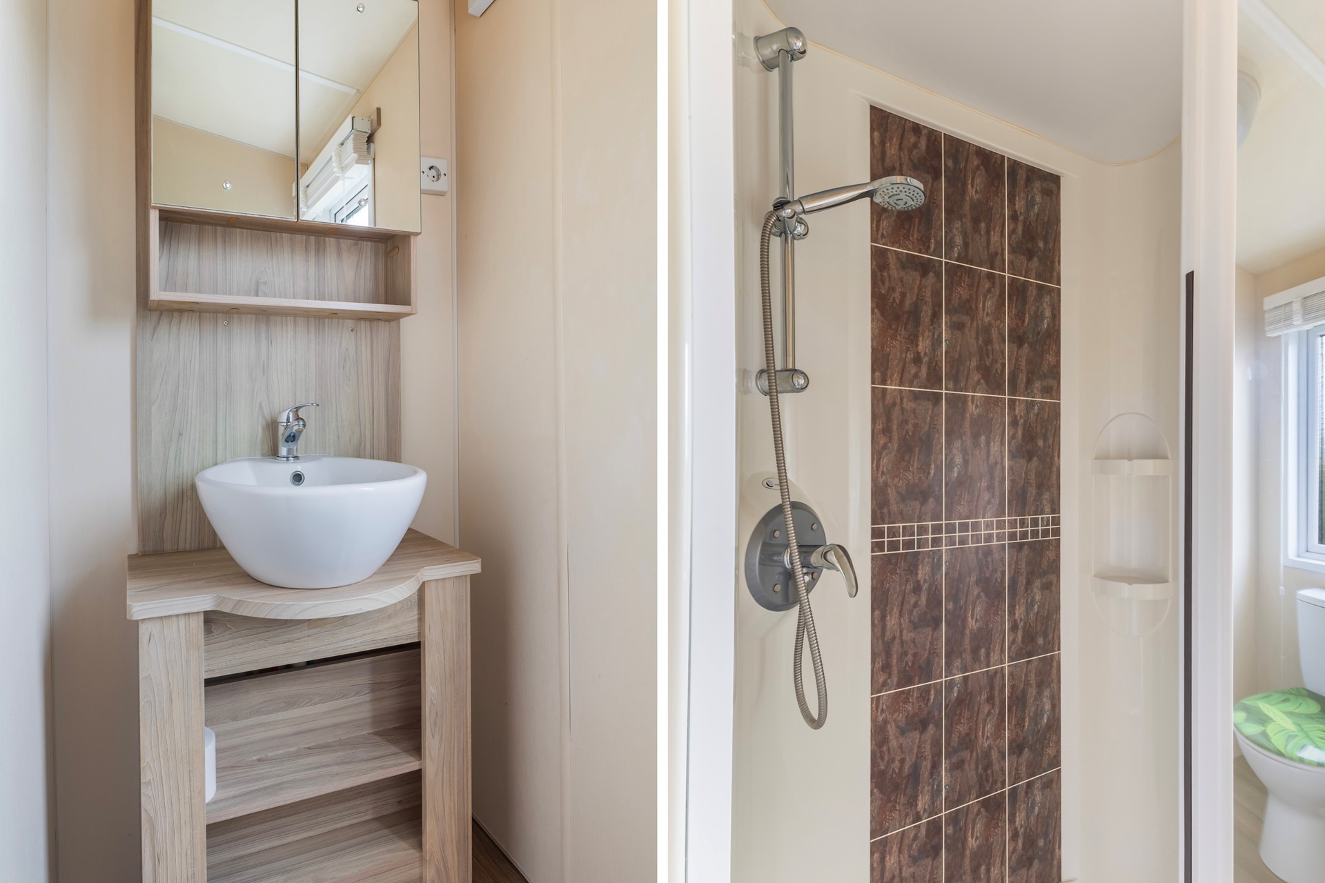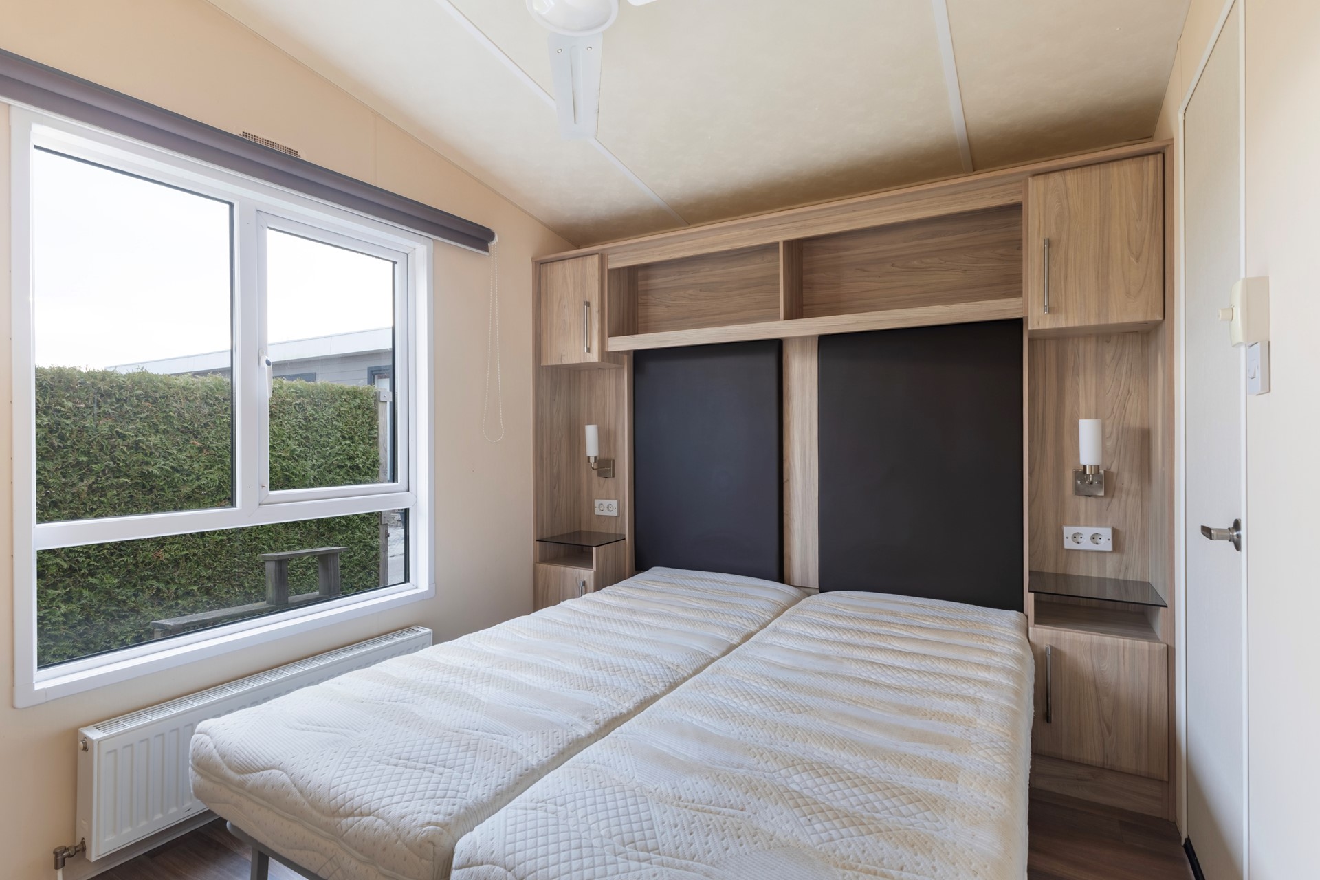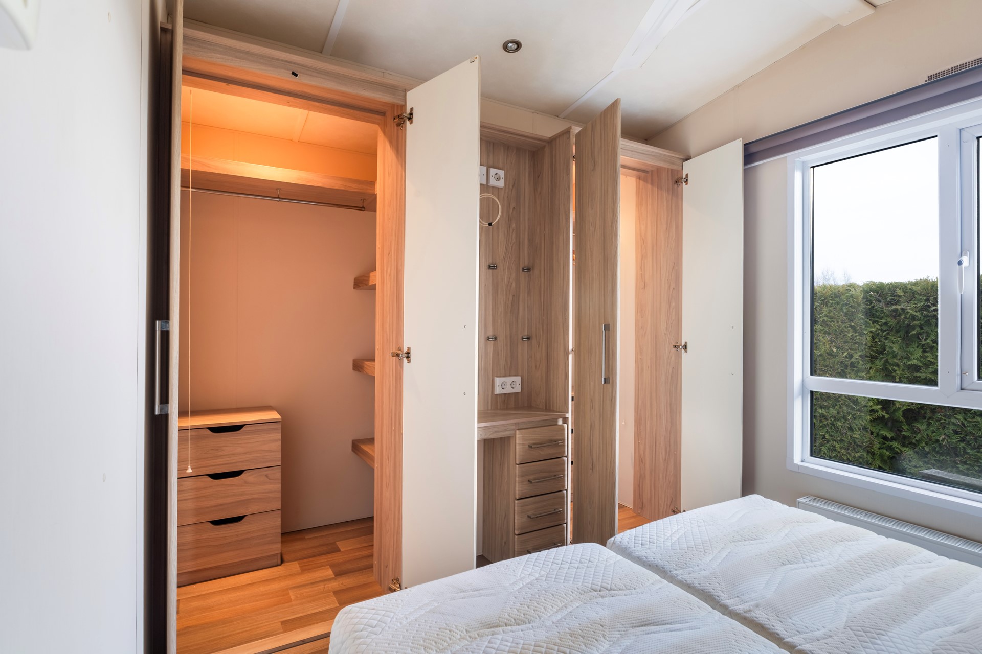 Je komt binnen in de keuken met volop kastruimte en een gaskookplaat met oven. Het geheel is netjes en praktisch ingericht. De woonkamer is verrassend ruim, heeft grote ramen en openslaande deuren naar het terras, waardoor binnen en buiten mooi in elkaar overlopen. Via de hal bereik je de slaapkamers: één royale slaapkamer met vaste kastenwand. De kastenwand is een echte meerwaarde: strak ingebouwd, volledig op maat en voorzien van een praktische indeling met hangruimte, legplanken, lades en zelfs een compacte toilettafel. Daarnaast beschikt de slaapkamer over een extra diepe kast, ideaal voor het netjes opbergen van kleding, koffers of seizoensspullen. Kortom: een fijne, rustige slaapkamer met veel opbergruimte en een slimme inrichting. De tweede slaapkamer heeft twee separate bedden en is slim ingericht met vaste kastruimte én extra opbergruimte boven het hoofdeinde. Door het raam komt er prettig daglicht binnen en kijk je uit op het groen rondom het chalet. Een praktische kamer die zich uitstekend leent als logeerkamer, kinderslaapkamer of werkkamer. De badkamer is voorzien van een douche, toilet en wastafelmeubel.