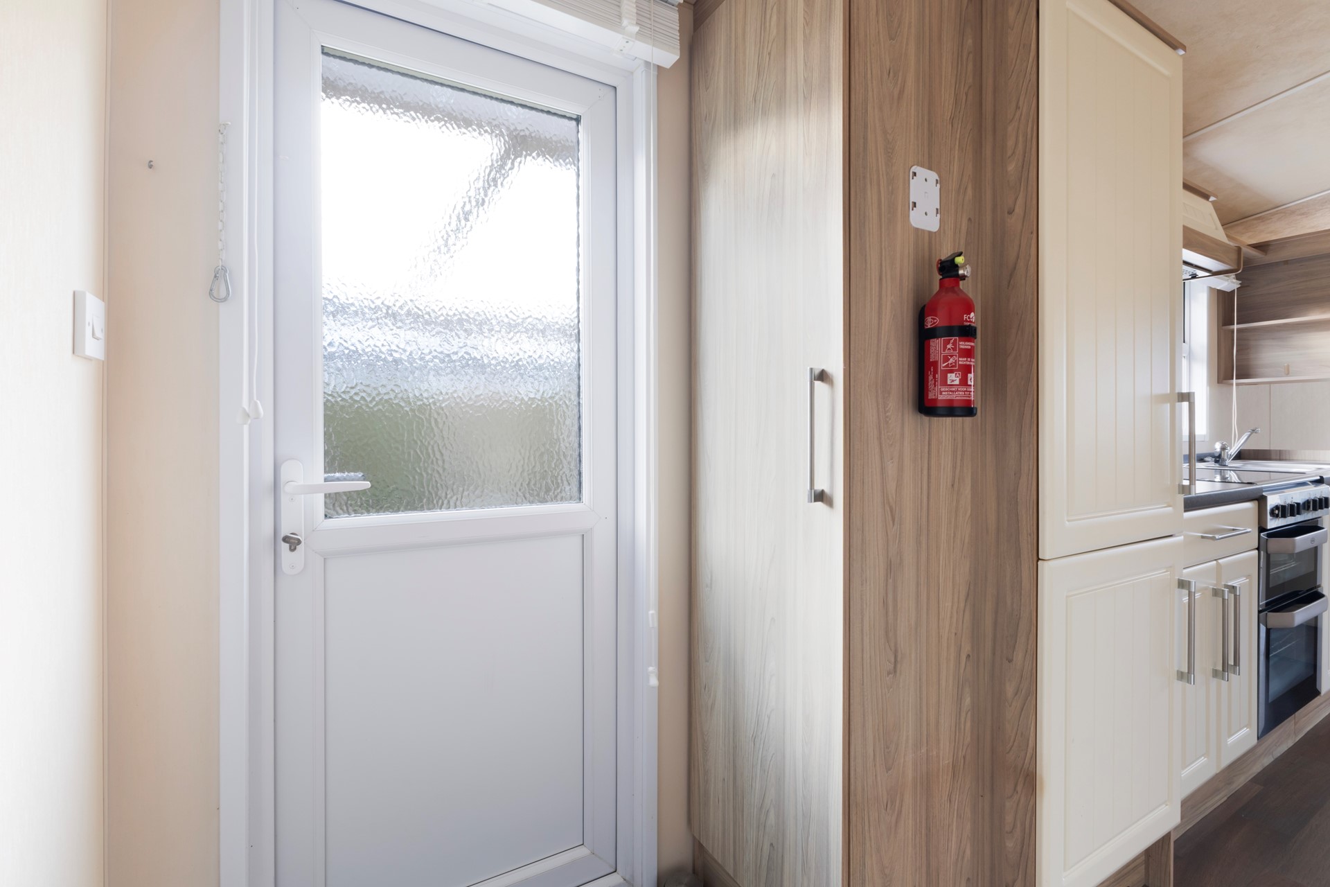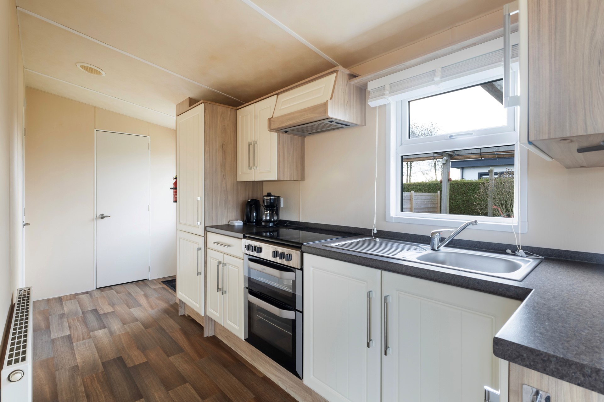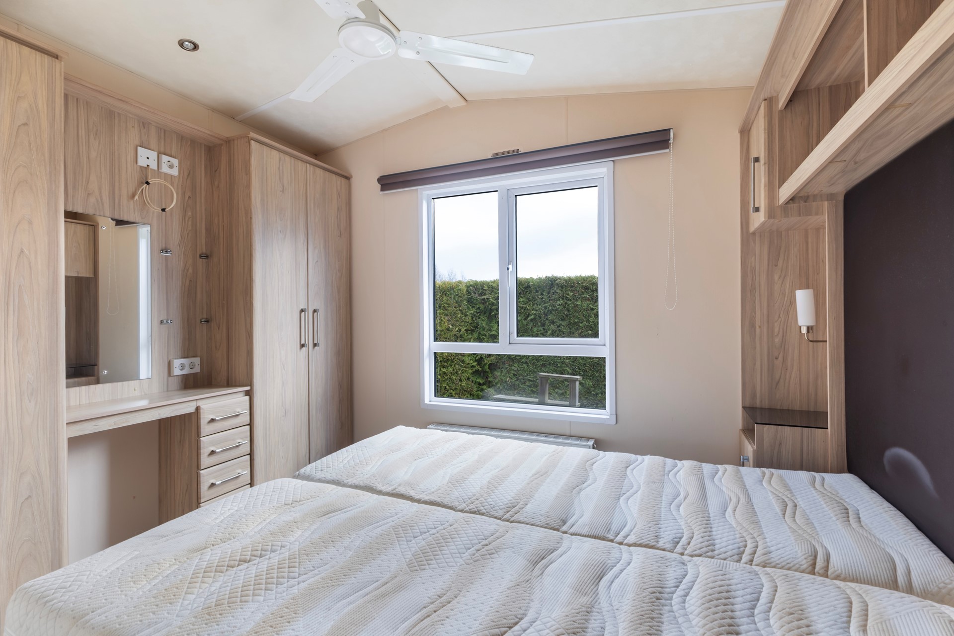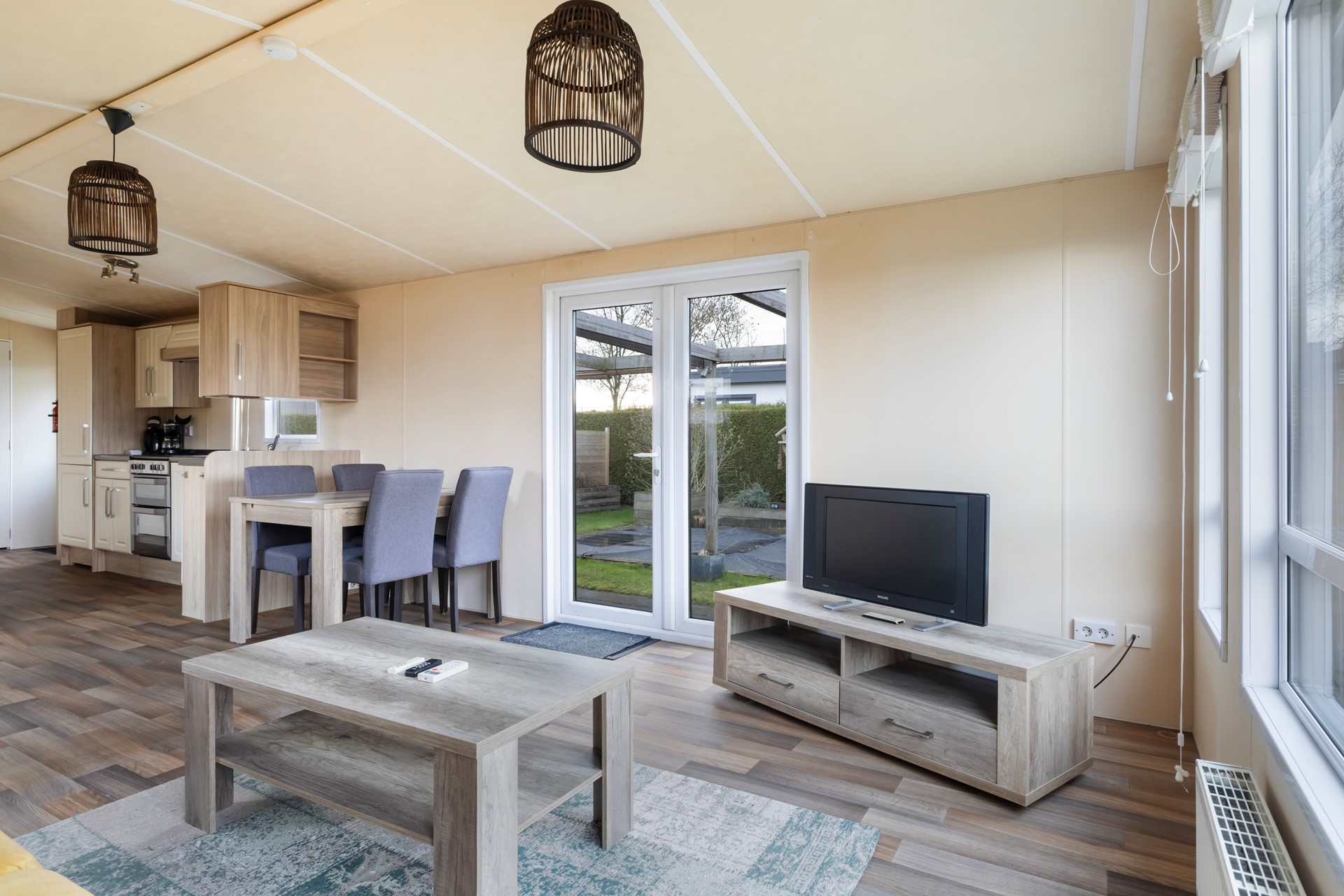 Je komt binnen in de keuken met volop kastruimte en een gaskookplaat met oven. Het geheel is netjes en praktisch ingericht. De woonkamer is verrassend ruim, heeft grote ramen en openslaande deuren naar het terras, waardoor binnen en buiten mooi in elkaar overlopen. Via de hal bereik je de slaapkamers: één royale slaapkamer met vaste kastenwand. De kastenwand is een echte meerwaarde: strak ingebouwd, volledig op maat en voorzien van een praktische indeling met hangruimte, legplanken, lades en zelfs een compacte toilettafel. Daarnaast beschikt de slaapkamer over een extra diepe kast, ideaal voor het netjes opbergen van kleding, koffers of seizoensspullen. Kortom: een fijne, rustige slaapkamer met veel opbergruimte en een slimme inrichting. De tweede slaapkamer heeft twee separate bedden en is slim ingericht met vaste kastruimte én extra opbergruimte boven het hoofdeinde. Door het raam komt er prettig daglicht binnen en kijk je uit op het groen rondom het chalet. Een praktische kamer die zich uitstekend leent als logeerkamer, kinderslaapkamer of werkkamer. De badkamer is voorzien van een douche, toilet en wastafelmeubel.