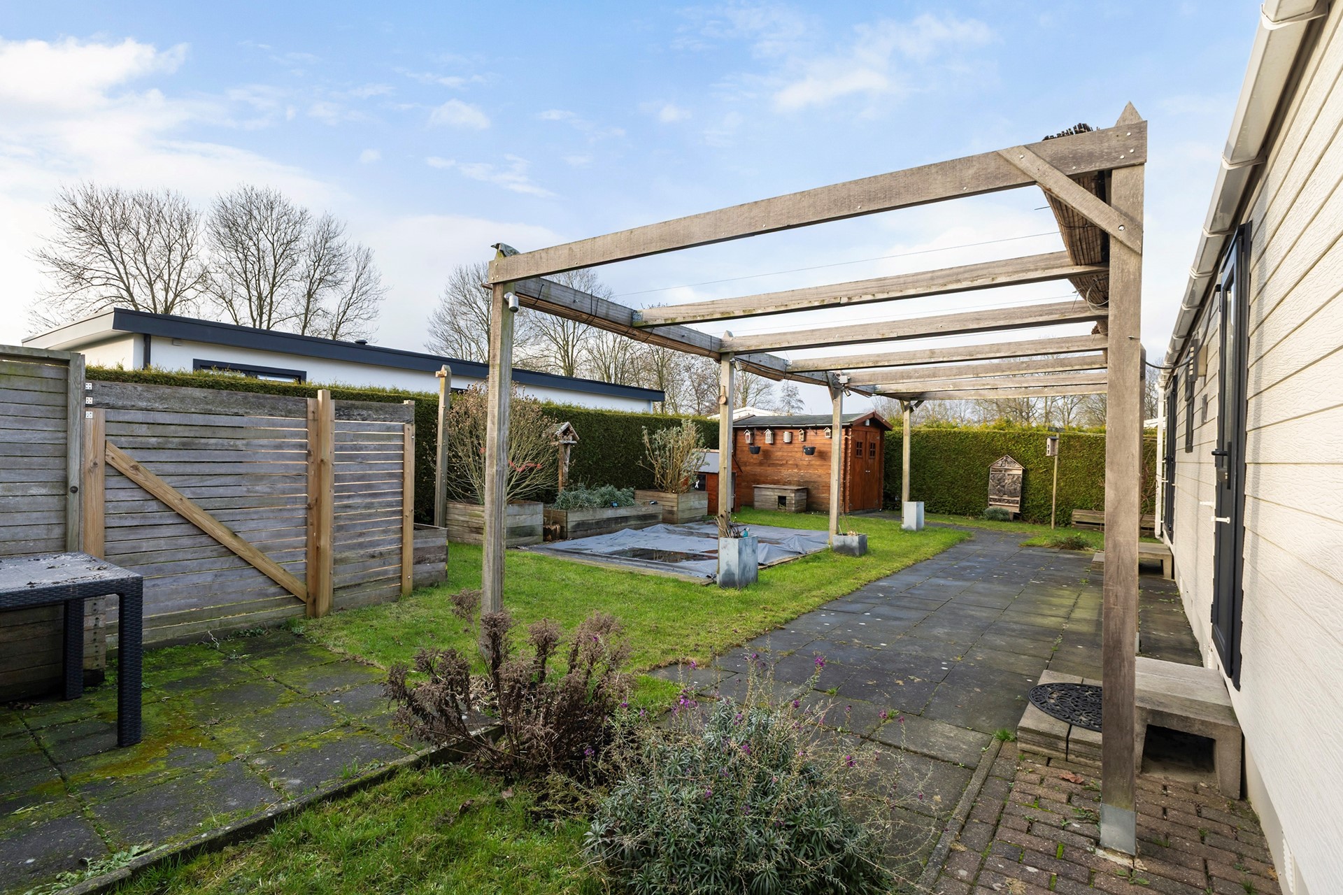 De tuin is groot, groen en volledig omsloten met hagen - dus veel privacy! Hier kun je heerlijk zonnen, borrelen en ontspannen. En extra leuk: er ligt een zwembad in de tuin waar je op warme dagen lekker in verkoeling kunt duiken. Verder is er een vrijstaande berging voor fietsen en tuinspullen.