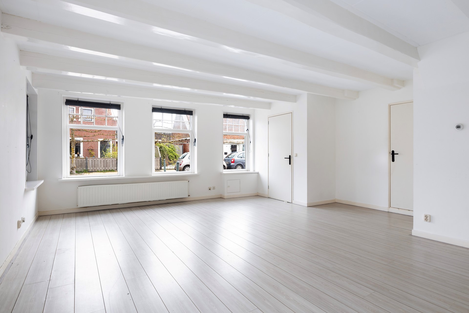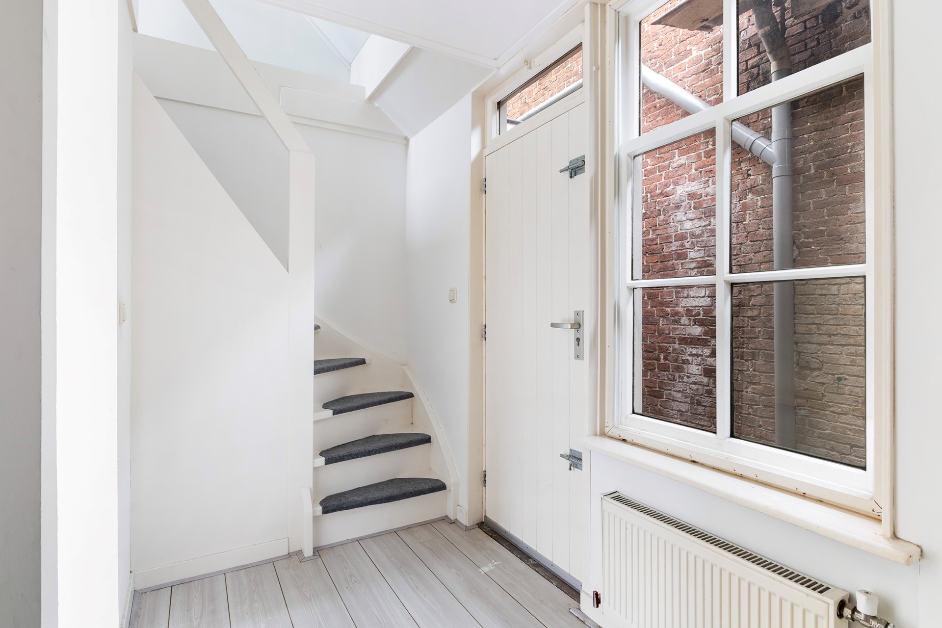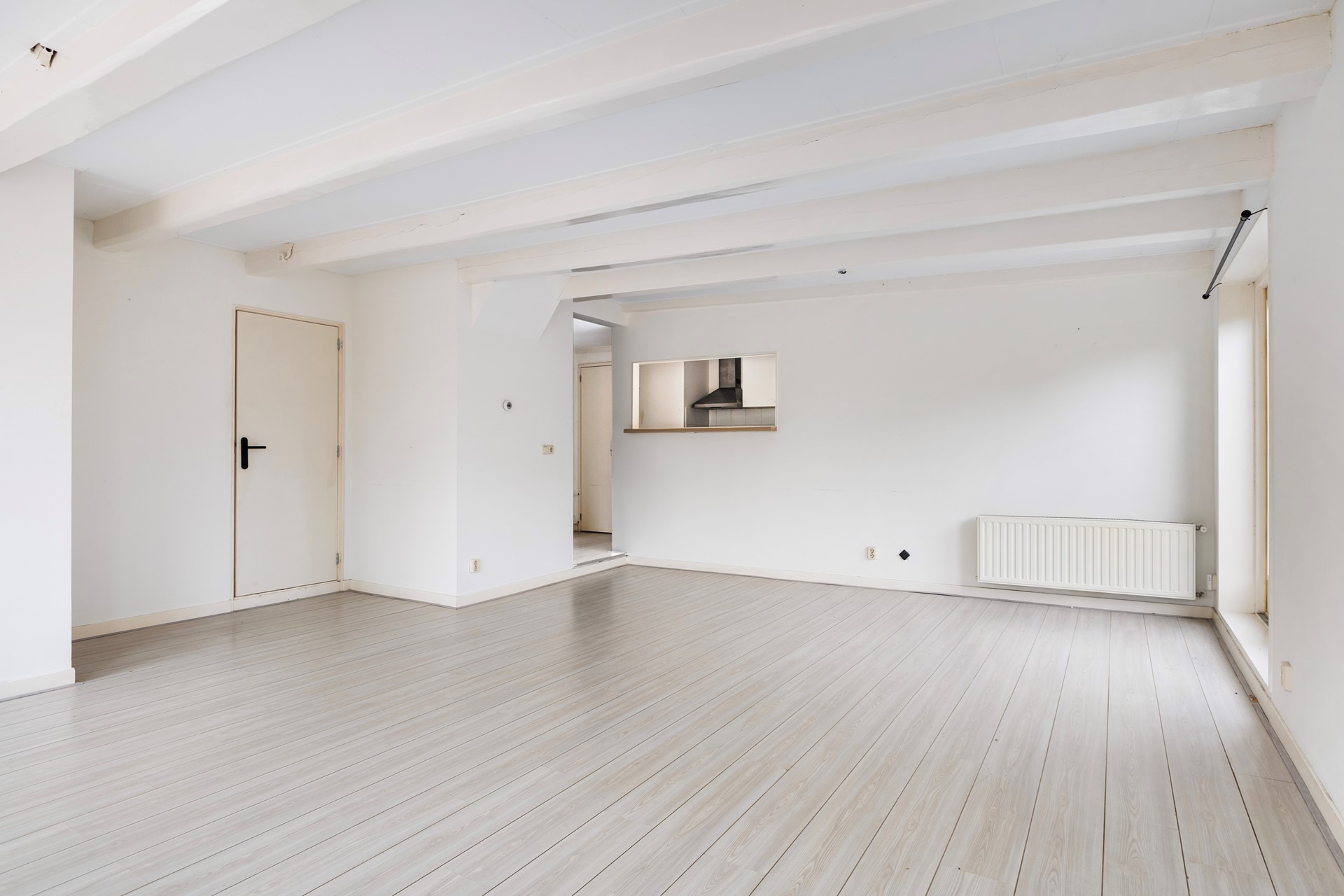 Via de entree kom je binnen in een kleine hal aan de voorzijde met meterkast en toegang tot de woonkamer. De woonkamer is verrassend ruim (ca. 33 m²) en heeft een lichte, frisse uitstraling dankzij de nette, neutrale afwerking. Het balkenplafond geeft de ruimte extra sfeer en karakter, terwijl de charmante raampartijen zorgen voor een prettige lichtinval en een mooie verbinding met buiten. Een fijne leefruimte met volop mogelijkheden voor een gezellige zit- en eethoek. Via de openslaande deuren in de woonkamer is er toegang tot de achterplaats, waar je een beschutte buitenruimte hebt met voldoende privacy. Vanuit de woonkamer is er toegang tot een inpandige berging, die zich uitstekend leent als royale kastruimte of praktische opslagruimte. Aan de achterzijde van de woning bevindt zich de keuken in een rechte opstelling, eenvoudig maar functioneel en voorzien van basisapparatuur. Aansluitend kom je in de bijkeuken met toilet en extra bergruimte. Vanuit de hal achterin de woning is toegang tot de binnenplaats via een smalle steeg – een praktische doorgang naar buiten. Tevens is hier de trapopgang naar de verdieping bereikbaar.