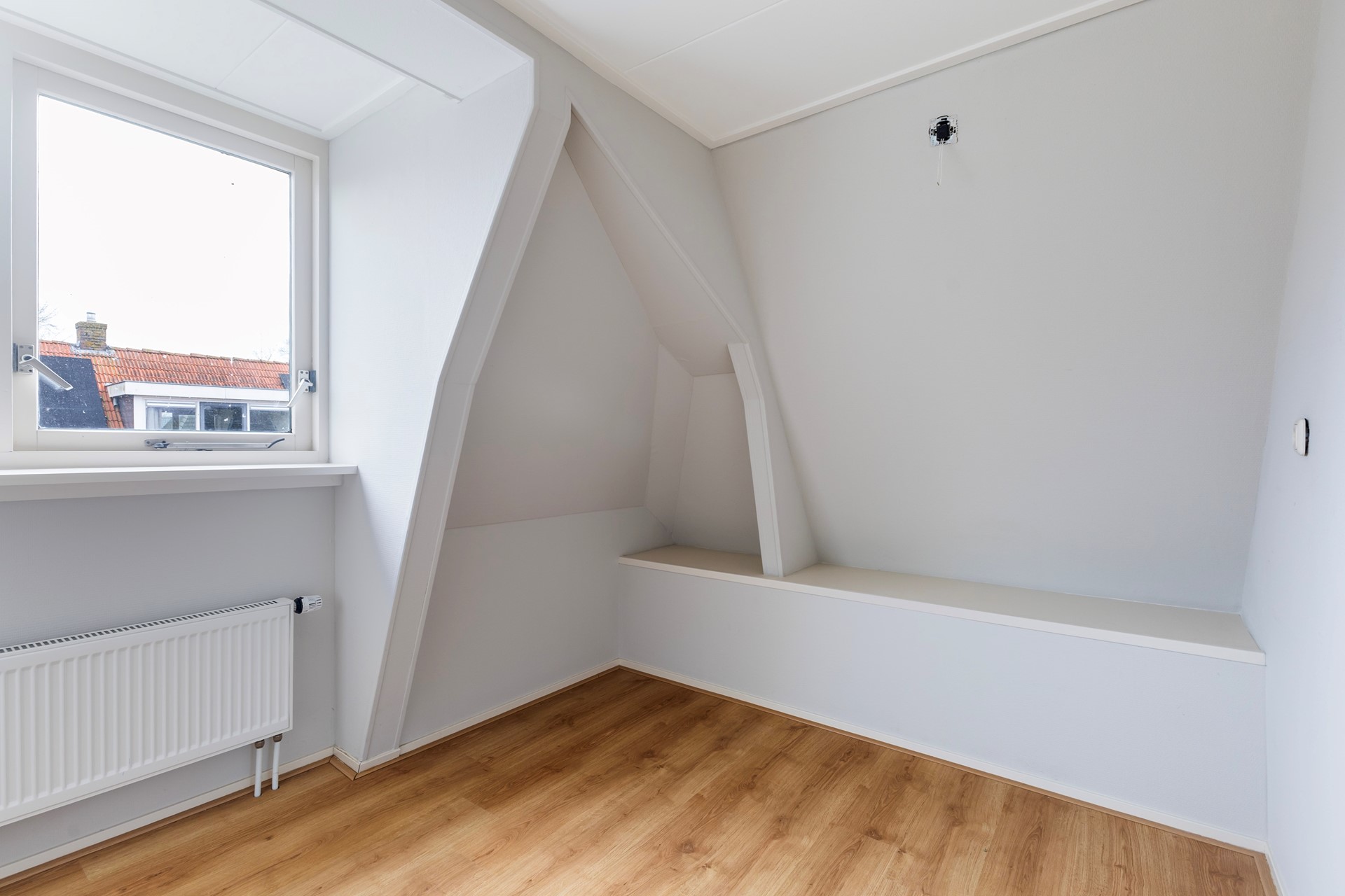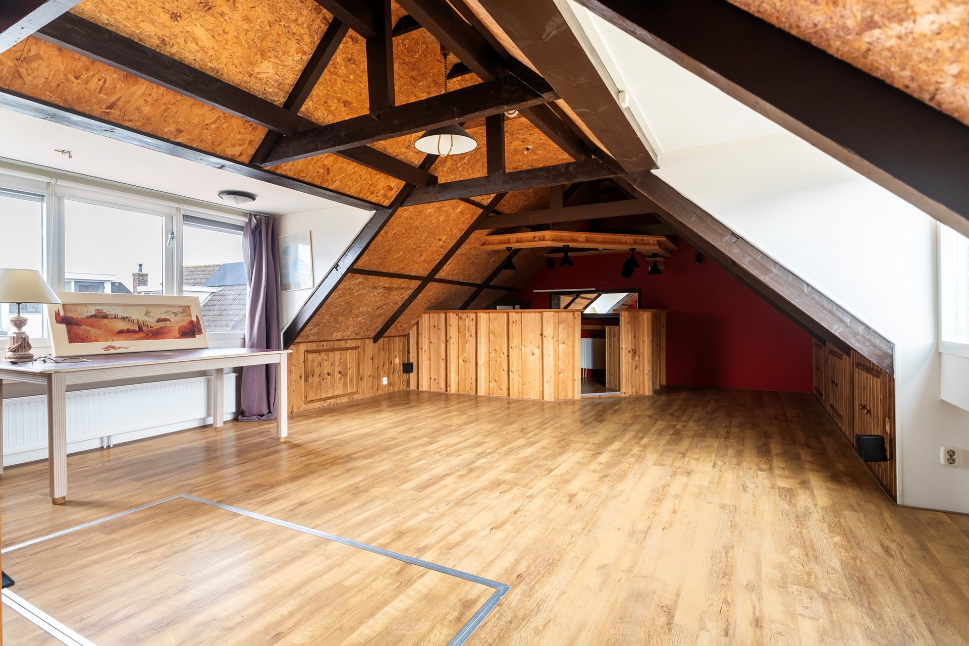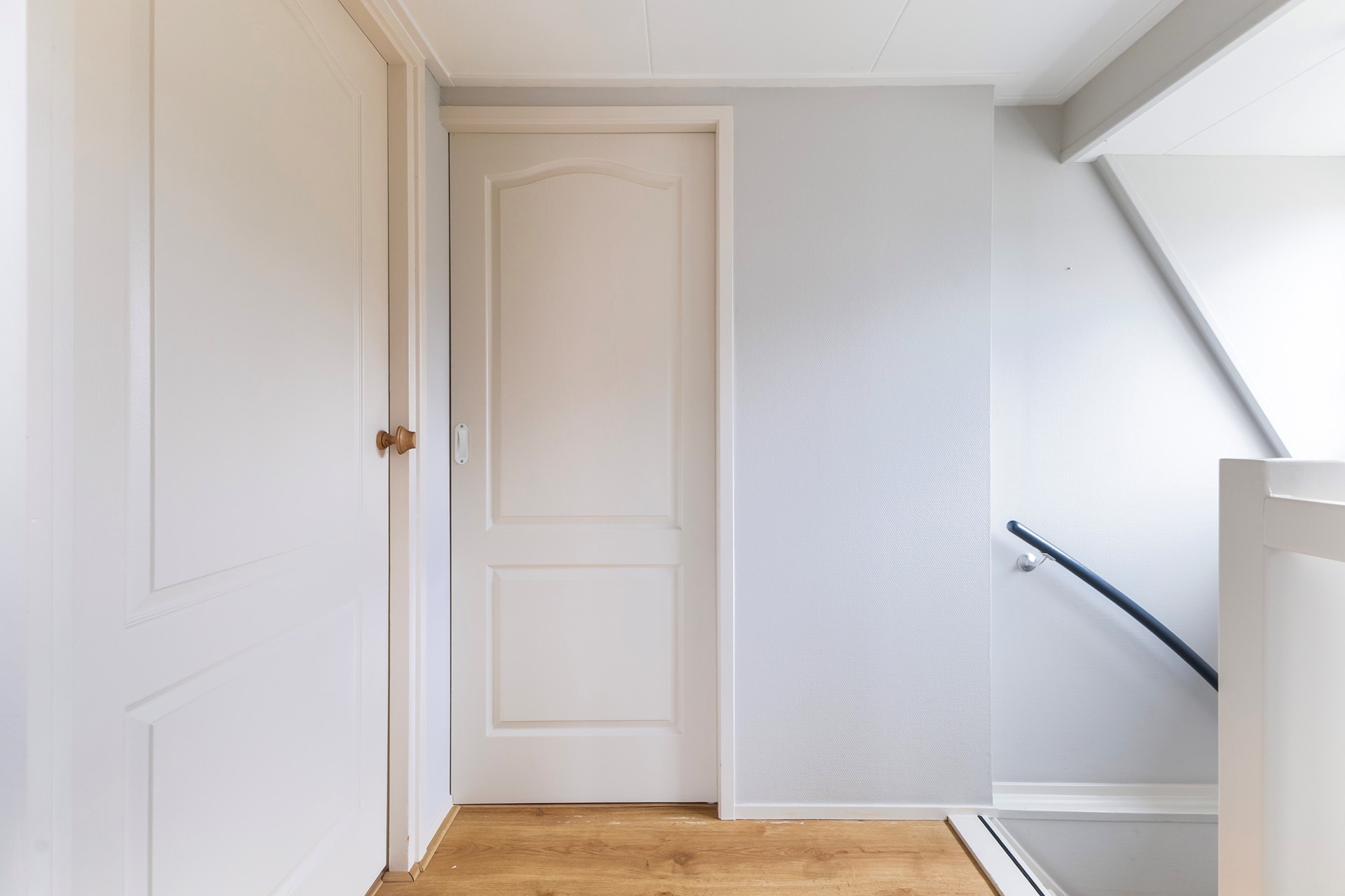 Op de verdieping bevinden zich drie slaapkamers en een overloop. De kamers variëren in grootte en zijn geschikt als slaap-, werk- of hobbyruimte. Door de schuine kap en indeling hebben de kamers een speels karakter. Eén van de slaapkamers is voorzien van praktische vaste kasten, wat zorgt voor veel handige opbergruimte en een nette uitstraling. Een andere slaapkamer biedt directe toegang tot het platte da