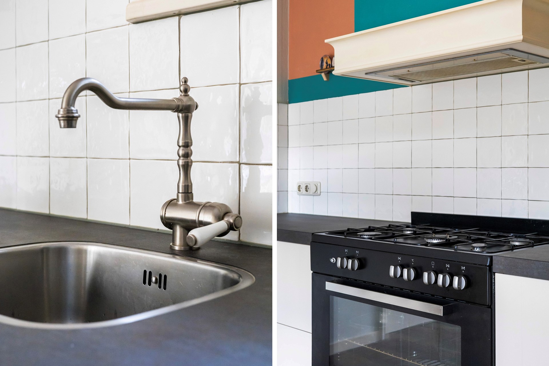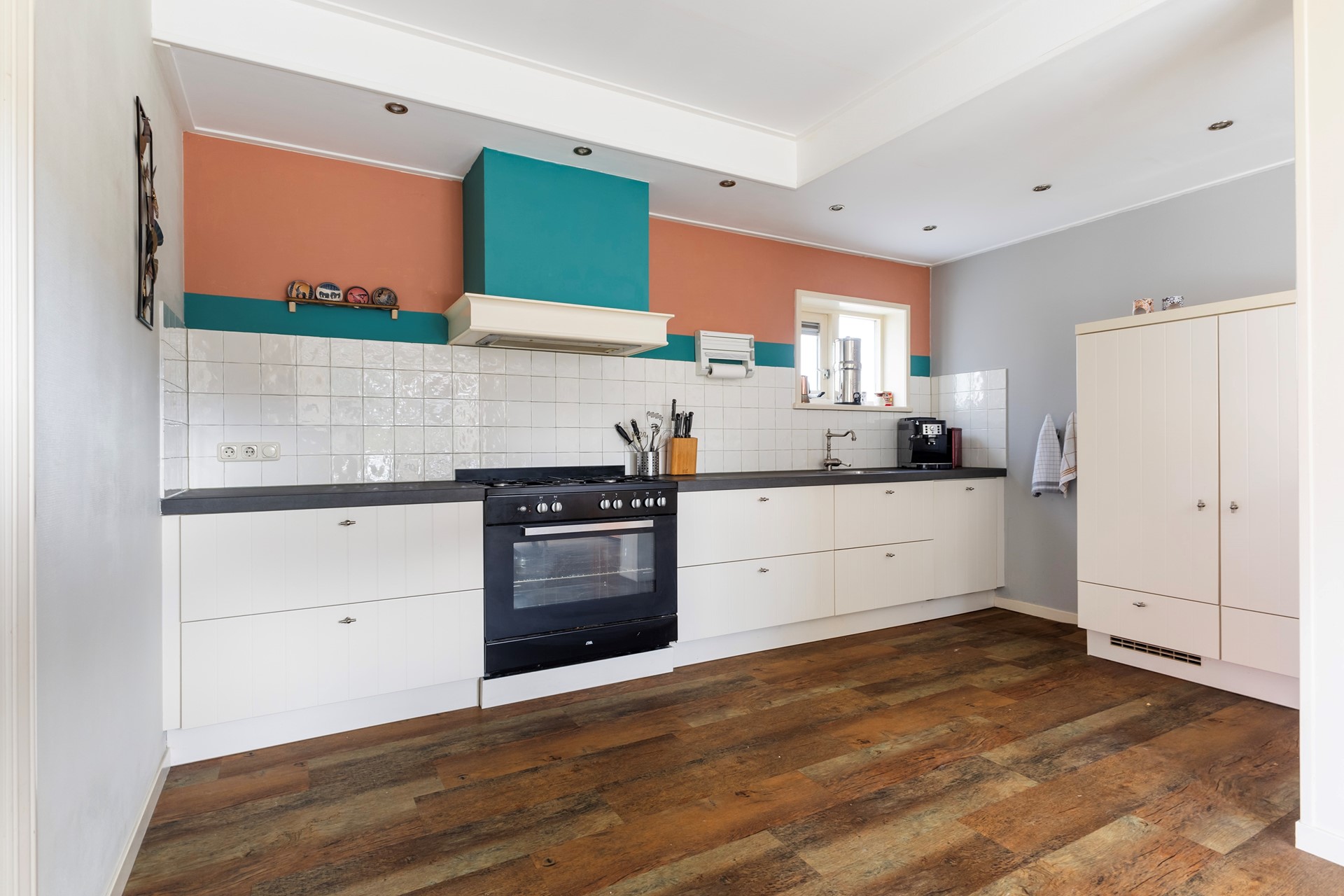 Aansluitend bevindt zich de ruime woonkeuken, die dankzij de erker een prettige lichtinval en extra ruimte biedt. De keuken is uitgevoerd in een rechte opstelling en heeft een moderne, rustige uitstraling. De lichte fronten in combinatie met het donkere werkblad zorgen voor een mooi contrast en geven het geheel een tijdloze look. De keuken is daarnaast voorzien van diverse inbouwapparatuur, waaronder een fornuis met oven, afzuigkap, vaatwasser en voldoende kastruimte voor al je keukengerei. Door de opstelling en de ruimte rondom is er volop plek voor een royale eettafel, waardoor dit echt het hart van de woning vormt – een plek waar koken, eten en gezellig samenzijn samenkomen.