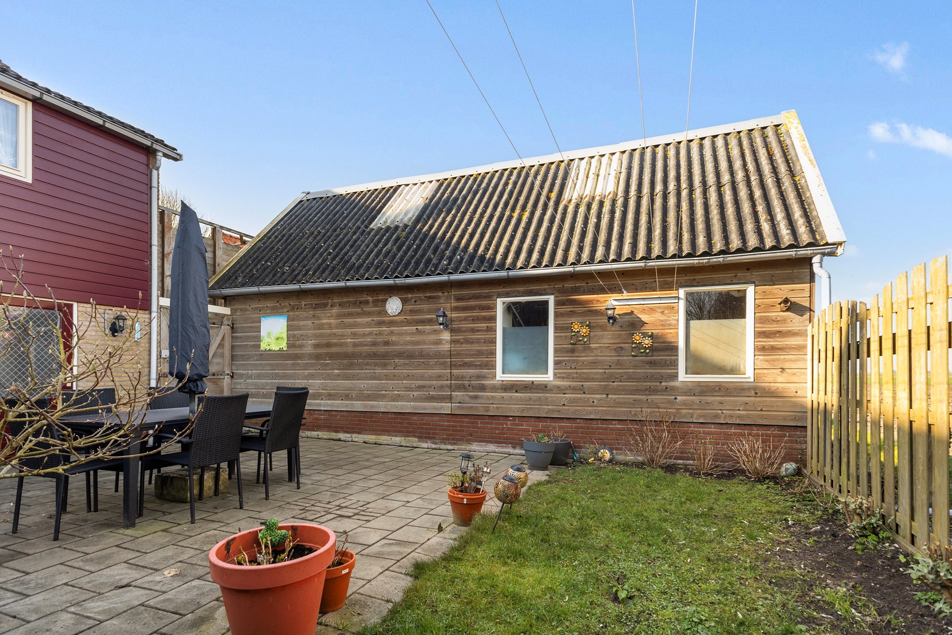 De achtertuin ligt beschut en biedt een fijne plek om buiten te zitten. Hier ervaar je echt de rust en ruimte waar het Bildt om bekend staat. In de tuin staat een ruime vrijstaande garage van circa 37 m² met een eigen zolder. De garage is ideaal voor hobby, opslag of werkruimte en is voorzien van krachtstroom. Hier is bovendien vloerverwarming en water aanwezig.