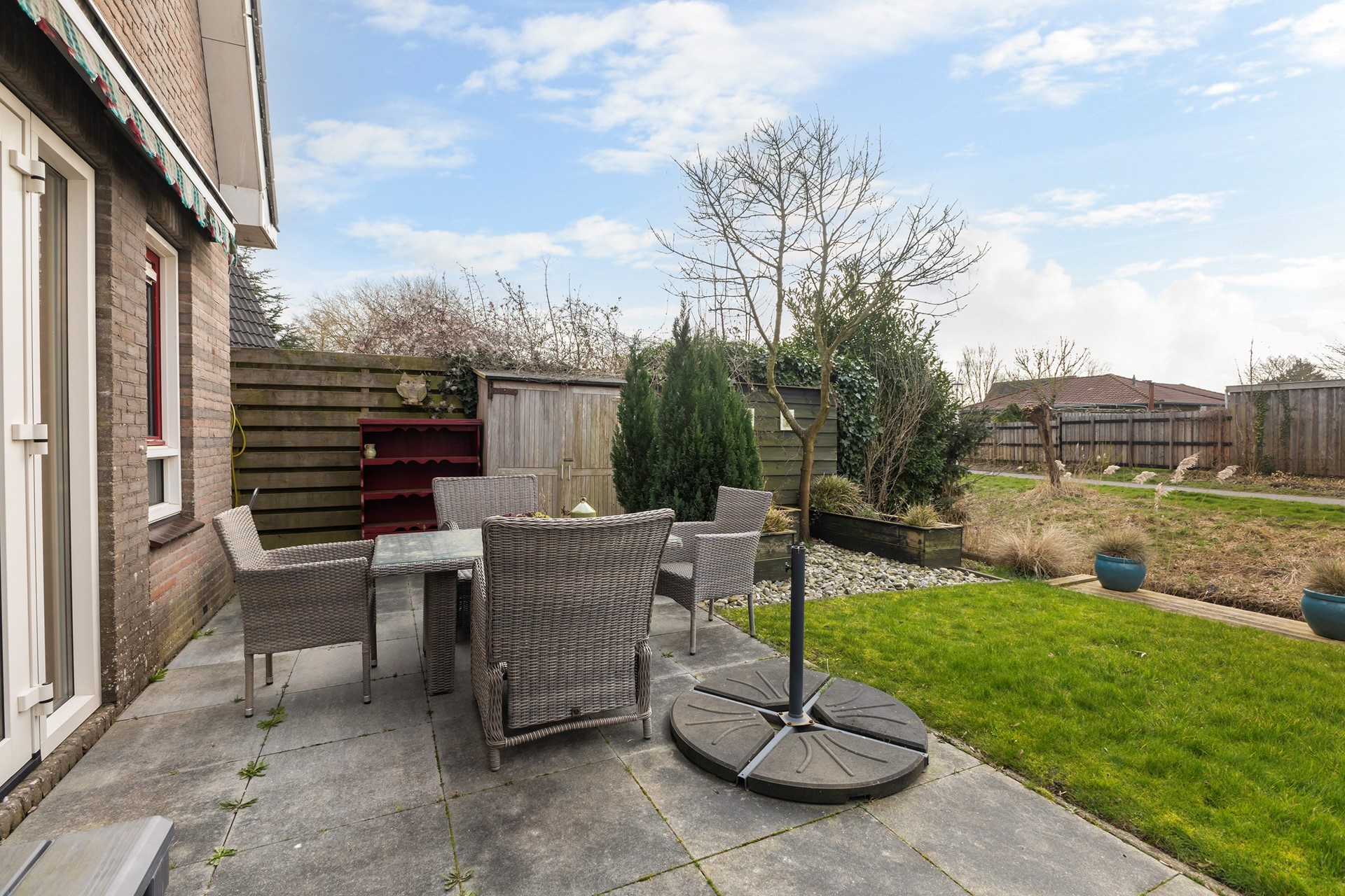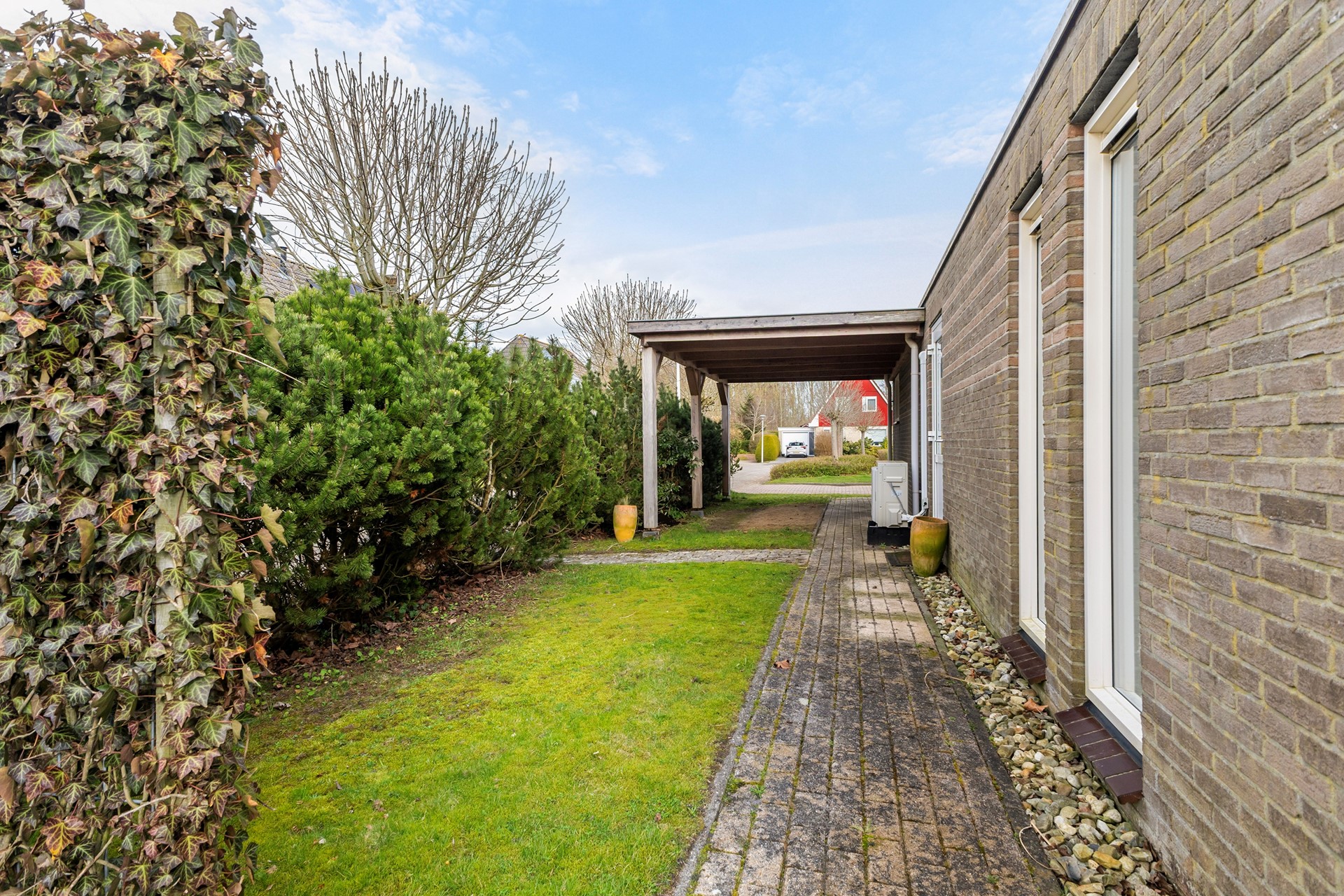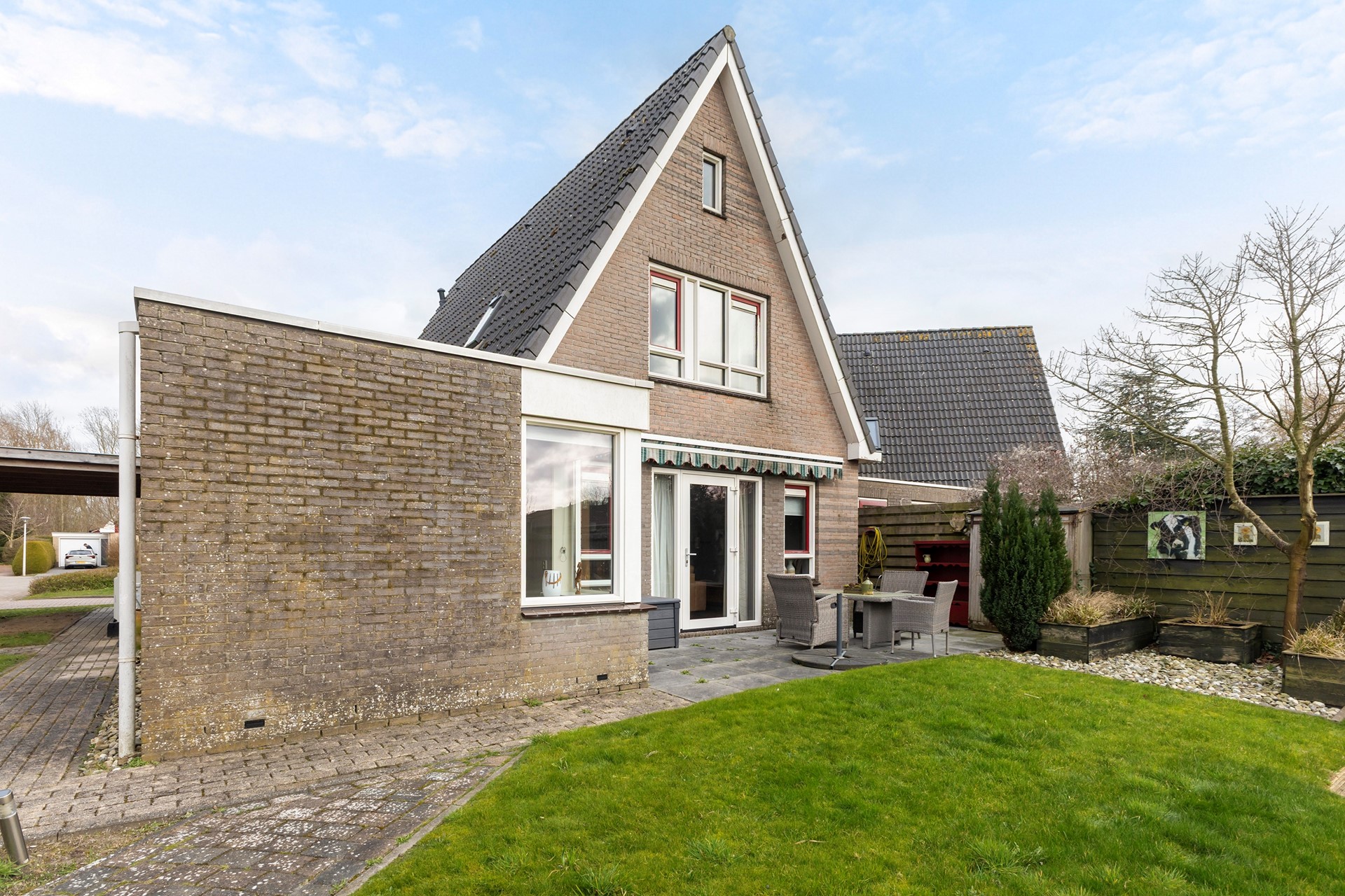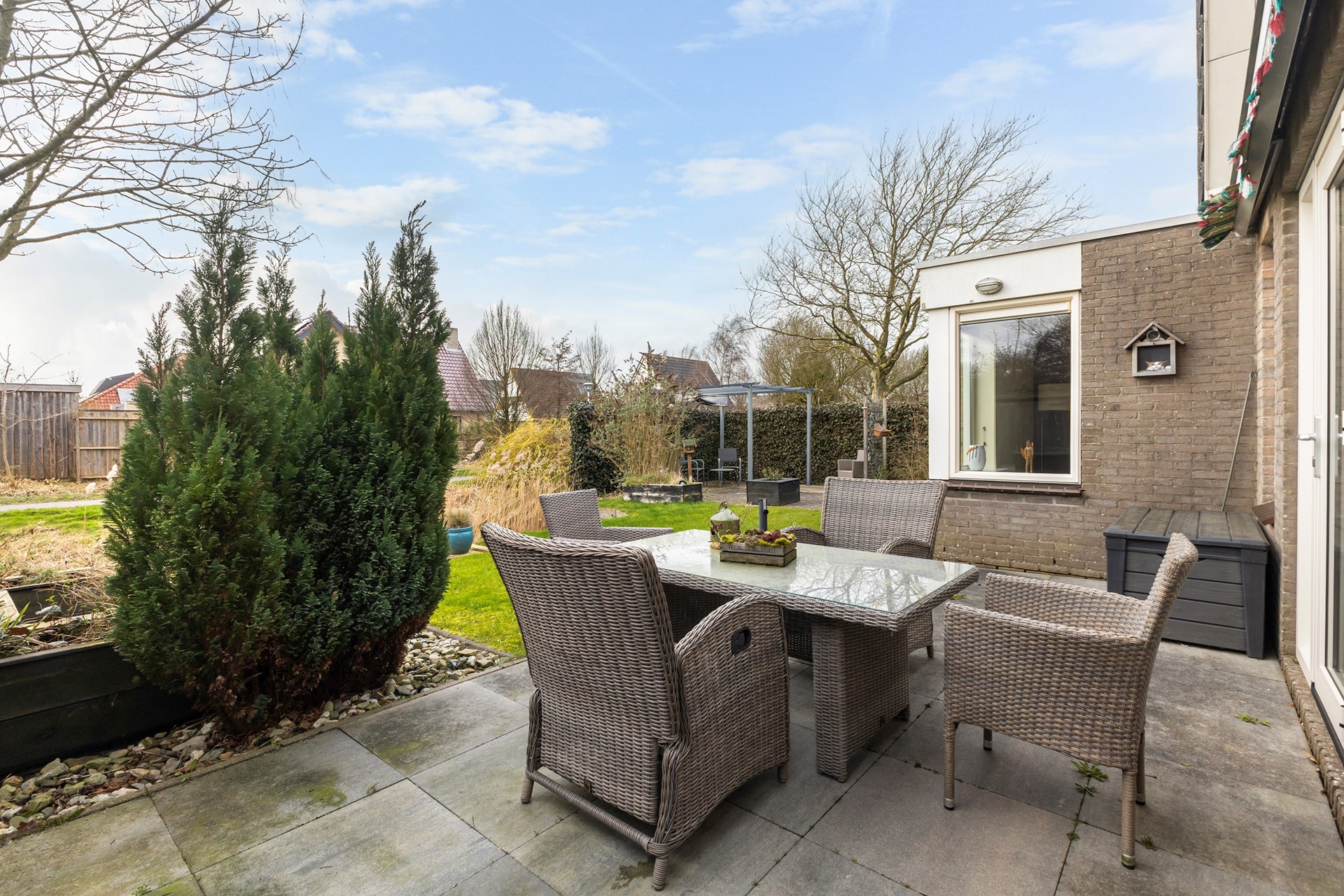De tuin rondom de woning is verzorgd aangelegd en biedt een fijne combinatie van groen en bestrating. Direct achter de woning bevindt zich een ruim terras. Verder is de tuin speels ingedeeld met een gazon, vaste beplanting en meerdere borders. Achterin de tuin vind je een tweede terras met pergola, waar je beschut en met veel privacy kunt zitten. De tuin grenst aan water en een groenstrook, wat zorgt voor een vrij gevoel. Daarnaast is er een praktische zijtuin met overkapping en een achterom.
