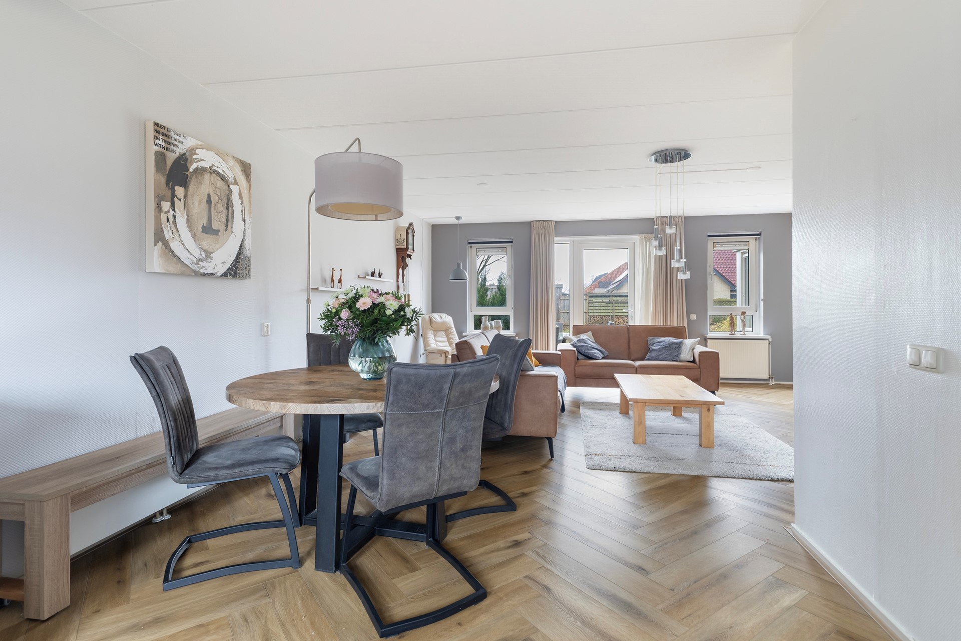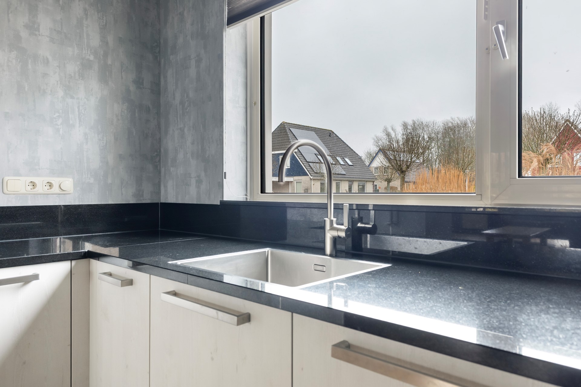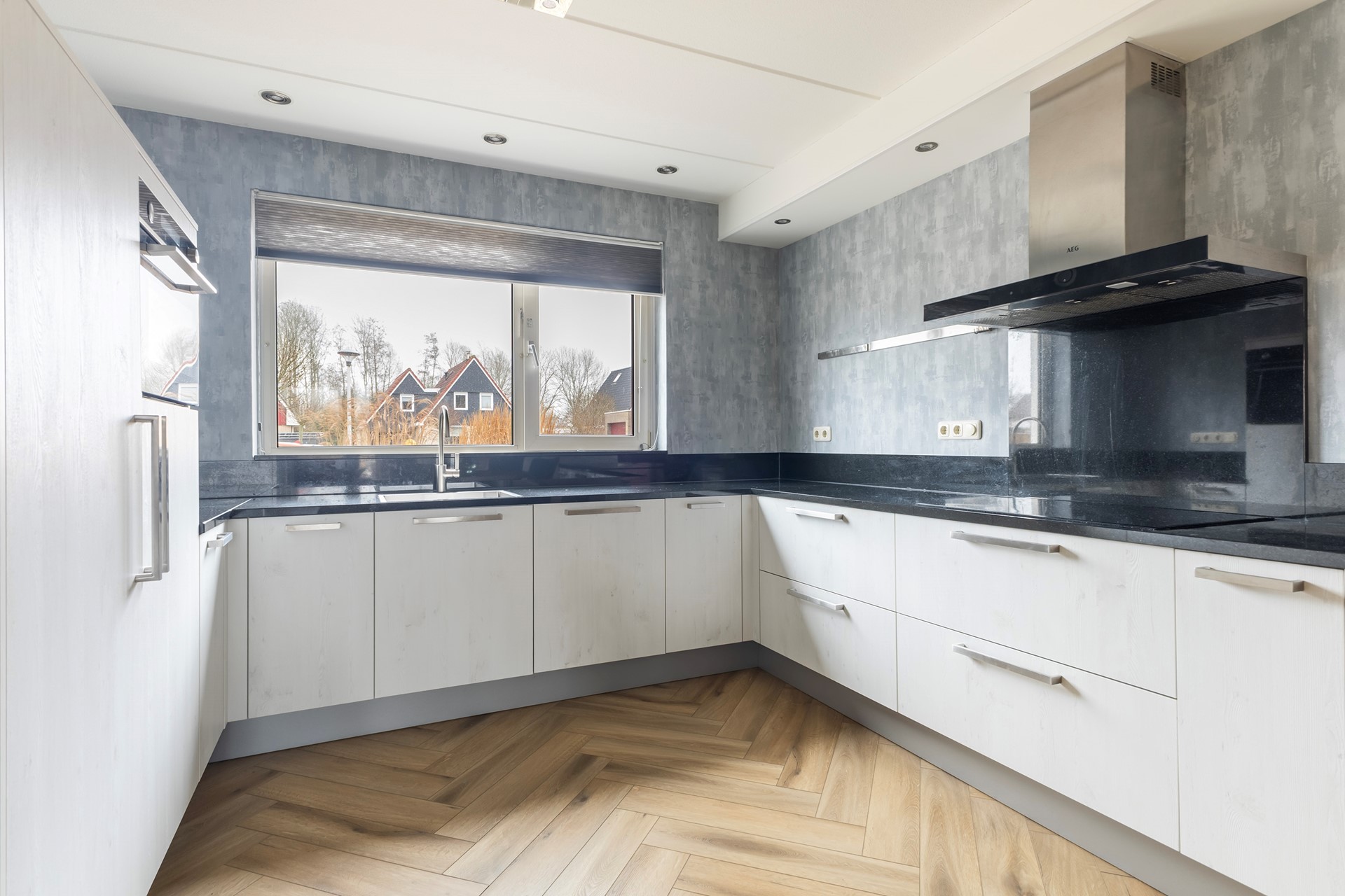 De keuken is modern uitgevoerd en opgesteld in een praktische hoekopstelling, waardoor er veel werk- en bergruimte beschikbaar is. De lichte fronten in combinatie met het donkere werkblad zorgen voor een strak en tijdloos geheel. De keuken is voorzien van diverse inbouwapparatuur, waaronder een inductiekookplaat met RVS afzuigkap, een combi-oven en een vaatwasser. Daarnaast is er een ruime spoelbak met mengkraan, geplaatst onder het raam, wat zorgt voor prettig daglicht en een vrij uitzicht tijdens het koken. De keuken staat in open verbinding met de eethoek, wat het een fijne en sociale ruimte maakt. De afwerking met inbouwspots en de doorlopende vloer zorgen voor een moderne en verzorgde uitstraling. Een keuken waar functionaliteit en sfeer mooi samenkomen.