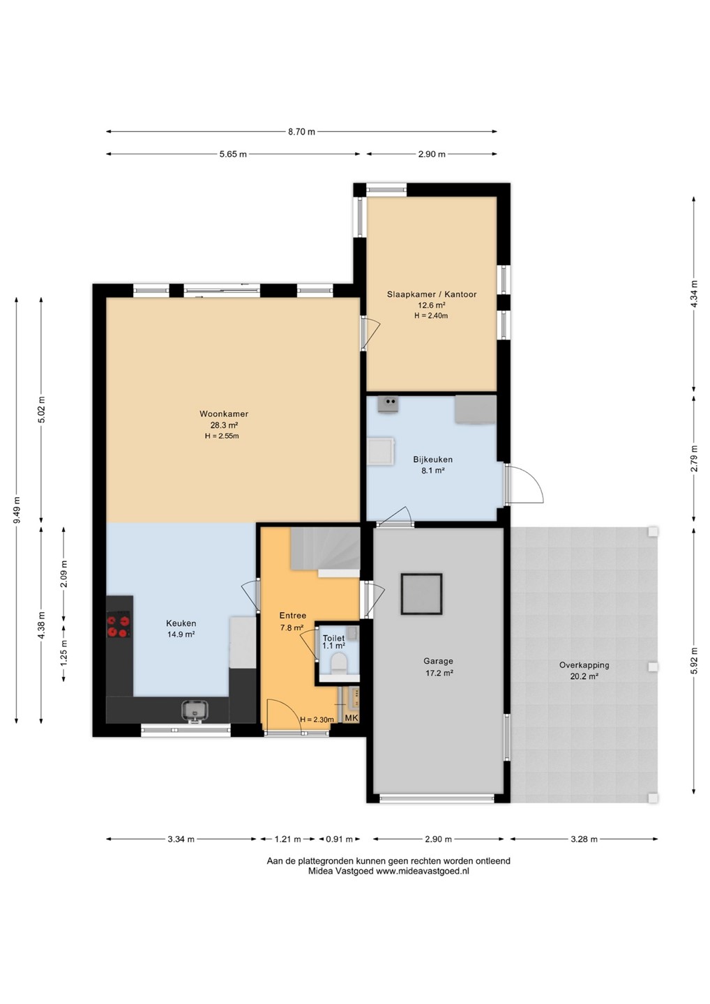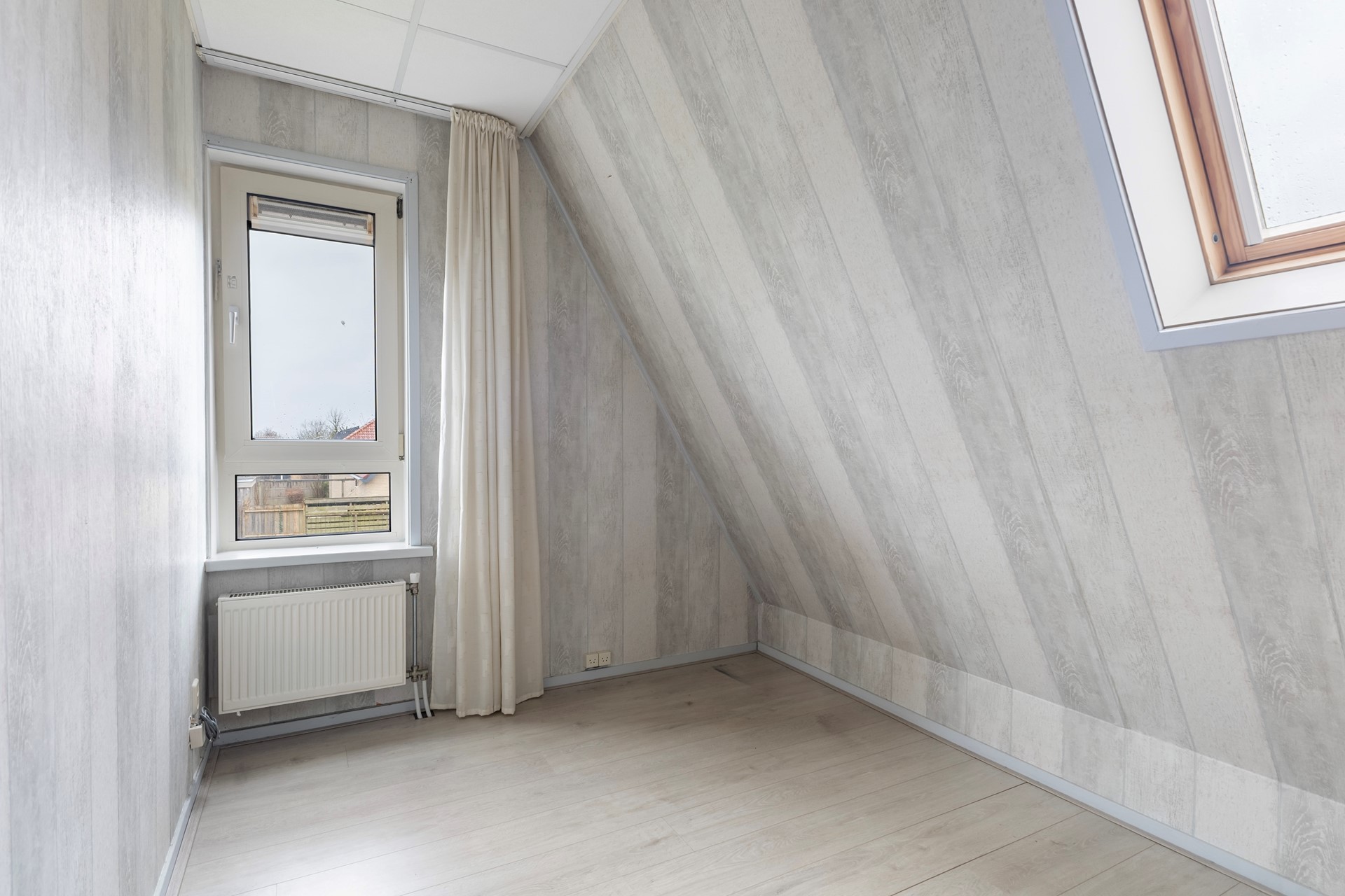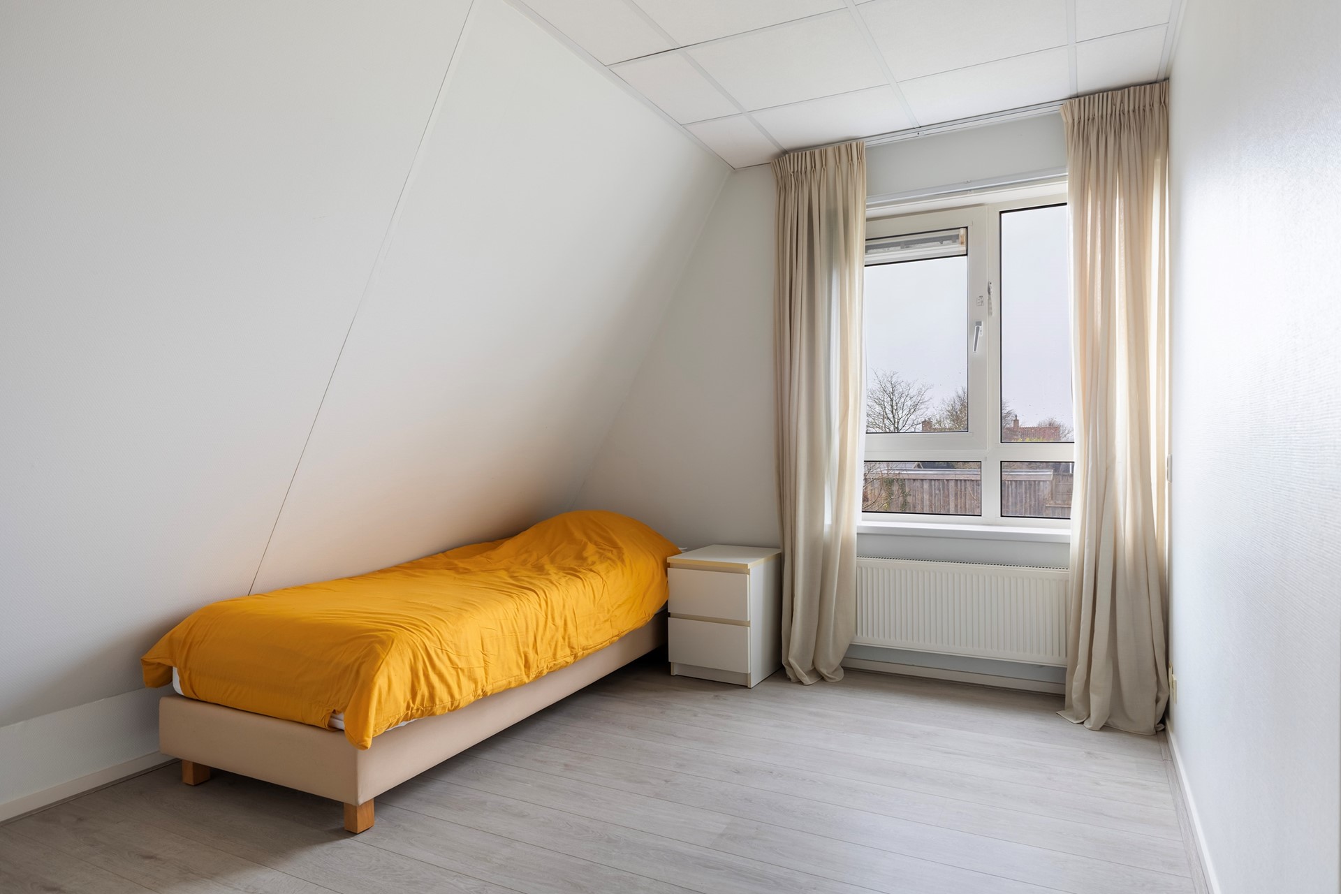 Je komt binnen via de de entree met meterkast, toilet en trapopgang. Vanuit hier stap je de lichte woonkamer in van ca. 28 m². Dankzij de grote raampartijen is dit een prettige, lichte leefruimte. De tuindeur zorgt voor direct contact met buiten: je loopt zo de achtertuin in! Vanuit de woonkamer is een extra kamer (ca. 12,6 m²) toegankelijk. Deze ruimte is perfect als werkruimte, kantoor aan huis, hobbykamer of speelruimte. Daarnaast biedt deze indeling ook een mooie kans voor bijvoorbeeld levensloopbestendig wonen: de bijkeuken kan relatief eenvoudig worden omgebouwd tot badkamer, waardoor gelijkvloers wonen mogelijk wordt.