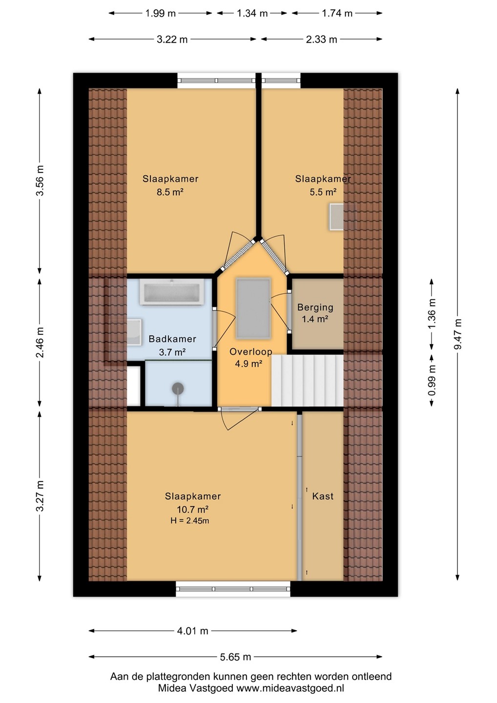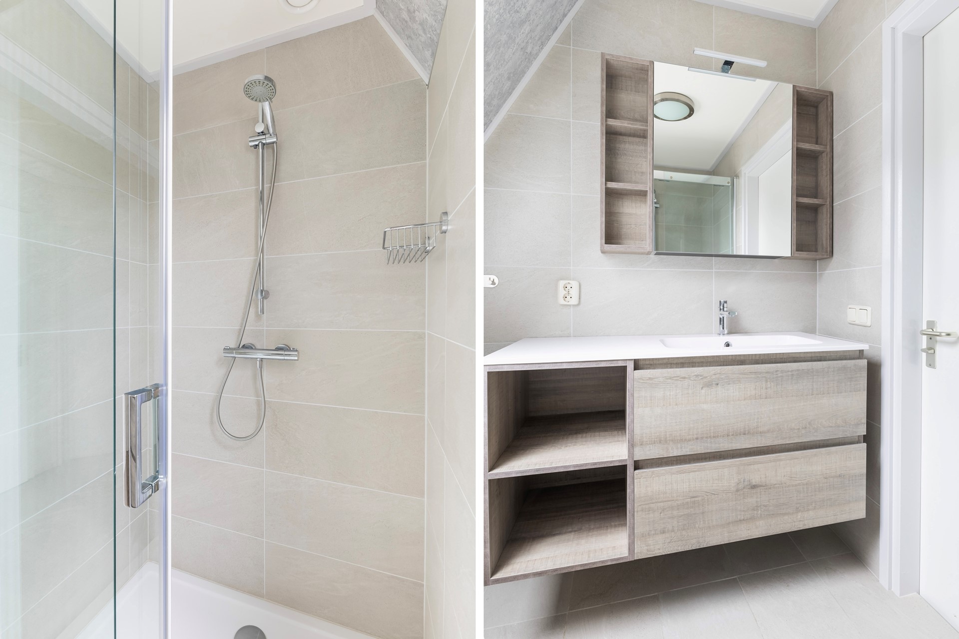 Op de verdieping kom je op de overloop met toegang tot drie slaapkamers (ca. 10,7 m², 8,5 m² en 5,5 m²), de badkamer (ca. 3,7 m²) en een separate berging. De badkamer is modern en stijlvol afgewerkt in neutrale, tijdloze kleurstellingen. De ruimte is praktisch ingedeeld en voorzien van een ruime inloopdouche, een wandcloset en een fraai wastafelmeubel. Dankzij het dakraam valt er prettig daglicht naar binnen. Daarnaast is er slimme nisruimte gecreëerd voor extra opberggemak.