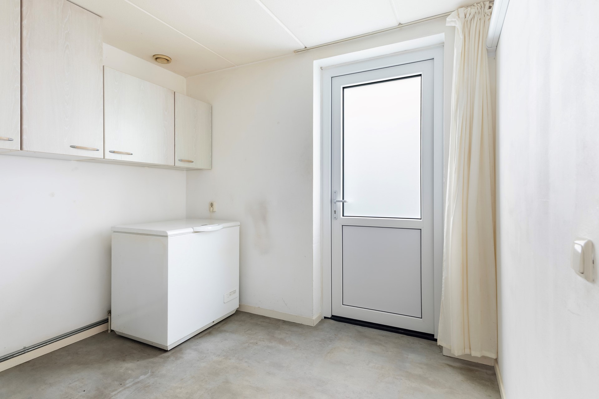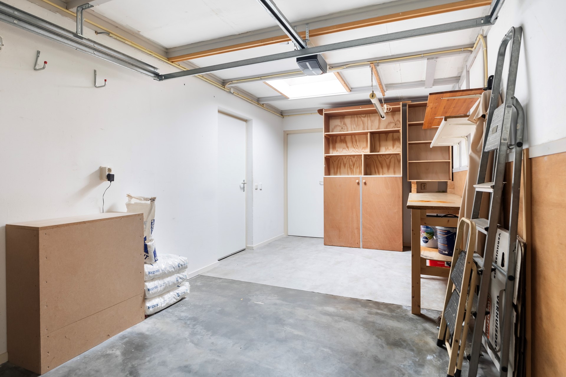 Vanuit de hal bereik je de garage (ca. 17 m²) voorzien van een elektrisch bedienbare sectionaaldeur en van daaruit de bijkeuken (ca. 8 m²) met extra aansluitingen en toegang naar buiten.
