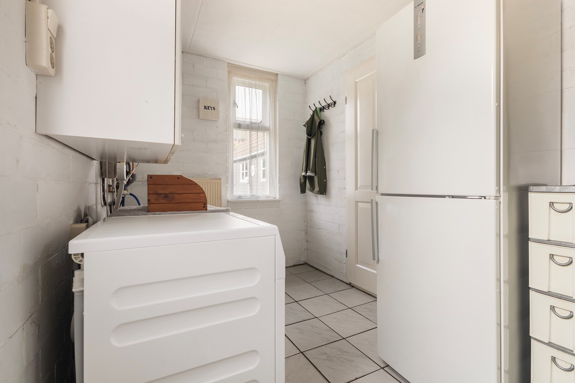 De half-open keuken ligt aan de achterzijde en is praktisch ingericht met diverse inbouwapparatuur. Via de keuken heb je toegang tot de bijkeuken, waar plaats is voor witgoedopstelling en extra voorraad.