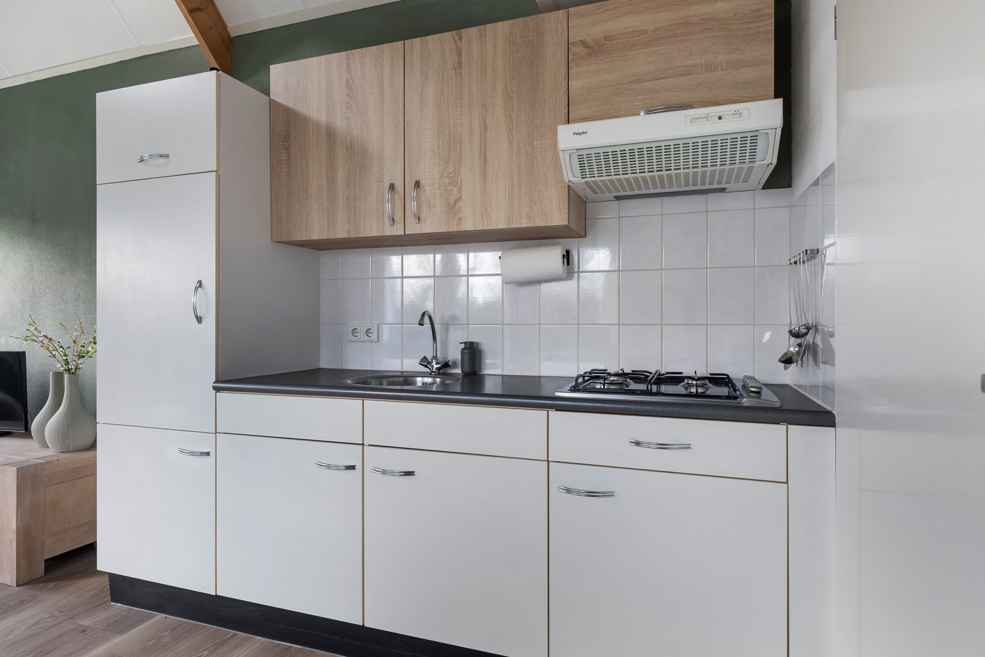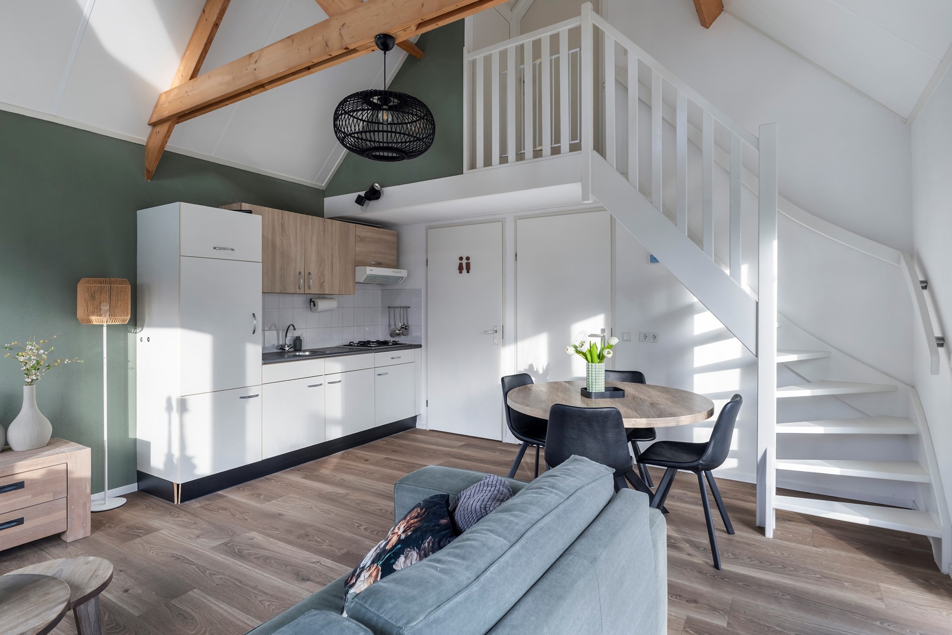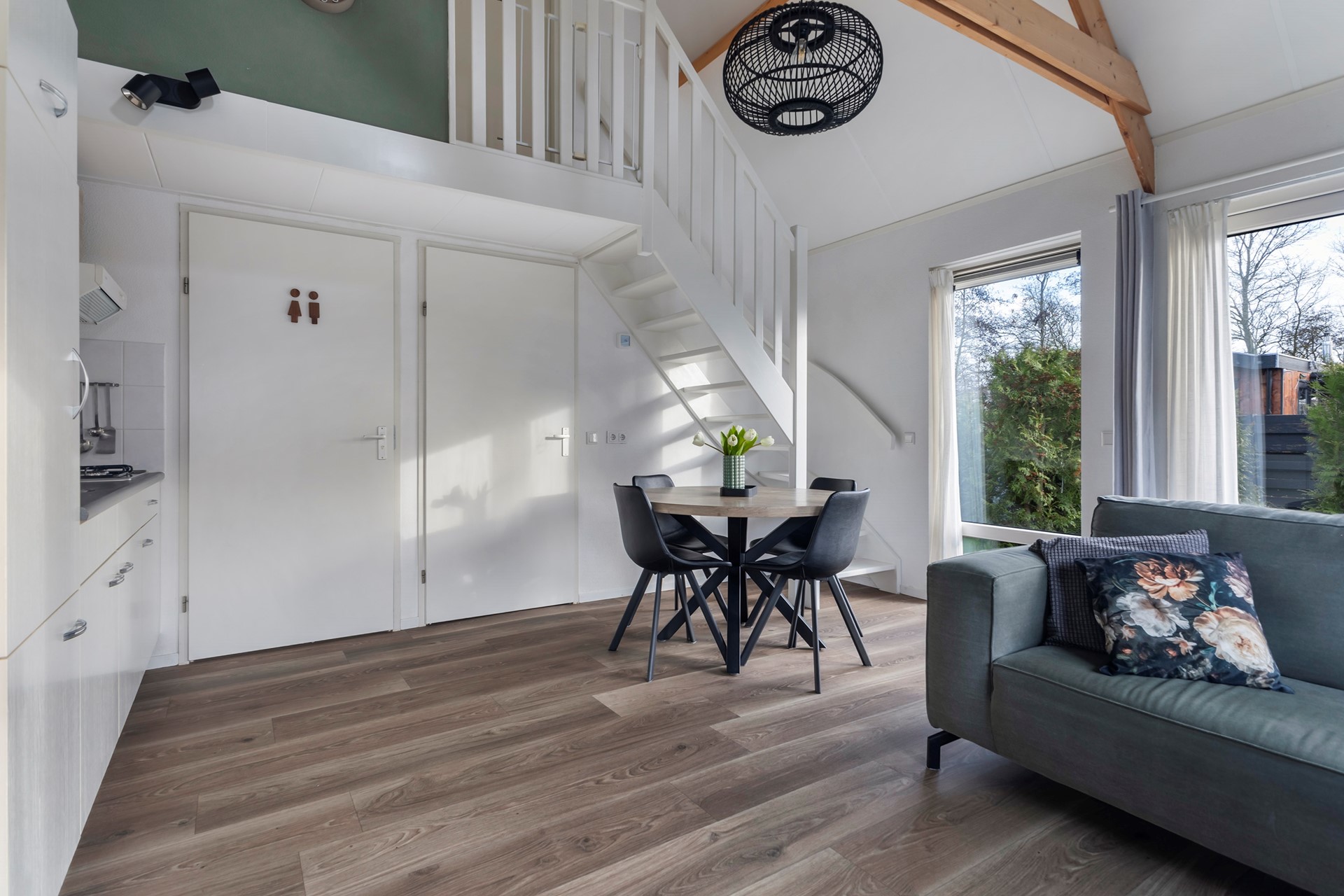 Binnen stap je in een lichte en verrassend ruime leefruimte met een fijne hoogte en zichtbare houten spanten. De woonkamer is sfeervol ingericht en staat in open verbinding met de eethoek en keuken. Dankzij de grote ramen en openslaande deuren naar buiten haal je het groen letterlijk naar binnen. Een heerlijke plek om samen te zijn, of juist even helemaal niets te hoeven. De keuken is praktisch ingedeeld en voorzien van alle basisgemakken. Of je nu snel iets klaarmaakt of uitgebreid kookt na een dag buiten: hier kan het allemaal. Op de begane grond bevindt zich een comfortabele 2-persoons slaapkamer en een nette badkamer met douche, wastafelmeubel en toilet. Via de open trap vanuit de woonkamer bereik je de verdieping met overloop en nog een slaapruimte met twee slaapplekken, ideaal voor (klein)gezinnen of logees. Alles is netjes afgewerkt en direct te gebruiken.