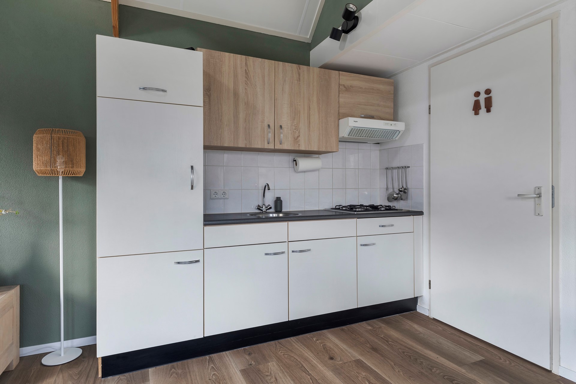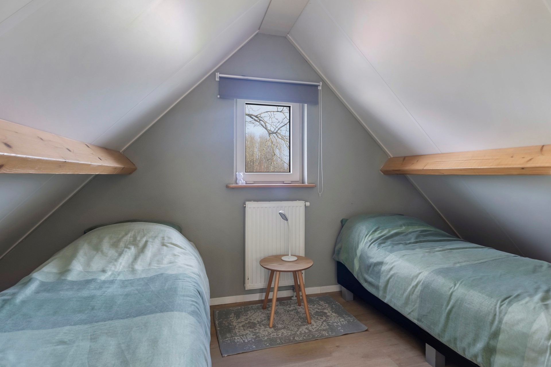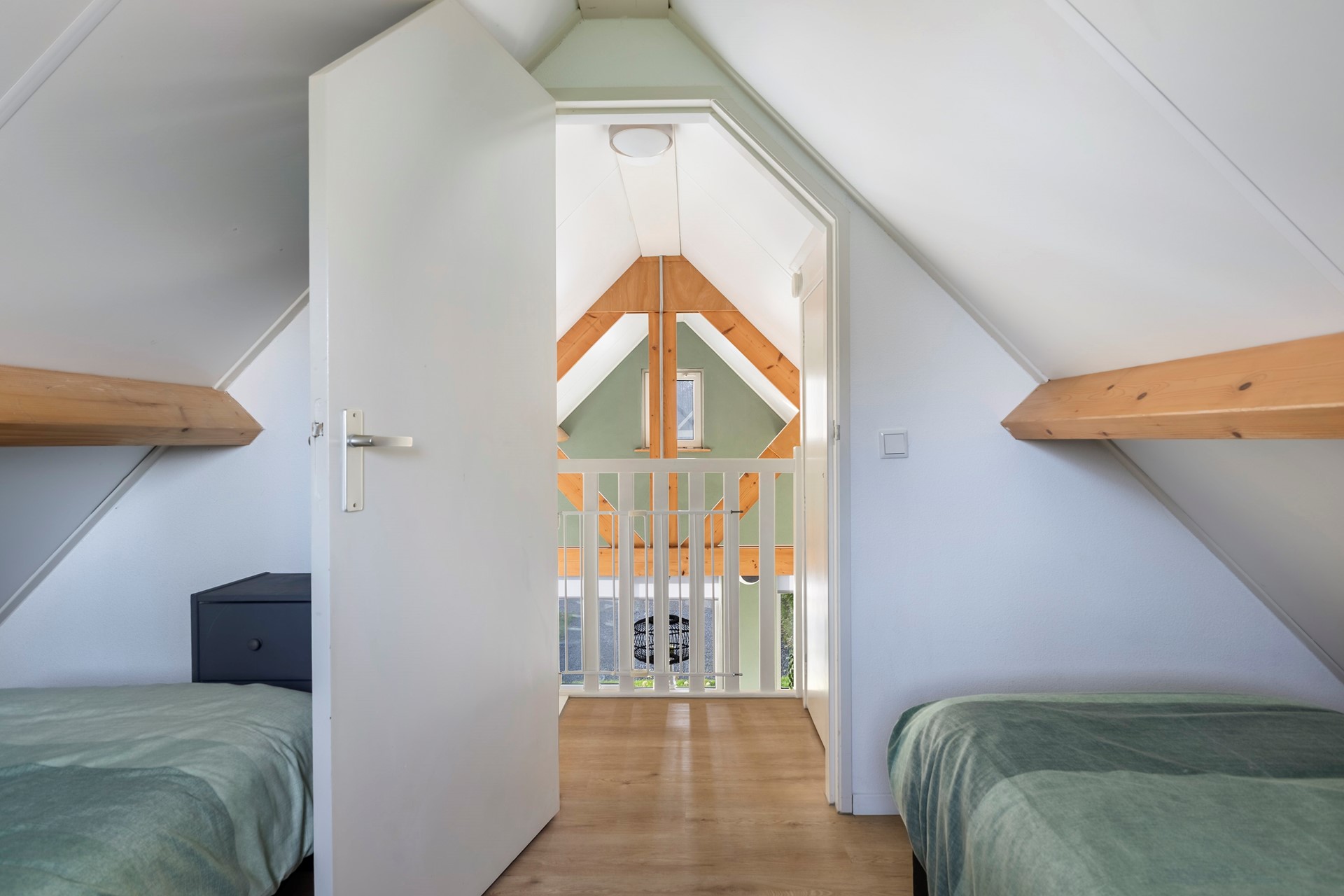 Binnen stap je in een lichte en verrassend ruime leefruimte met een fijne hoogte en zichtbare houten spanten. De woonkamer is sfeervol ingericht en staat in open verbinding met de eethoek en keuken. Dankzij de grote ramen en openslaande deuren naar buiten haal je het groen letterlijk naar binnen. Een heerlijke plek om samen te zijn, of juist even helemaal niets te hoeven. De keuken is praktisch ingedeeld en voorzien van alle basisgemakken. Of je nu snel iets klaarmaakt of uitgebreid kookt na een dag buiten: hier kan het allemaal. Op de begane grond bevindt zich een comfortabele 2-persoons slaapkamer en een nette badkamer met douche, wastafelmeubel en toilet. Via de open trap vanuit de woonkamer bereik je de verdieping met overloop en nog een slaapruimte met twee slaapplekken, ideaal voor (klein)gezinnen of logees. Alles is netjes afgewerkt en direct te gebruiken.