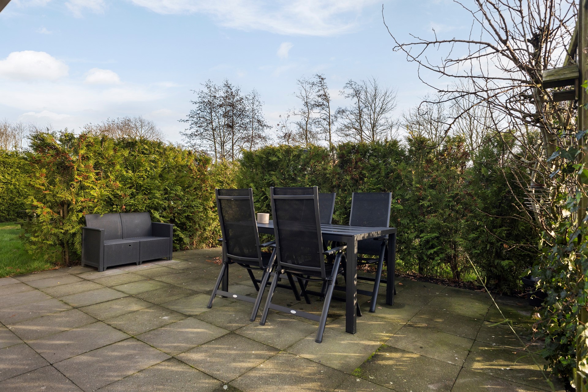 De tuin rondom de woning is groen, verzorgd en biedt volop privacy. Er zijn meerdere plekjes om te zitten, zowel in de zon als in de schaduw. Daarnaast is er een houten berging, handig voor fietsen, tuinmeubilair of recreatiespullen. Parkeren kan op eigen terrein, direct bij de woning.