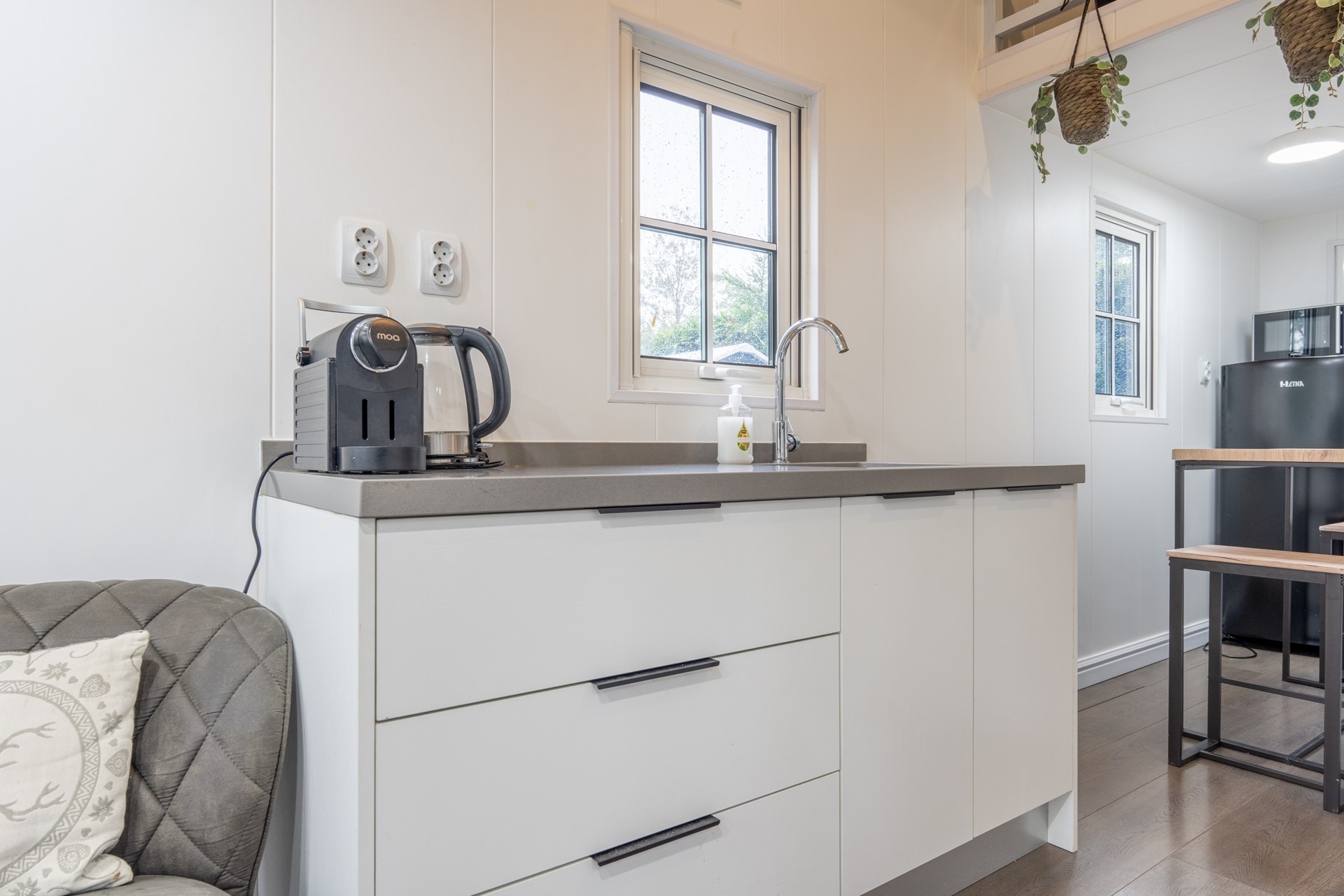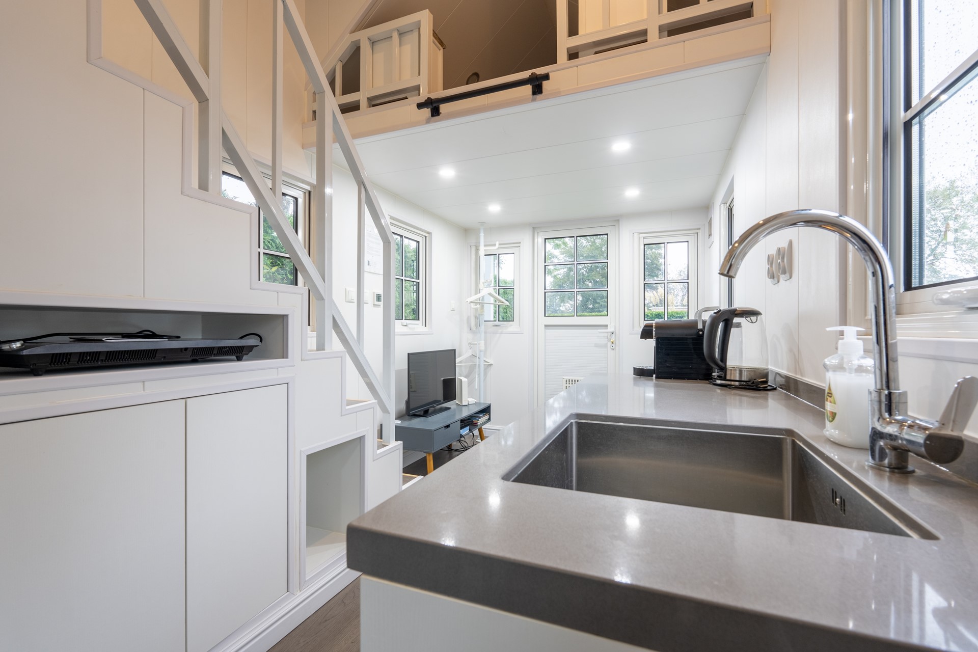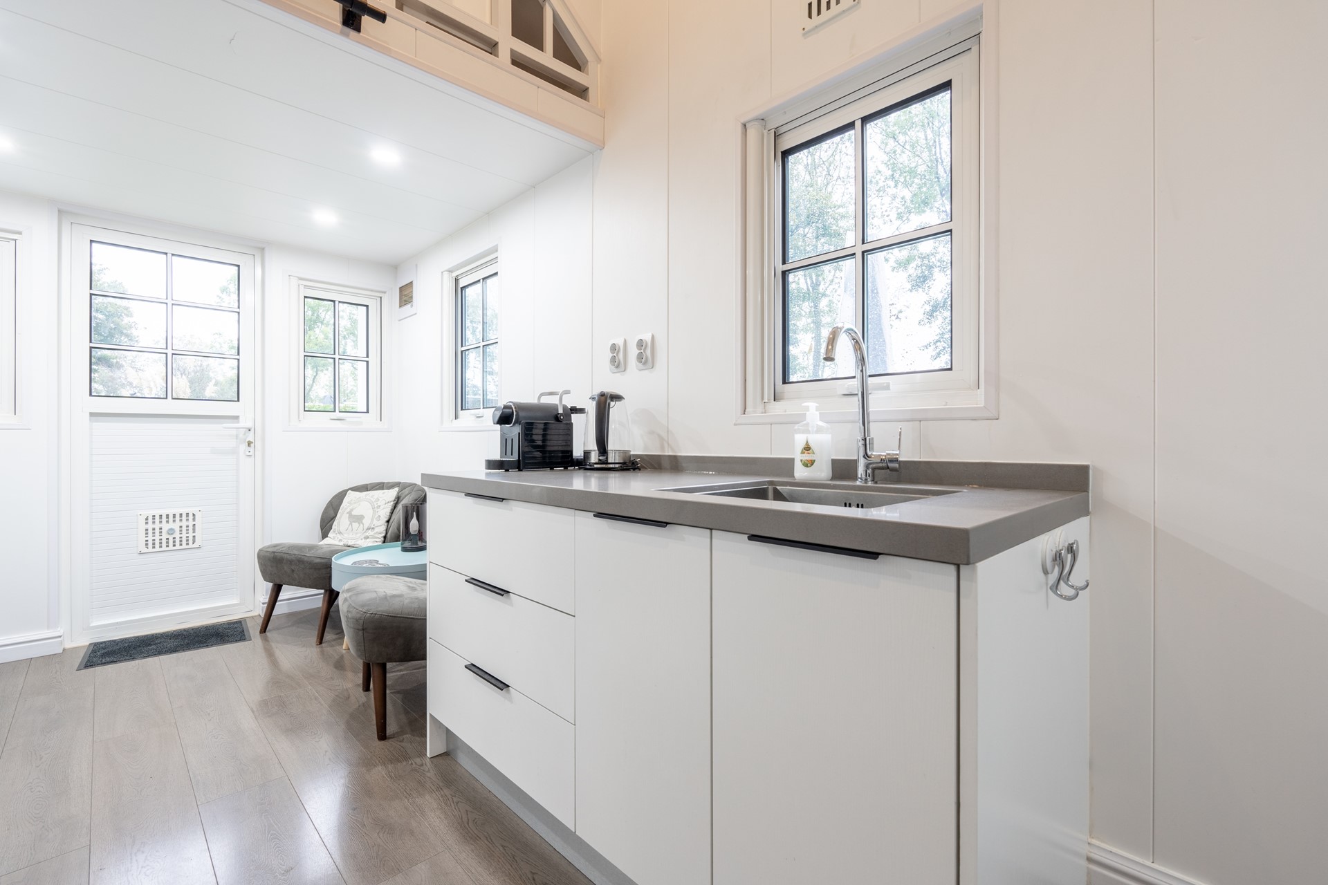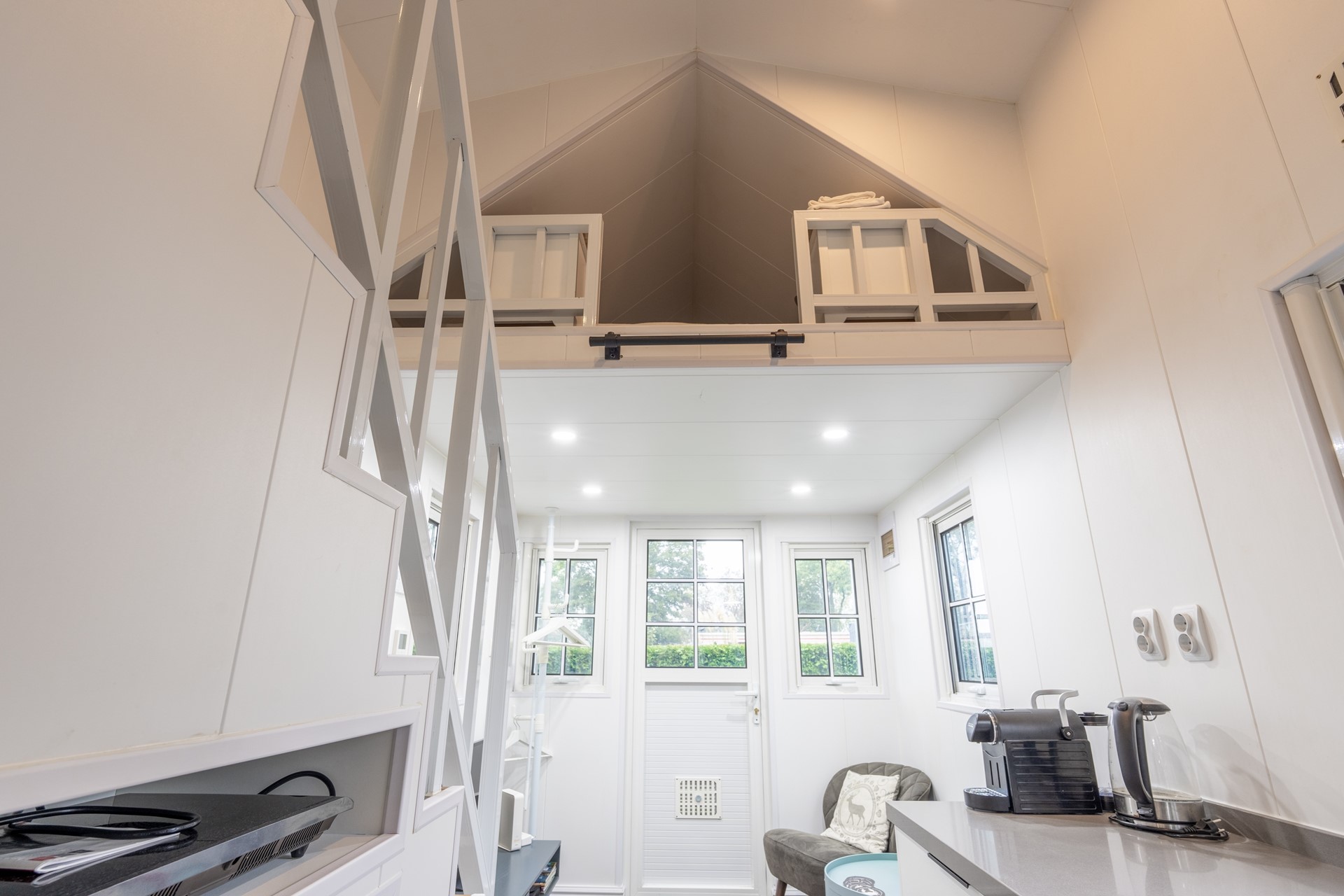 Dit gezellige Tiny House verwelkomt je met een lichte woonkamer en open keuken, waardoor de ruimte optimaal wordt benut. Met overvloedig natuurlijk licht en een doordachte indeling voelt de woonruimte uitnodigend aan. Een subtiele trapopgang leidt naar de knusse slaapruimte voor twee personen. De andere slaapruimte kan bereikt worden middels een vaste ladder. Tevens is er een separate badkamer met toilet. De efficiënte indeling maakt dit vakantieverblijf op de Friese Wadden tot een comfortabele en praktische plek om te ontspannen. De woning is voorzien van kunststof kozijnen en gedeeltelijk van vloerverwarming. Cv-installatie (Vaillant, 2021) is gesitueerd in de woonkamer.