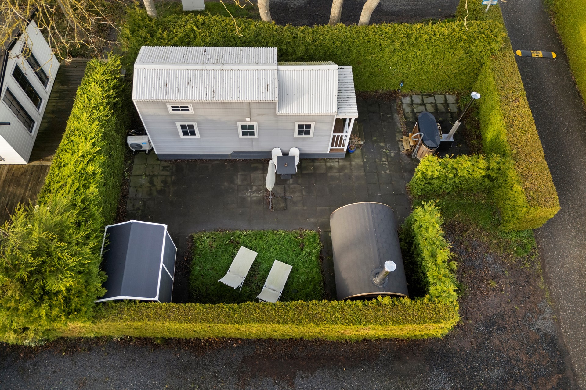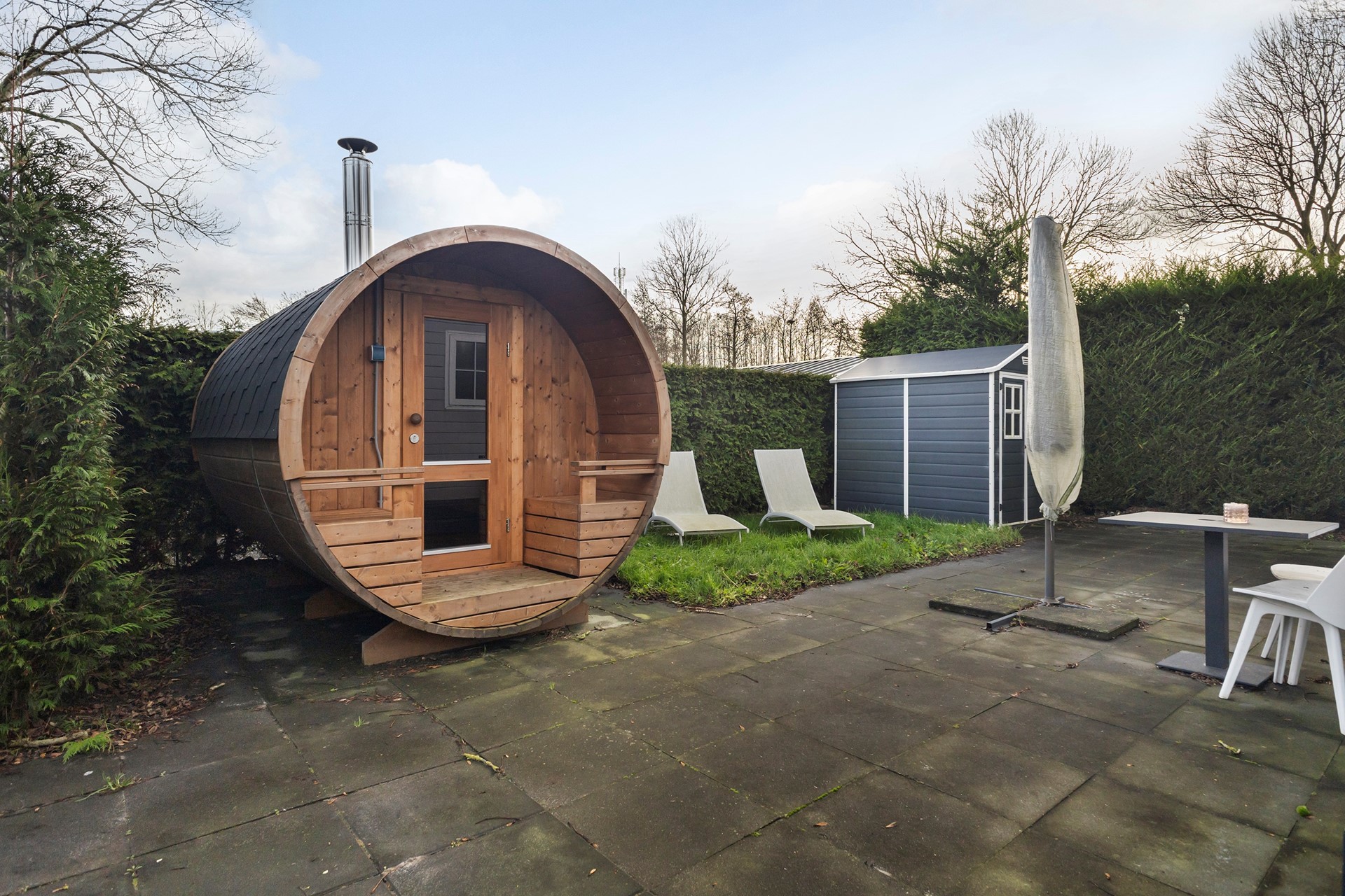De tuin is een heerlijke plek om écht tot rust te komen. Rondom de woning ligt een strak aangelegde, volledig omsloten tuin met veel privacy, omgeven door groene hagen. Het ruime terras biedt volop plek voor een loungeset of eettafel en vormt een fijne verbinding tussen binnen en buiten. Wat deze tuin extra bijzonder maakt, zijn de wellnessvoorzieningen. Zo is er een houten barrelsauna waar je op elk moment van de dag kunt ontspannen, en een hottub voor lange avonden onder de sterren. Op het gazon liggen ligbedden klaar om in alle rust van de zon te genieten. Dankzij de beschutte ligging en de praktische indeling voelt de tuin als een privé buitenruimte, perfect passend bij het recreatieve karakter van de woning. Een plek waar ontspannen, comfort en vakantiegevoel samenkomen.