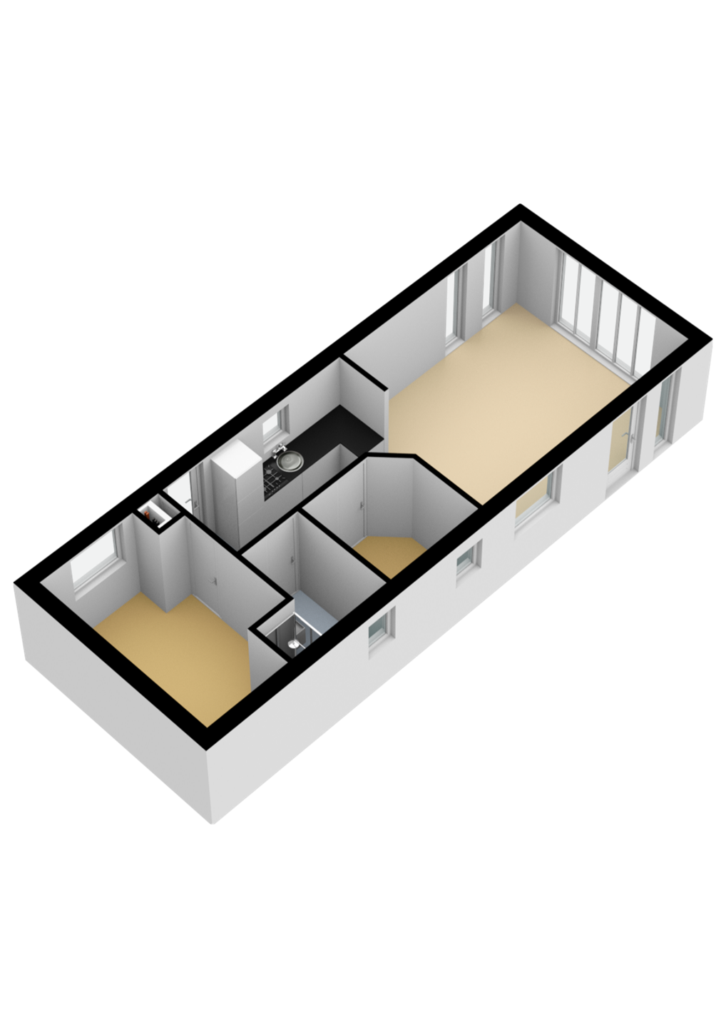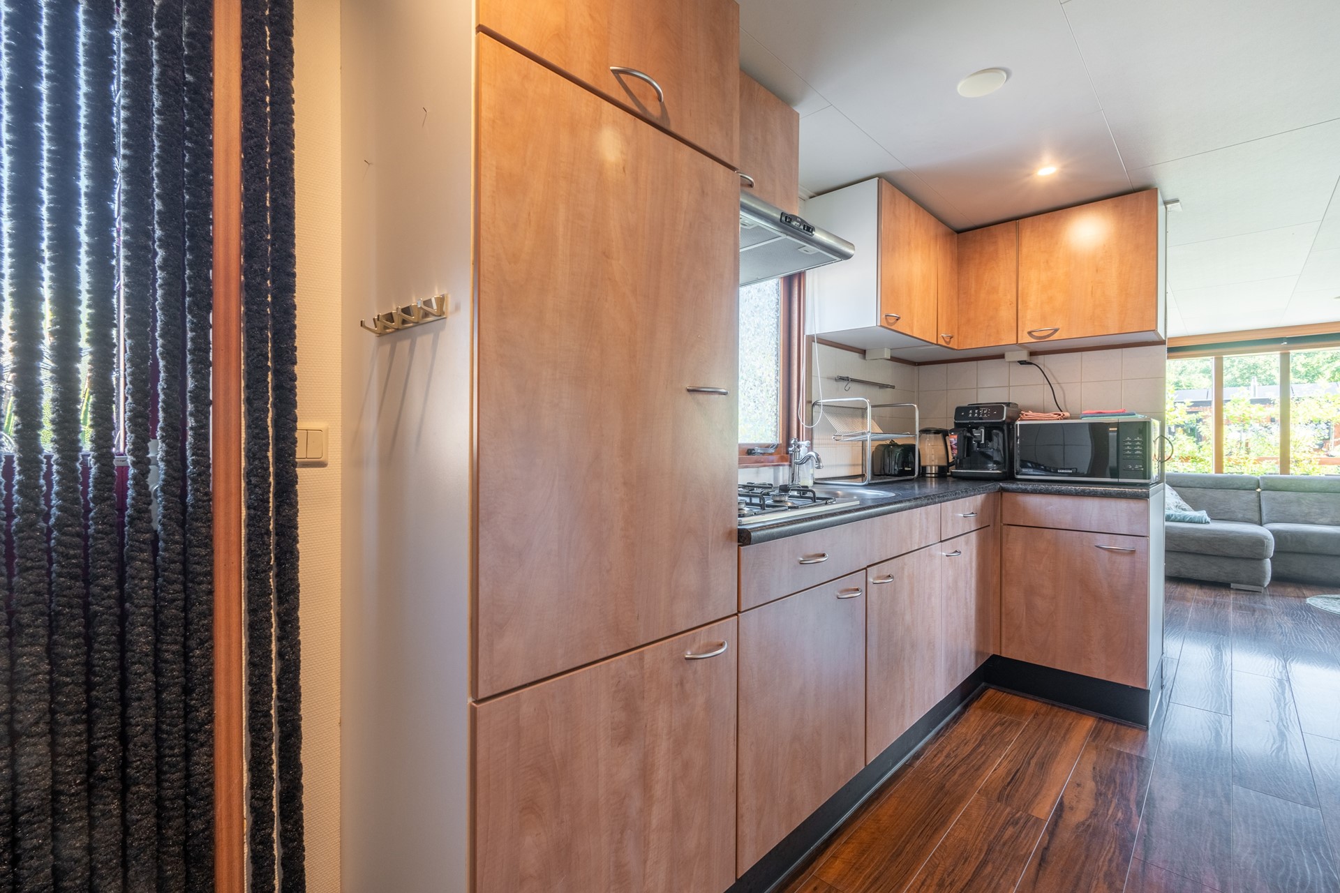 Entree in de woonkamer met open keuken. Hier geniet je van een goede lichtinval door de verschillende grote raampartijen. De woonkamer is voorzien van een pellet kachel en biedt ruimte voor een royale bank en eetopstelling. De open keuken is v.v. koelkast, 4-pits gasfornuis en afzuigkap. Vanuit de woonkamer/keuken heb je toegang tot twee fijne slaapkamers welke elk ruimte bieden voor 2 personen. De slaapkamers zijn compact, maar praktisch ingericht waardoor er voldoende ruimte is voor kasten. Ook de badkamer is efficiënt ingedeeld met toilet, wastafel en douche. De CV-installatie (Intergas, 2010) is netjes afgewerkt.