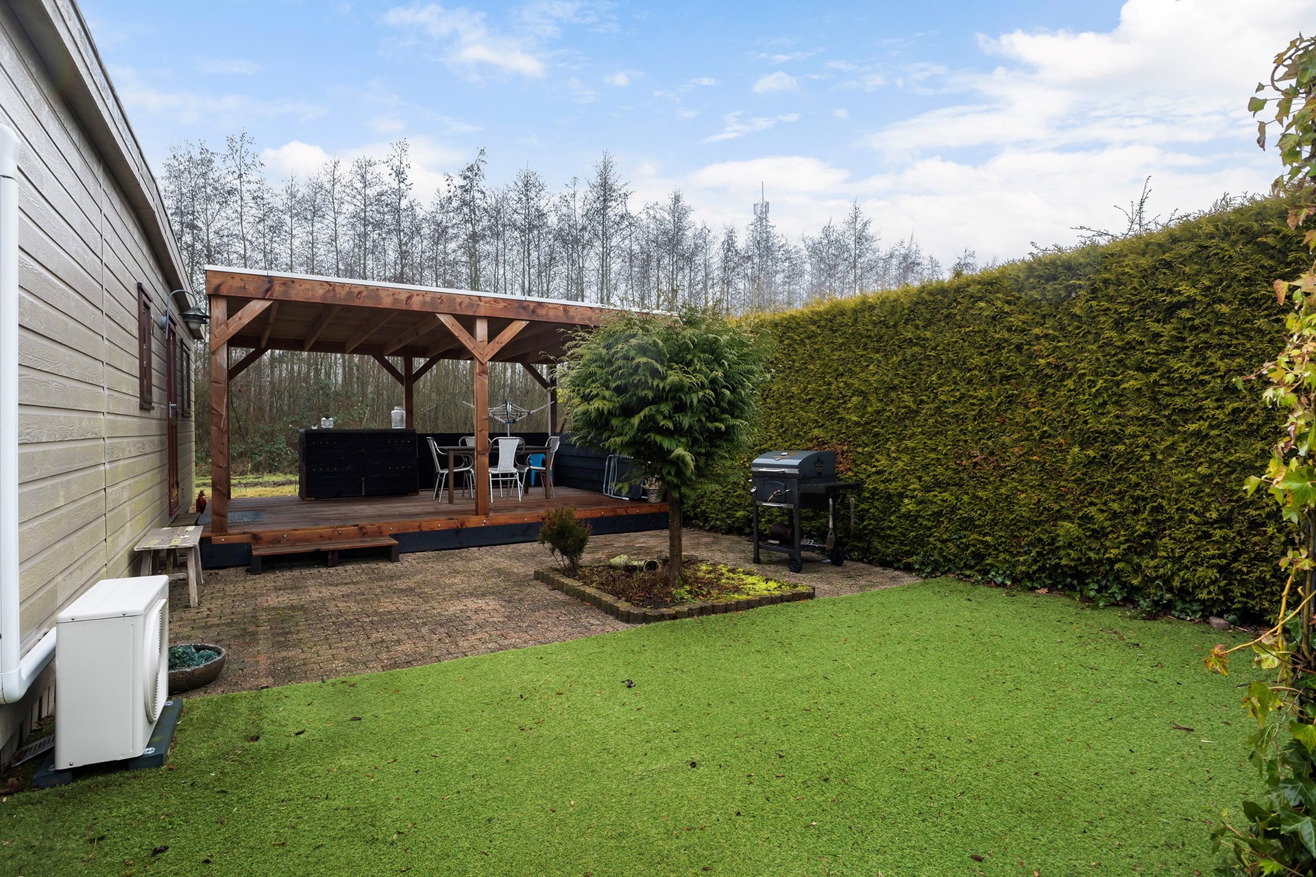 De tuin is verzorgd aangelegd en biedt volop privacy dankzij de dichte, groene hagen rondom. Direct achter de woning ligt een ruim terras met sierbestrating, gecombineerd met een strak stuk (kunst)gazon dat zorgt voor een onderhoudsvriendelijk geheel. Achterin de tuin staat een sfeervolle houten overkapping op een verhoogd vlonderterras. Hier kun je heerlijk beschut zitten – ideaal voor lange zomeravonden, een gezellige barbecue of gewoon een rustig kopje koffie in de ochtendzon. Er is voldoende ruimte voor een eettafel en loungehoek, waardoor binnen en buiten moeiteloos in elkaar overlopen.